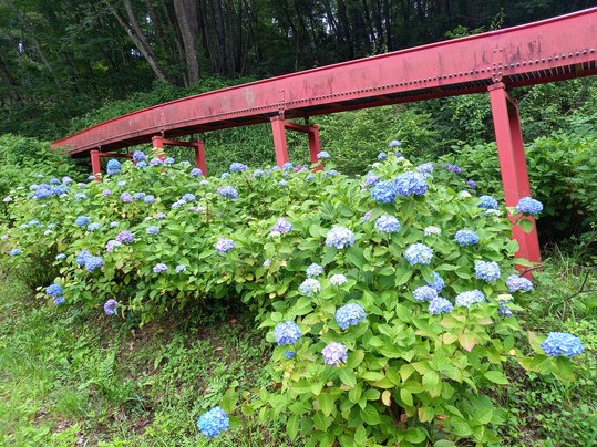 農村公園のあじさいが、一部見ごろを迎えています。滑り台の一部が写真のように多く咲いています。