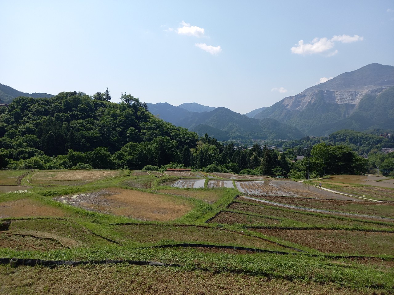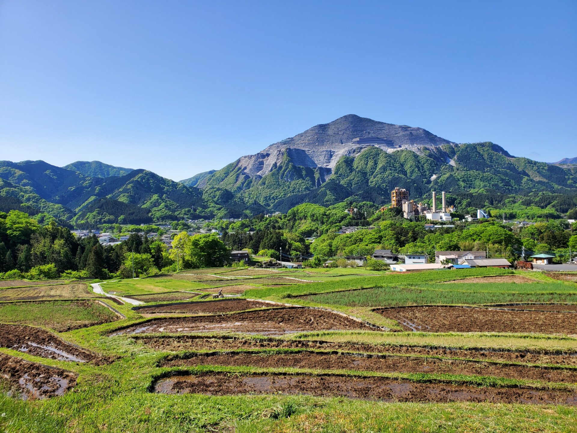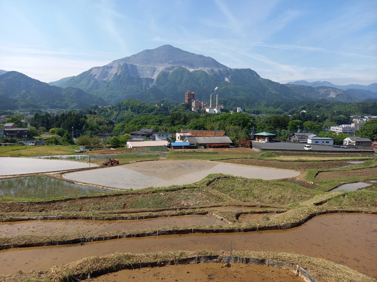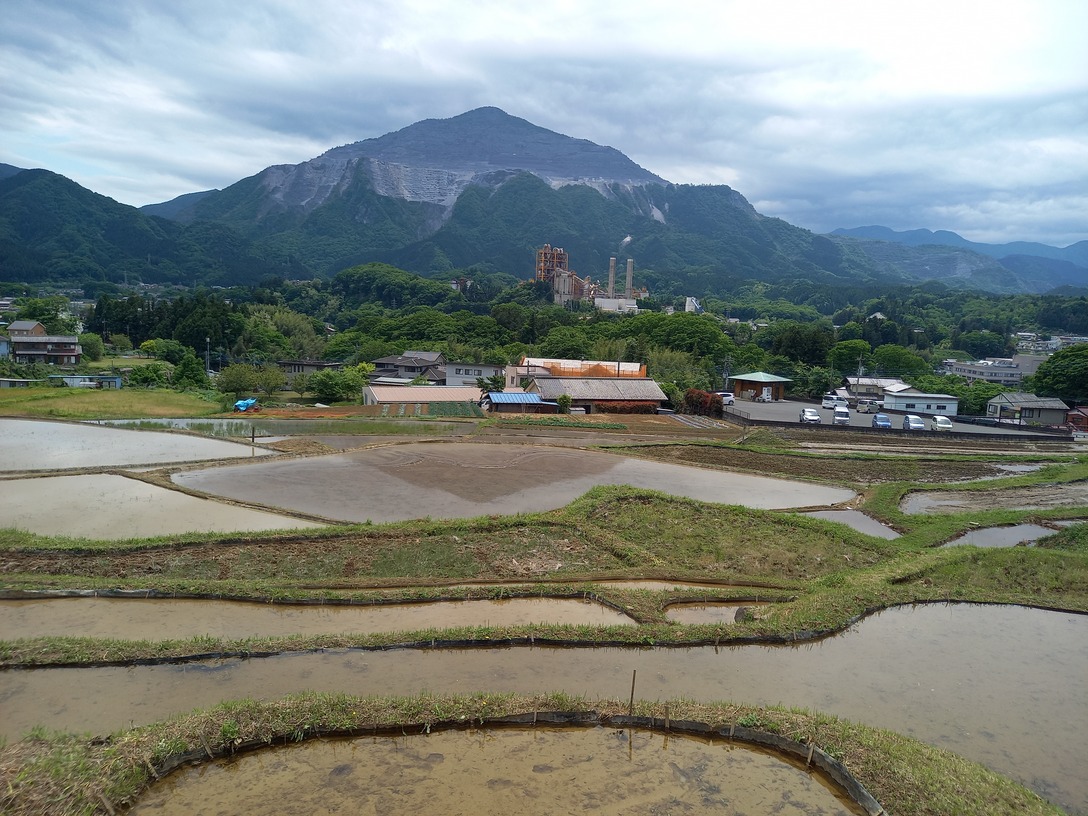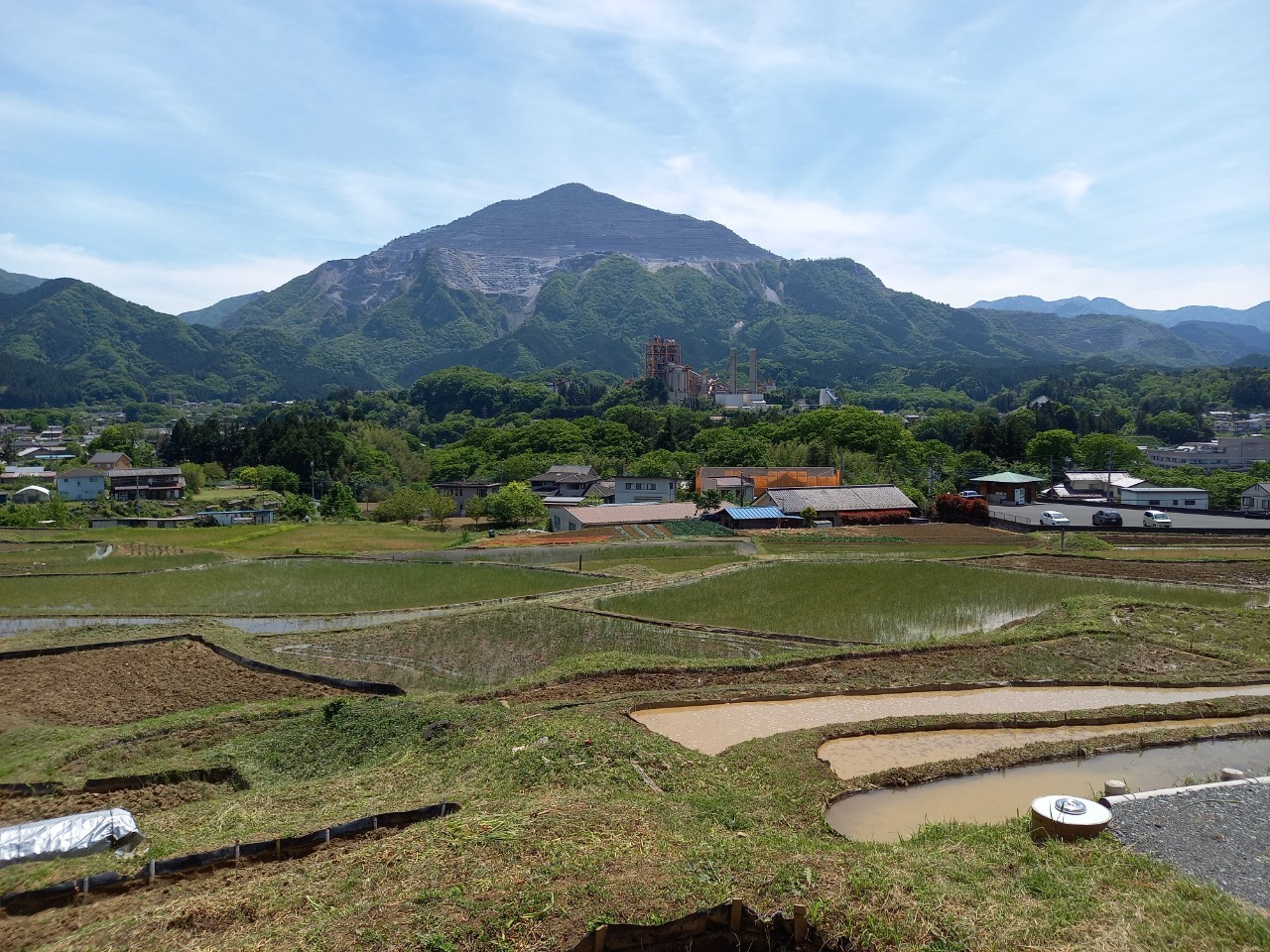 午後1時ごろの様子。晴れた日の寺坂棚田の記録写真です。水をいったん入れて土が泥状になった田がいくつもありました。水を入れたままの田は、今日現在、写真のように武甲山に近い側にございます。逆さ武甲山が見える状況にはございません。ですが田植えの準備をする棚田の様子、周辺の木々の緑の美しさ、鳥のさえずり。田を耕すと鳥が土の上で何かついばんでいる姿が、何とも愛らしく感じます。棚田の景色を見て、風に触れ、土のにおいを感じ、鳥のさえずり、水を入れた時の流れを聞く。今年も棚田で生命力を感じ取る季節が来ました。