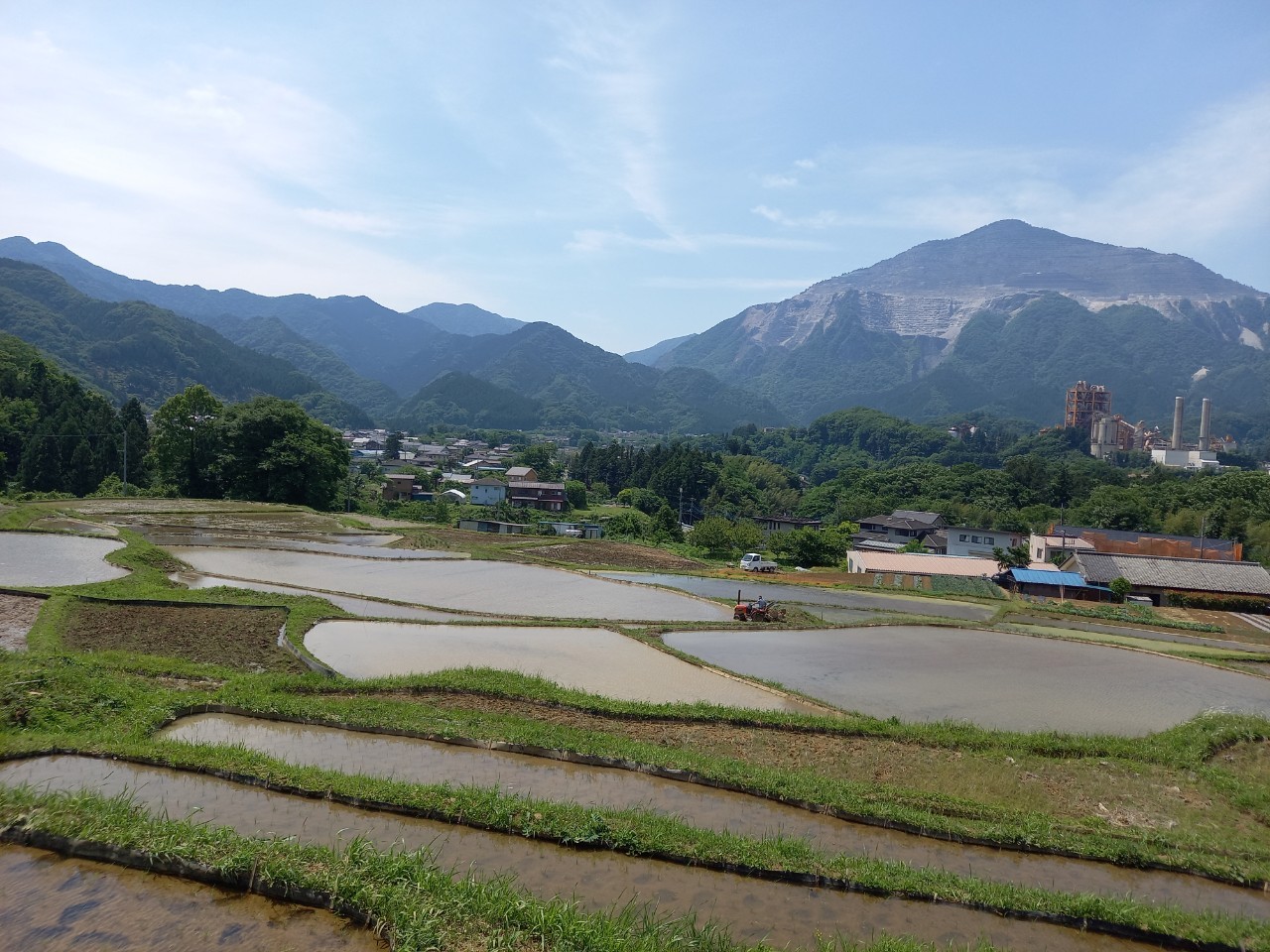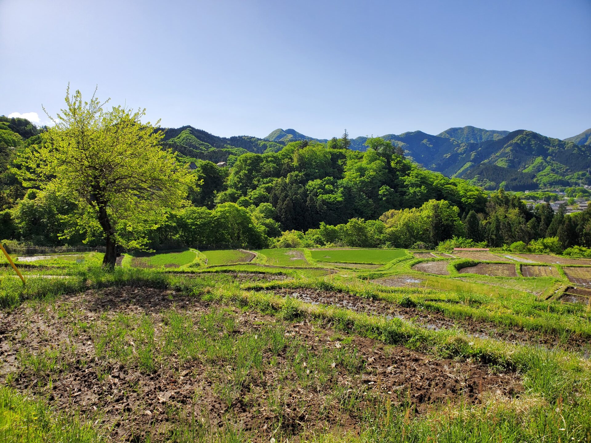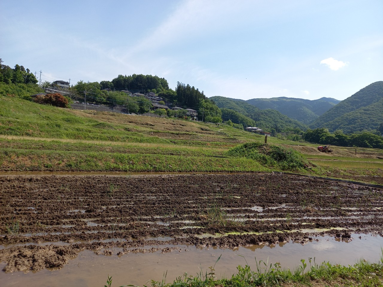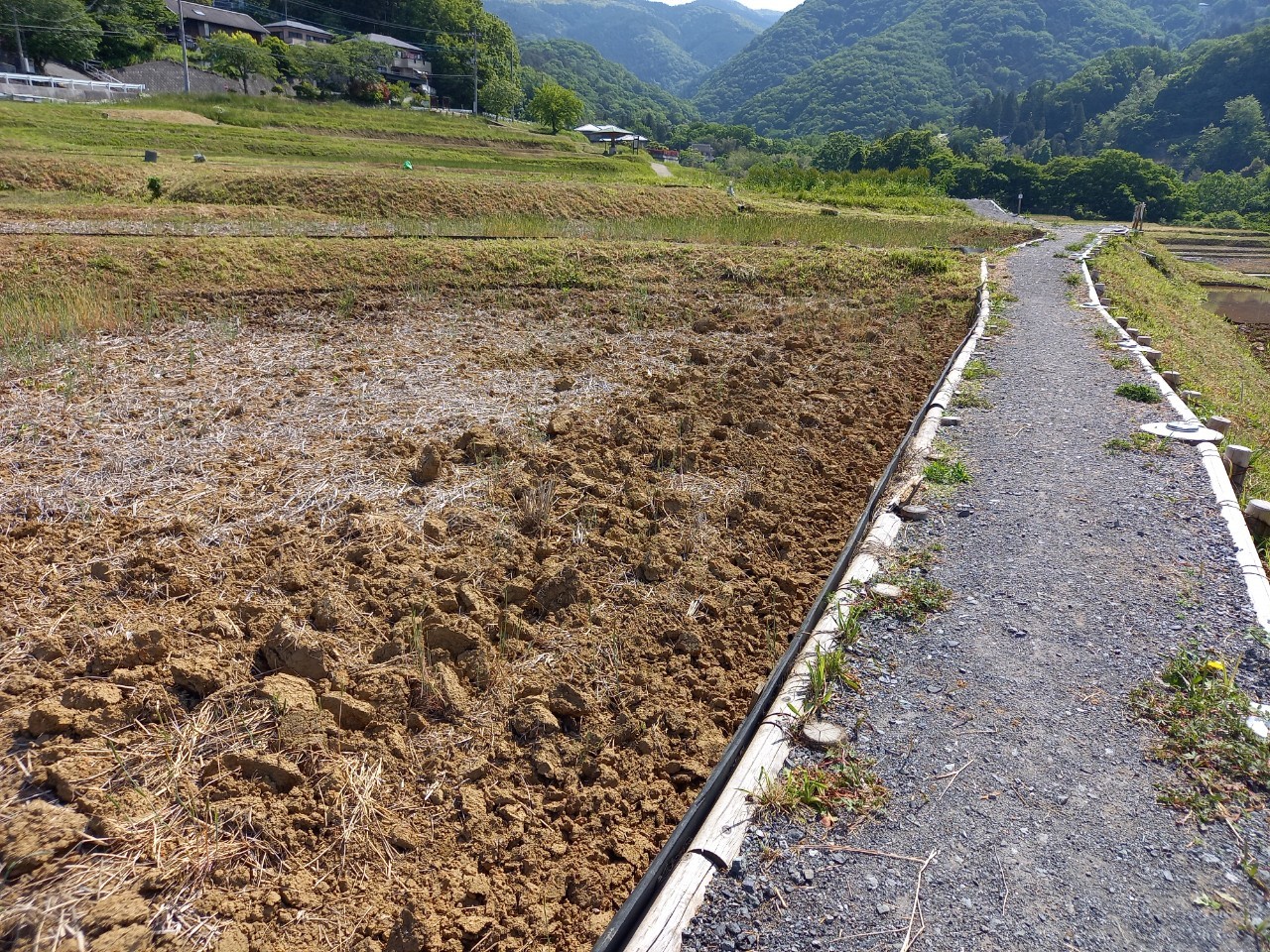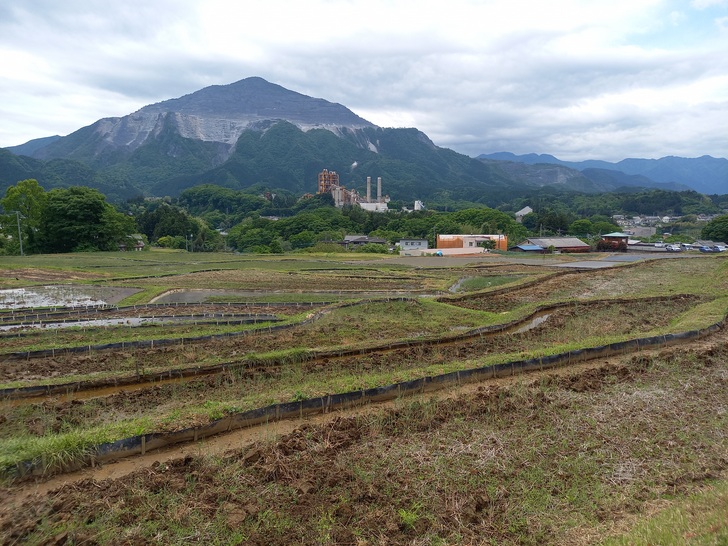 午後1時ごろの様子。晴れた日の寺坂棚田の記録写真です。水をいったん入れて土が泥状になった田がいくつもありました。水を入れたままの田は、今日現在、写真のように武甲山に近い側にございます。逆さ武甲山が見える状況にはございません。ですが田植えの準備をする棚田の様子、周辺の木々の緑の美しさ、鳥のさえずり。田を耕すと鳥が土の上で何かついばんでいる姿が、何とも愛らしく感じます。棚田の景色を見て、風に触れ、土のにおいを感じ、鳥のさえずり、水を入れた時の流れを聞く。今年も棚田で生命力を感じ取る季節が来ました。
