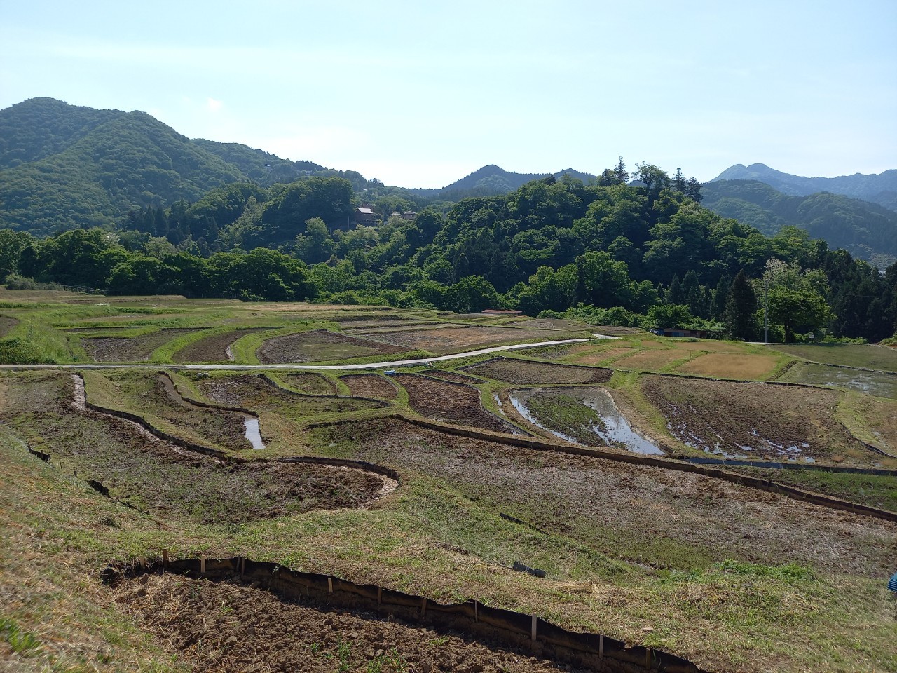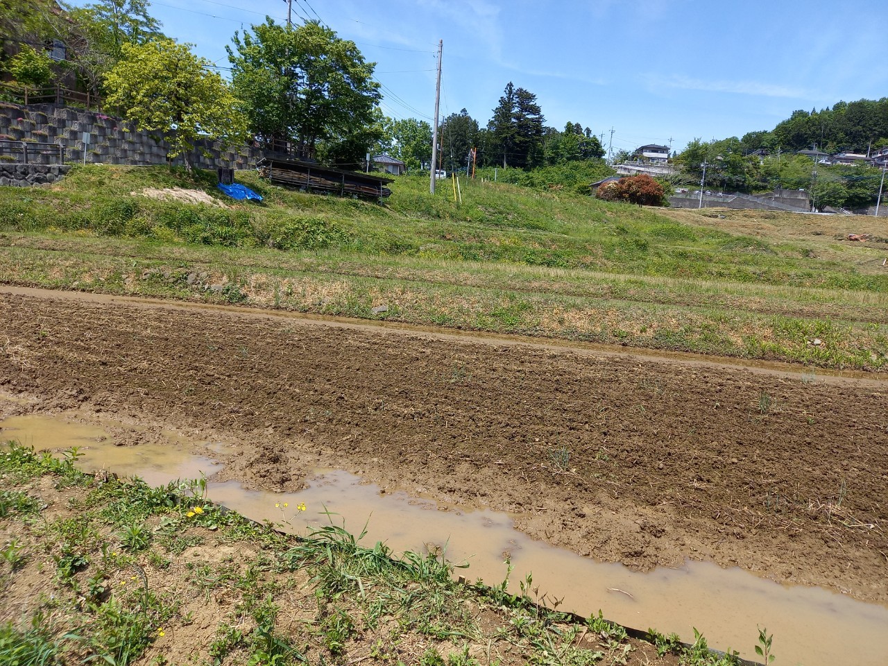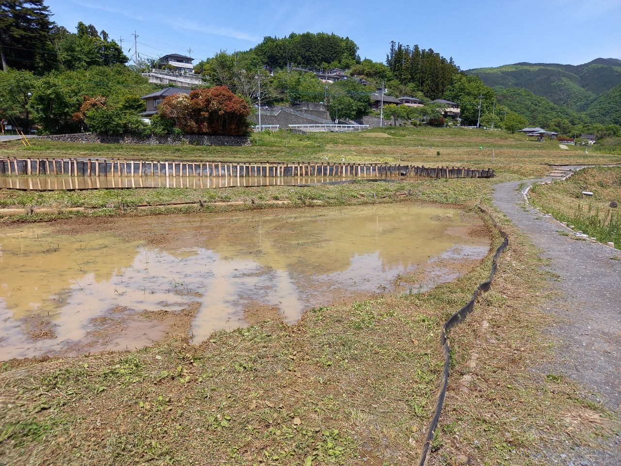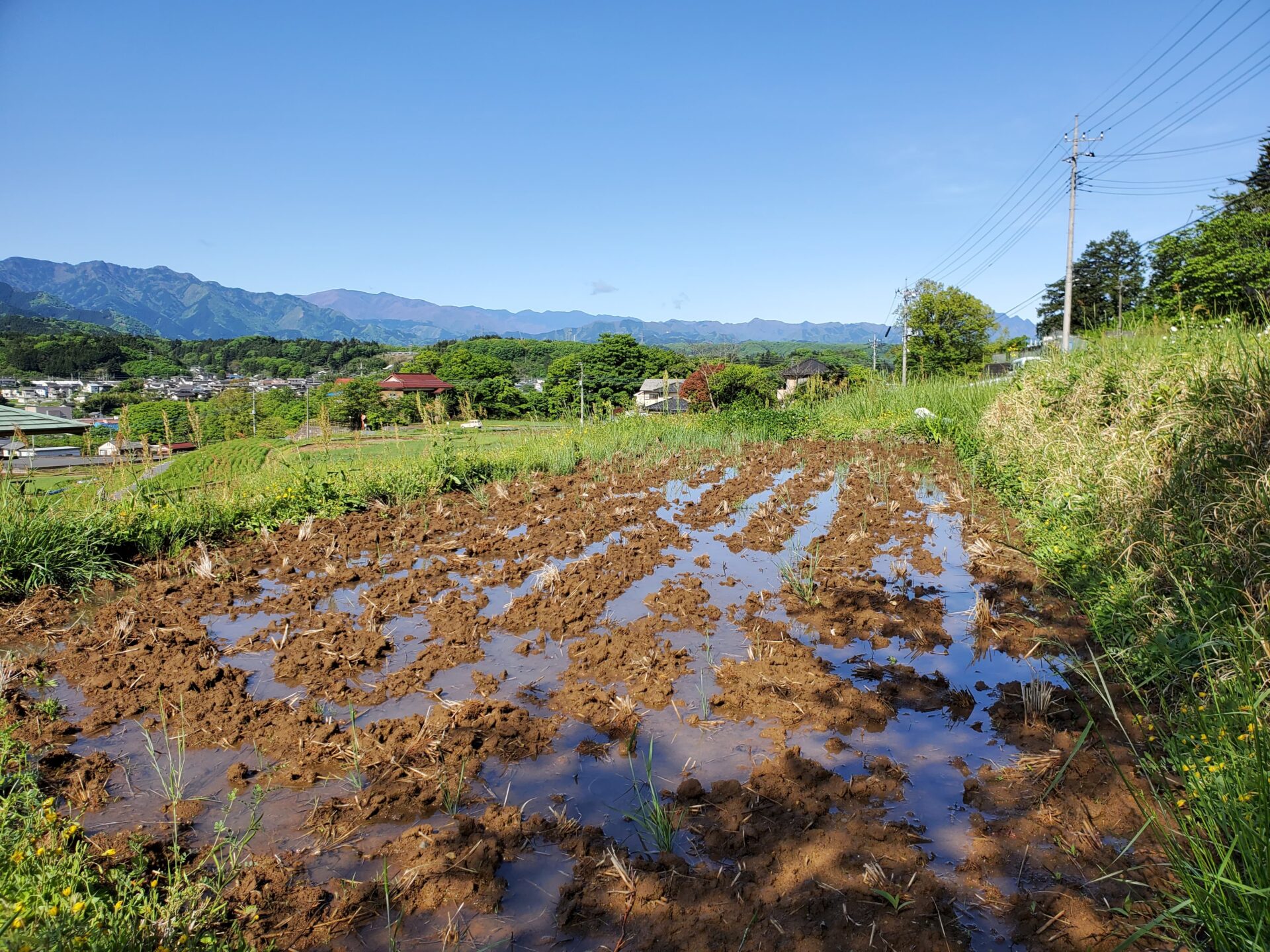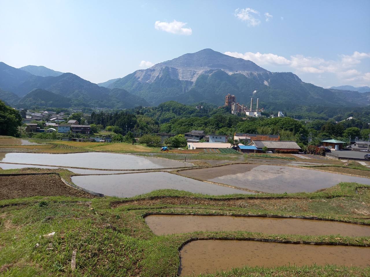 午後1時ごろの様子。晴れた日の寺坂棚田の記録写真です。水をいったん入れて土が泥状になった田がいくつもありました。水を入れたままの田は、今日現在、写真のように武甲山に近い側にございます。逆さ武甲山が見える状況にはございません。ですが田植えの準備をする棚田の様子、周辺の木々の緑の美しさ、鳥のさえずり。田を耕すと鳥が土の上で何かついばんでいる姿が、何とも愛らしく感じます。棚田の景色を見て、風に触れ、土のにおいを感じ、鳥のさえずり、水を入れた時の流れを聞く。今年も棚田で生命力を感じ取る季節が来ました。