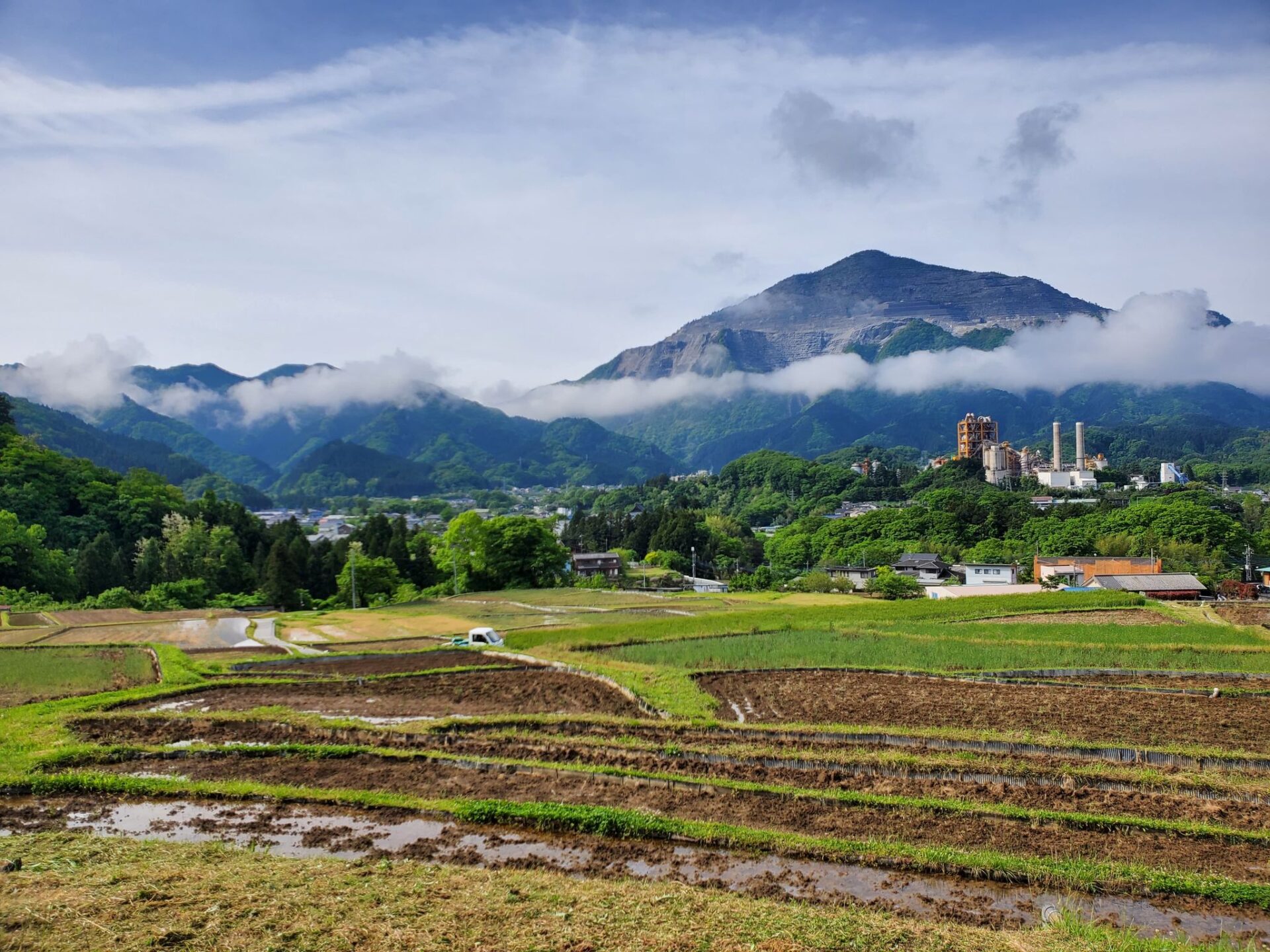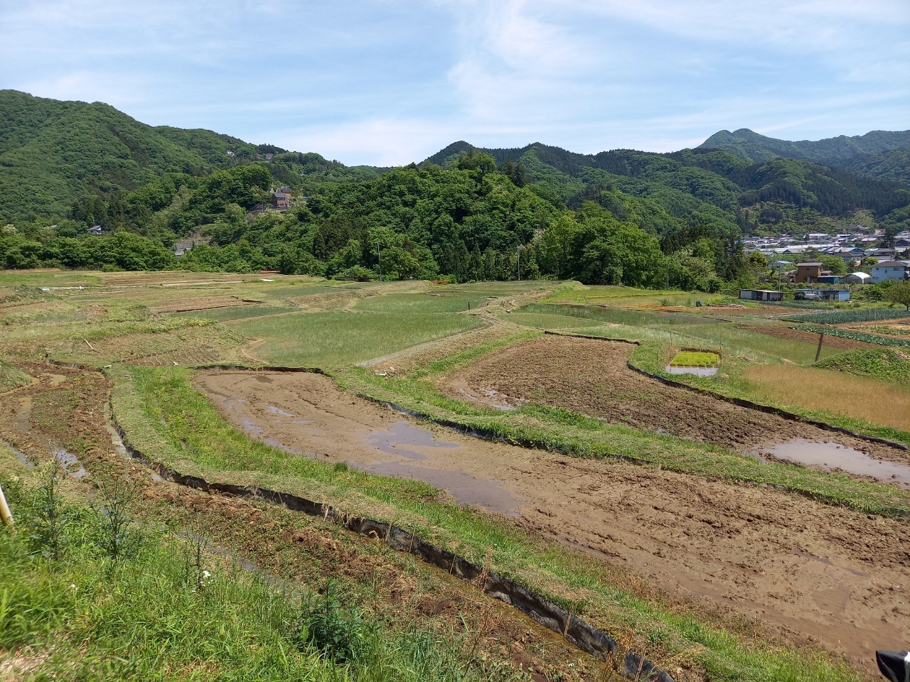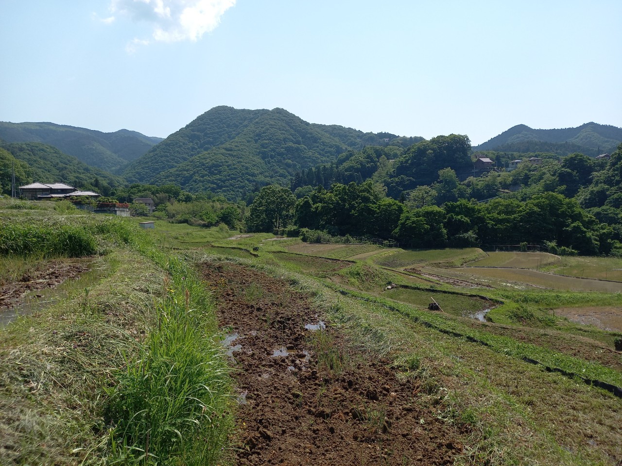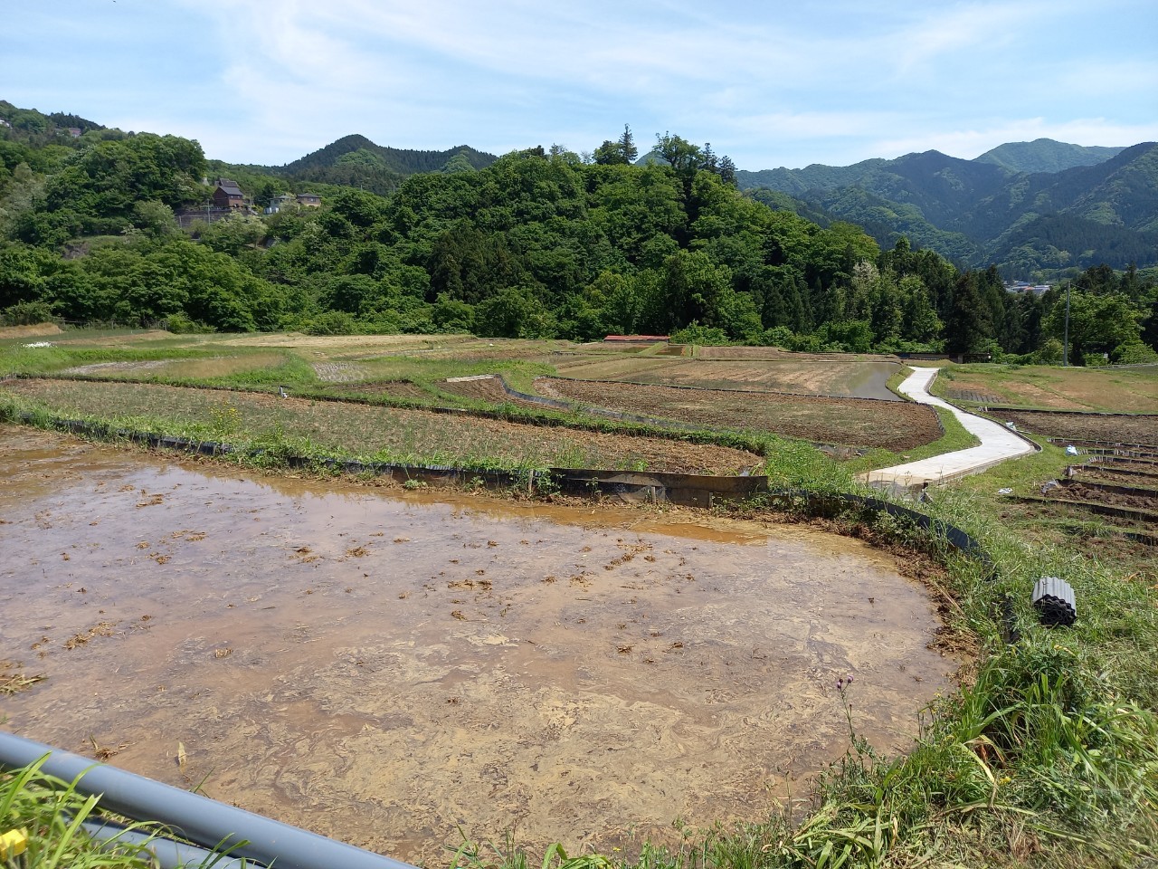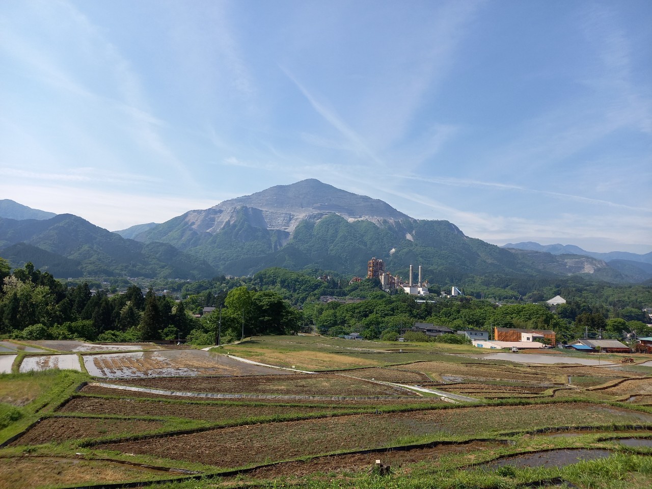 午後1時ごろの様子。晴れた日の寺坂棚田の記録写真です。水をいったん入れて土が泥状になった田がいくつもありました。水を入れたままの田は、今日現在、写真のように武甲山に近い側にございます。逆さ武甲山が見える状況にはございません。ですが田植えの準備をする棚田の様子、周辺の木々の緑の美しさ、鳥のさえずり。田を耕すと鳥が土の上で何かついばんでいる姿が、何とも愛らしく感じます。棚田の景色を見て、風に触れ、土のにおいを感じ、鳥のさえずり、水を入れた時の流れを聞く。今年も棚田で生命力を感じ取る季節が来ました。