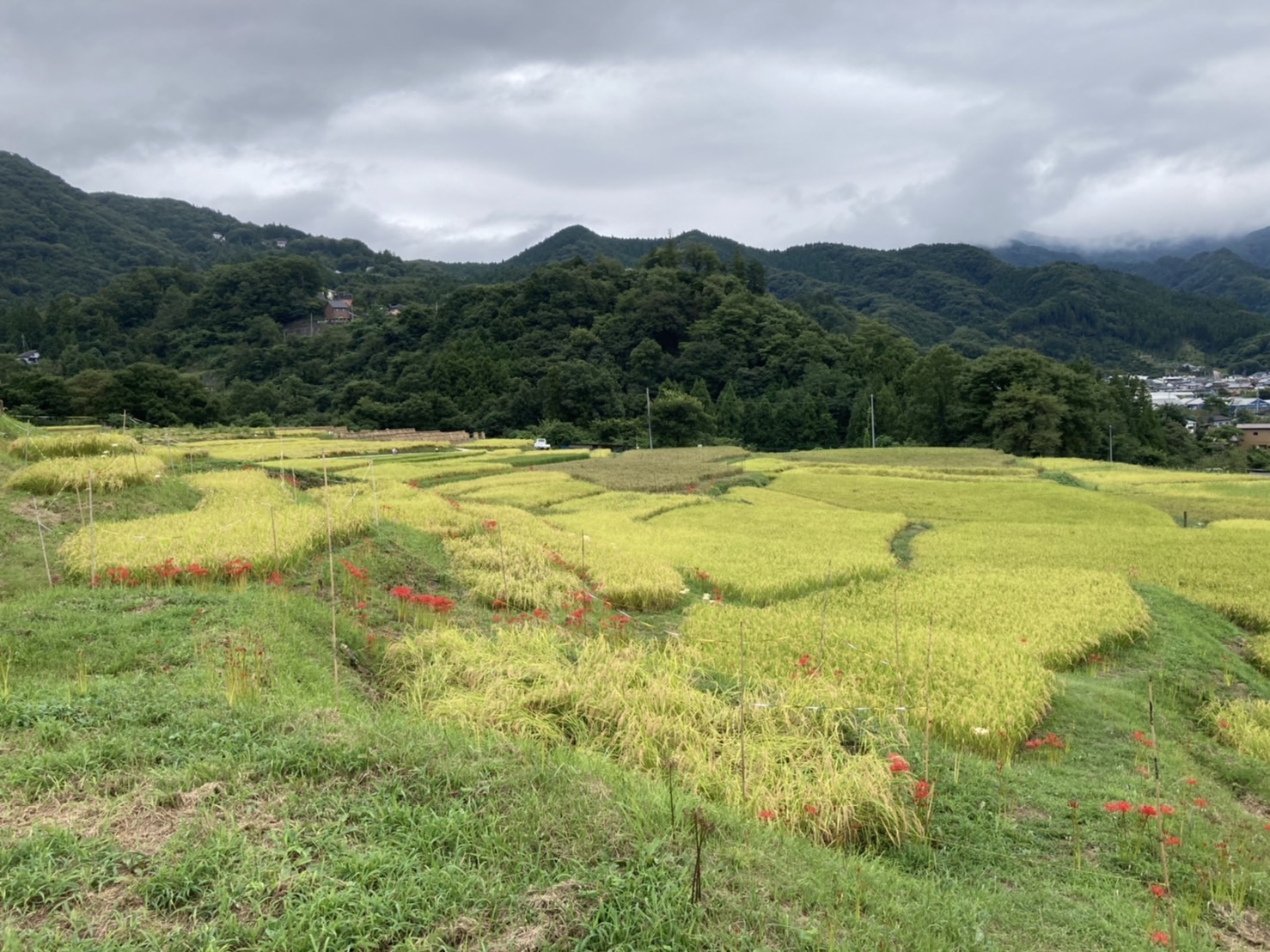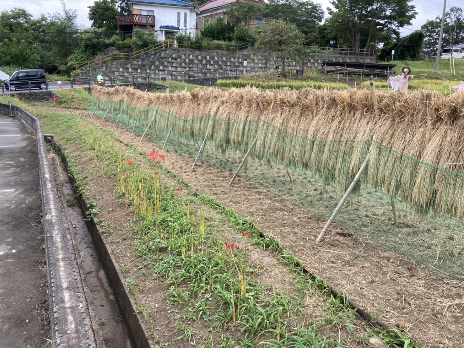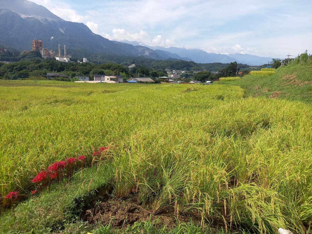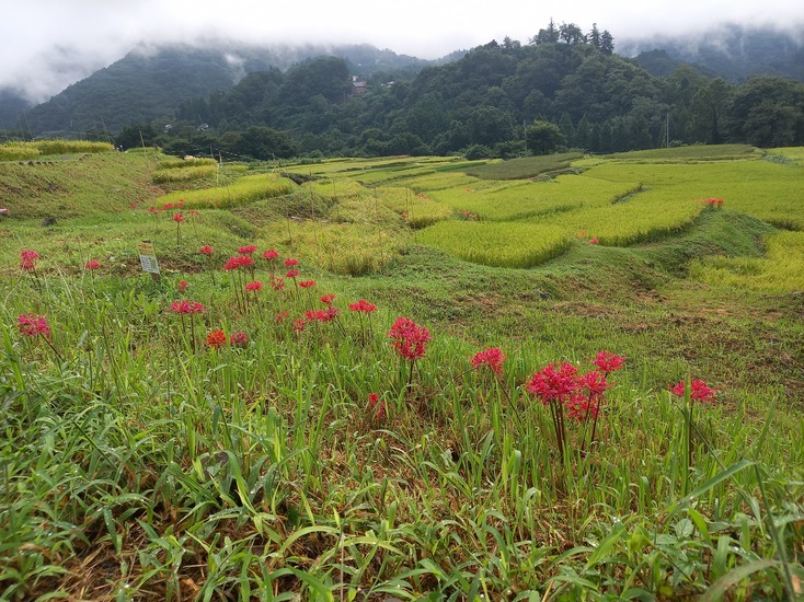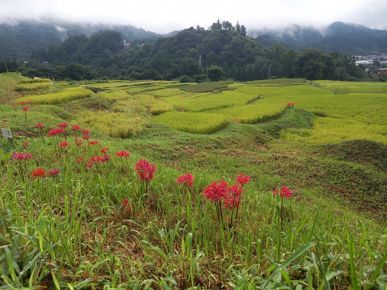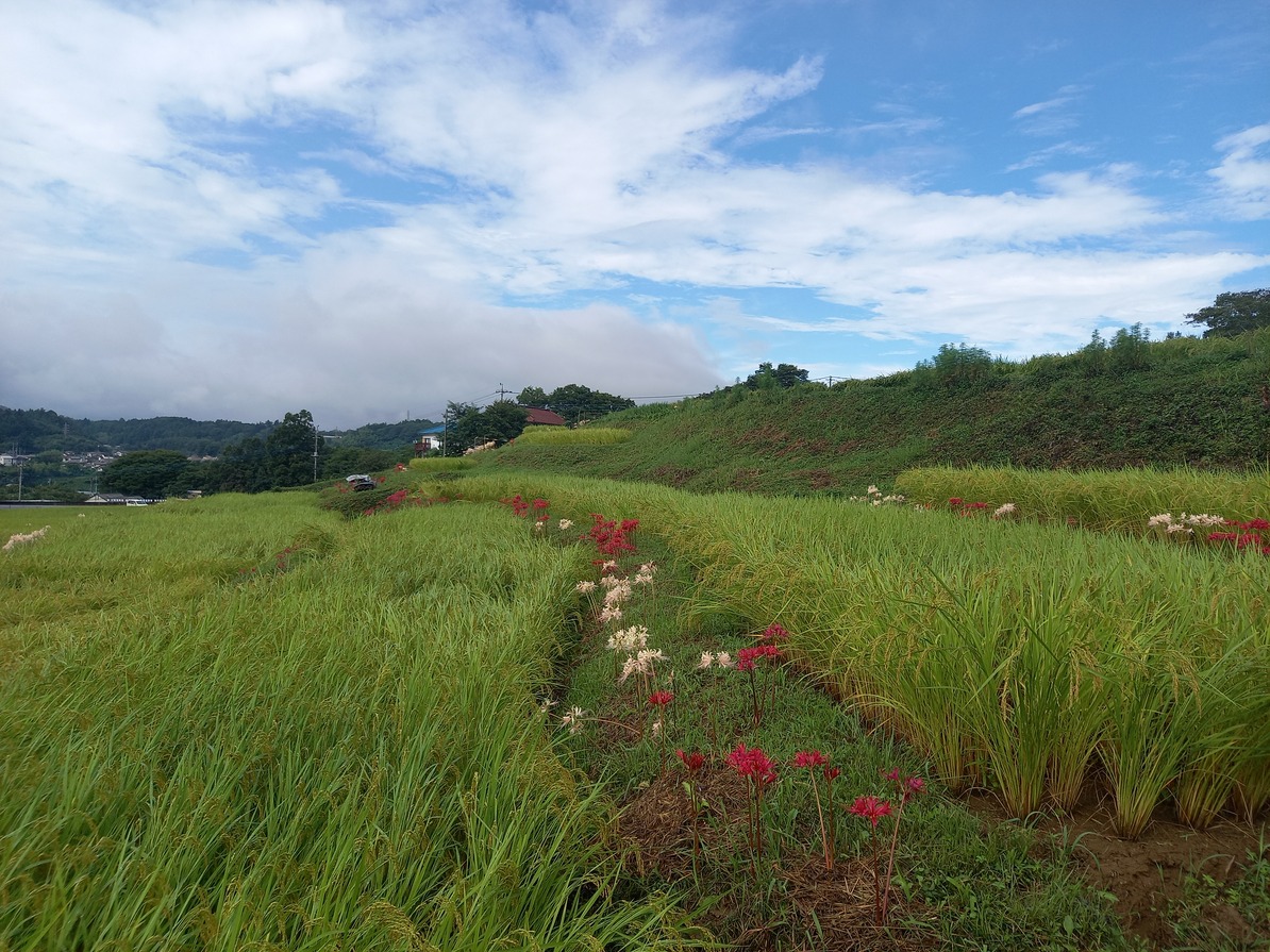 9月9日の様子。赤紫のリコリスが、写真のように咲いていました。ピンクの彼岸花(リコリス)も写真のように咲き始めています。朱色の彼岸花はこれから咲きそう。稲穂が写真のように綺麗ですが、一部倒れて畔にかかっているので歩くときにご注意願います。