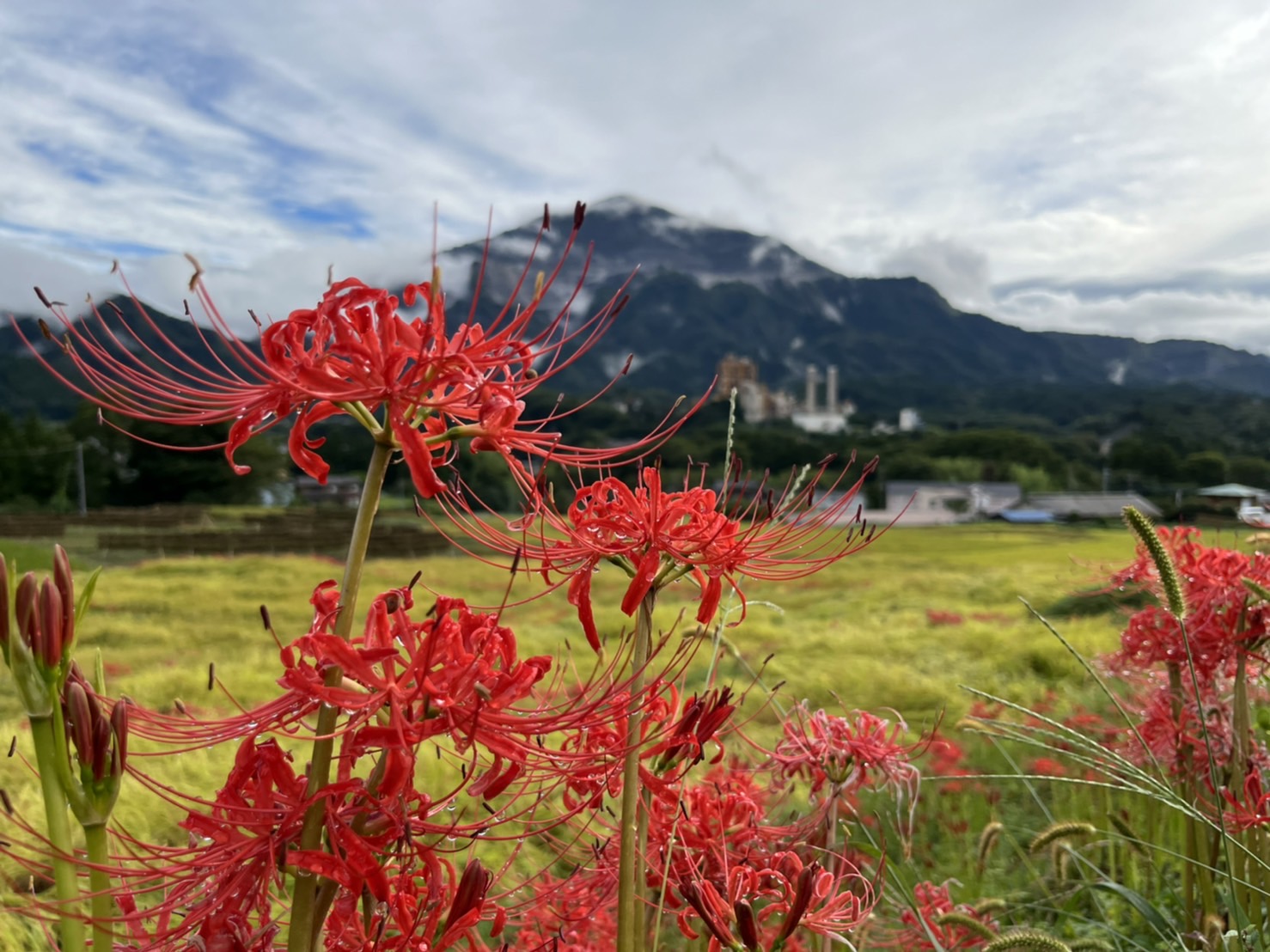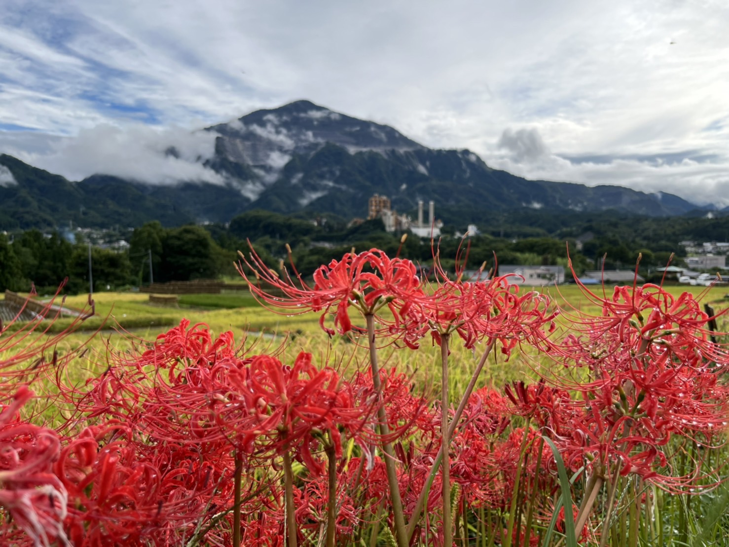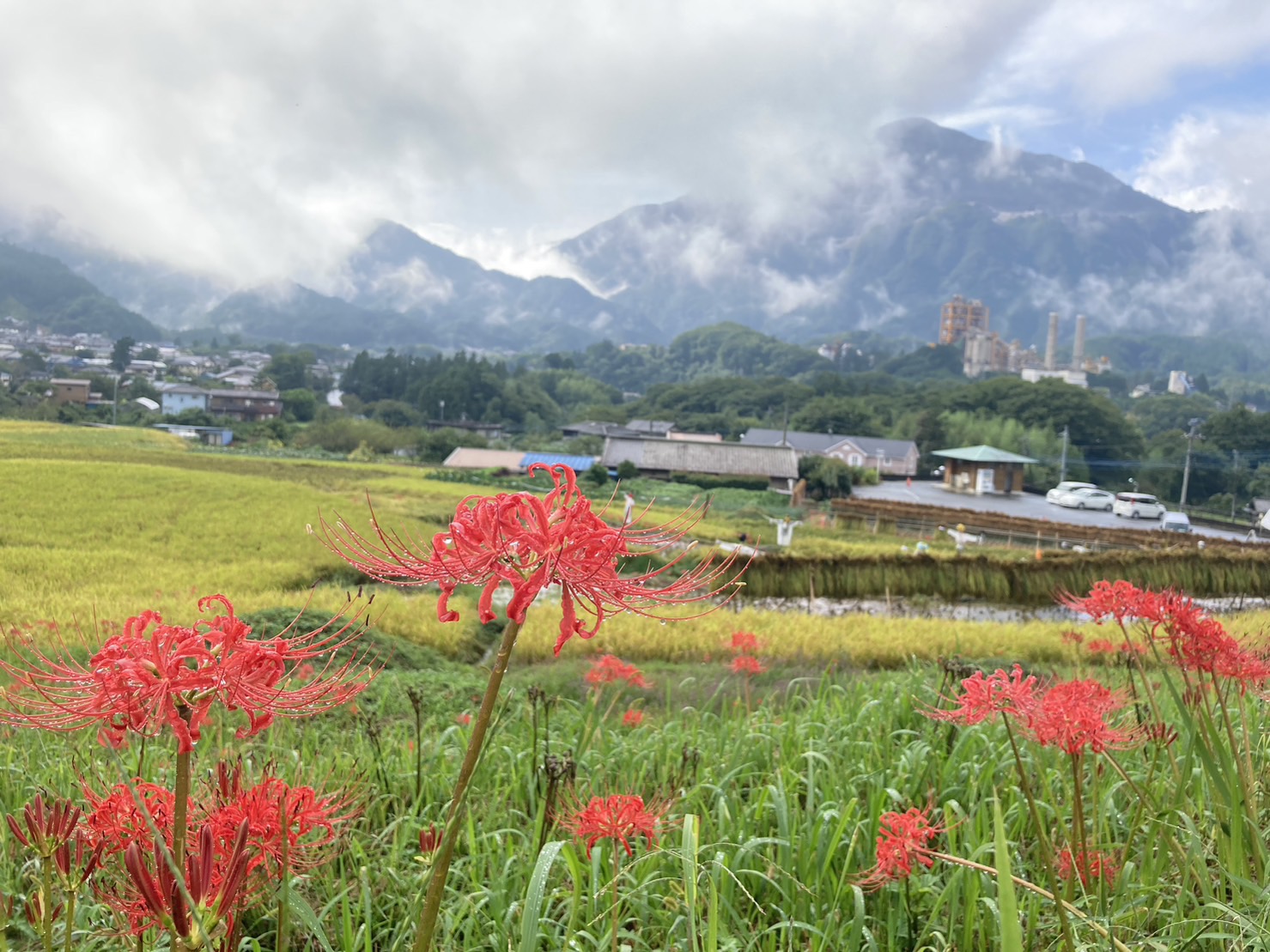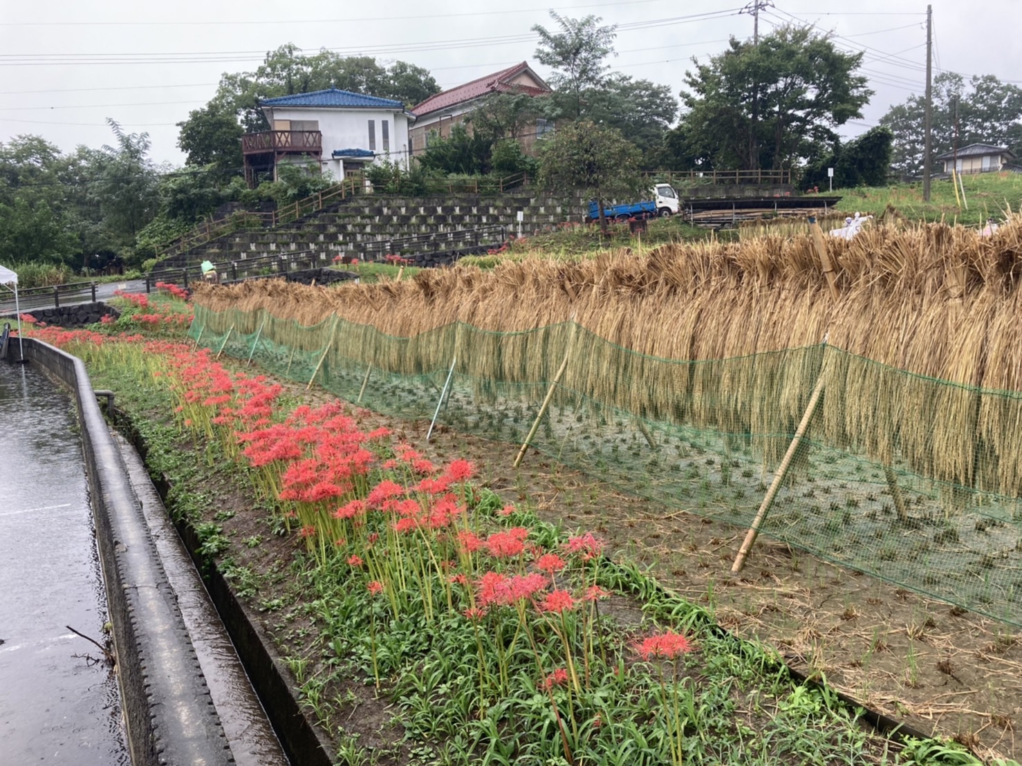 9月9日の様子。赤紫のリコリスが、写真のように咲いていました。ピンクの彼岸花(リコリス)も写真のように咲き始めています。朱色の彼岸花はこれから咲きそう。稲穂が写真のように綺麗ですが、一部倒れて畔にかかっているので歩くときにご注意願います。