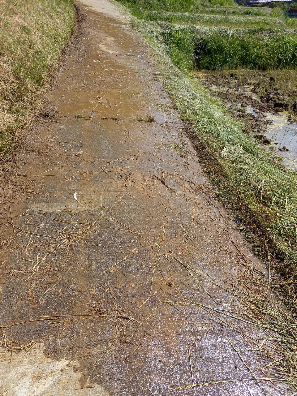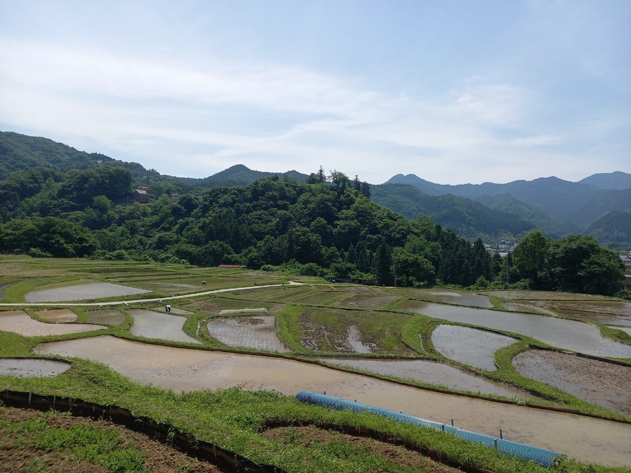 午前9時ごろの様子。場所によっては、写真のように逆さ武甲山が見ることができました。ですが、奥から見ると写真のように水が完全に入っていない田が多いです。棚田に水を入れる様子は・・・写真のような感じで入れているのです。棚田のことを色々感じ取れる季節。今日は鳥のさえずりと蛙の鳴き声が。蛙が鳴くと雨が降るというのは、秩父に住んでから初めて聞きました。そのぐらい季節感にあふれた風景。ちなみに・・・午前中は晴れていました。昼過ぎから曇っています。