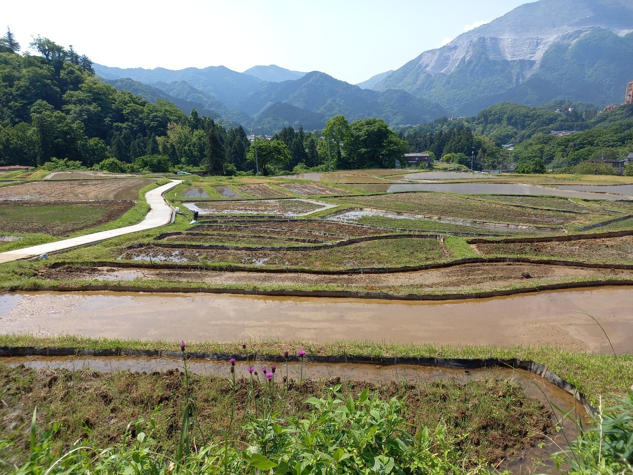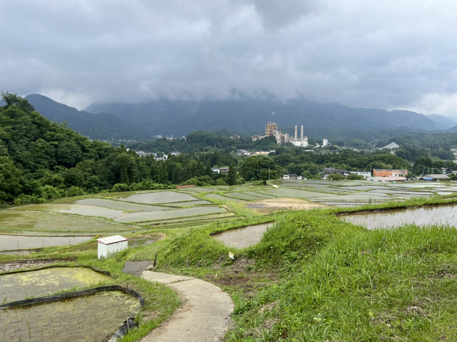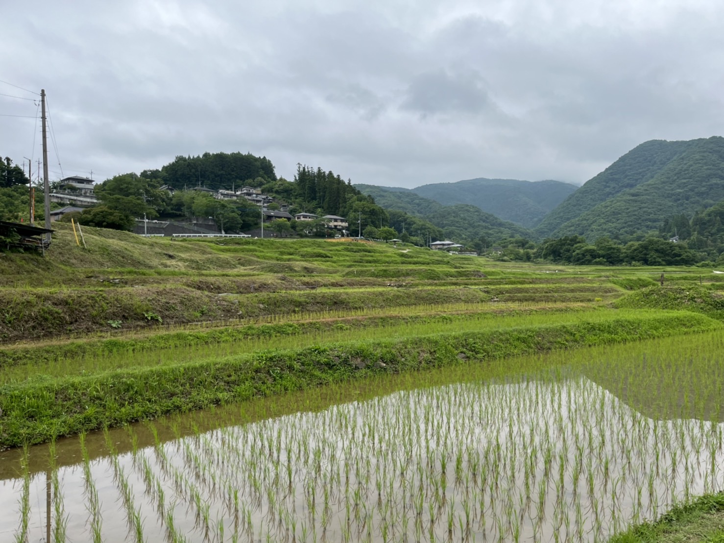 昨日の様子。またまた前回から時が流れてしまいましたが・・・梅雨入りしました。雨も降っていなかったので朝から部屋中の窓を全開!梅雨に負けず爽やかに過ごしたい今日この頃。皆さんいかがお過ごしでしょうか。寺坂棚田は9割ぐらい田植えが終わっています。梅雨入りした景色も穏やかで、棚田全体で苗や蛙が呼吸をしているかのような生命力あふれる景色。天候によっては所々あぜ道が濡れているので、お足元に注意し履きなれた靴でお越しください。
