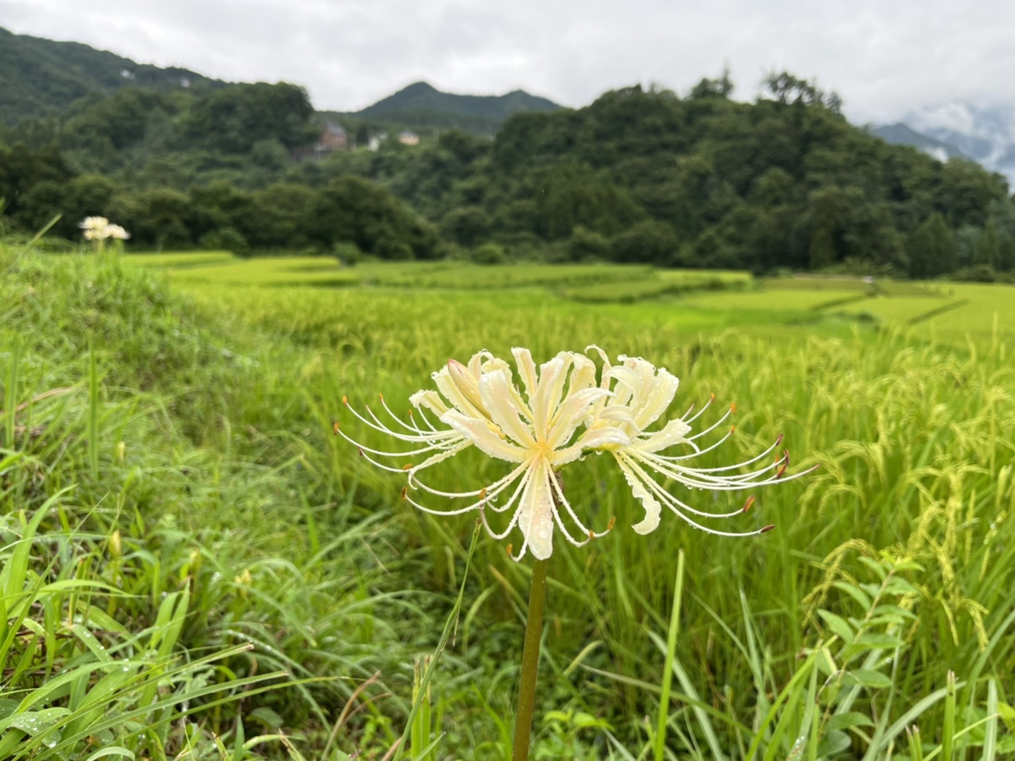 白い彼岸花(リコリスという園芸品種)が畦に咲きだしました。稲もかなり生長しております。