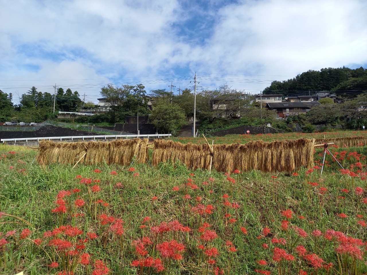 はぜ掛けと彼岸花、青空のコントラストをお楽しみください。