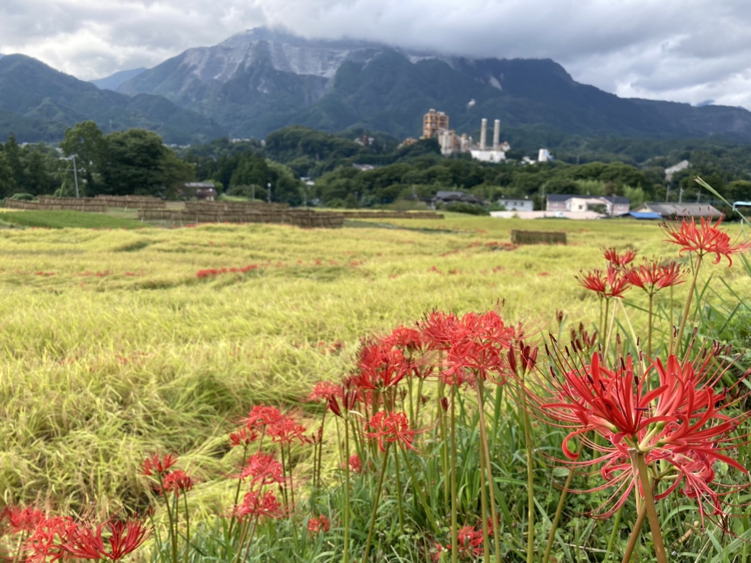 朱色の彼岸花より、黄金の稲穂が目につきます。朱色の彼岸花のつぼみが、いつもより少ない感じがしますが・・・これからでしょうか。