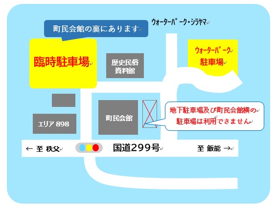 7月29日(土)から8月27日(日)の期間中、8時30分から17時まで下記のとおり臨時駐車場を設けております。ウォーターパーク駐車場が満車の場合はご利用ください。