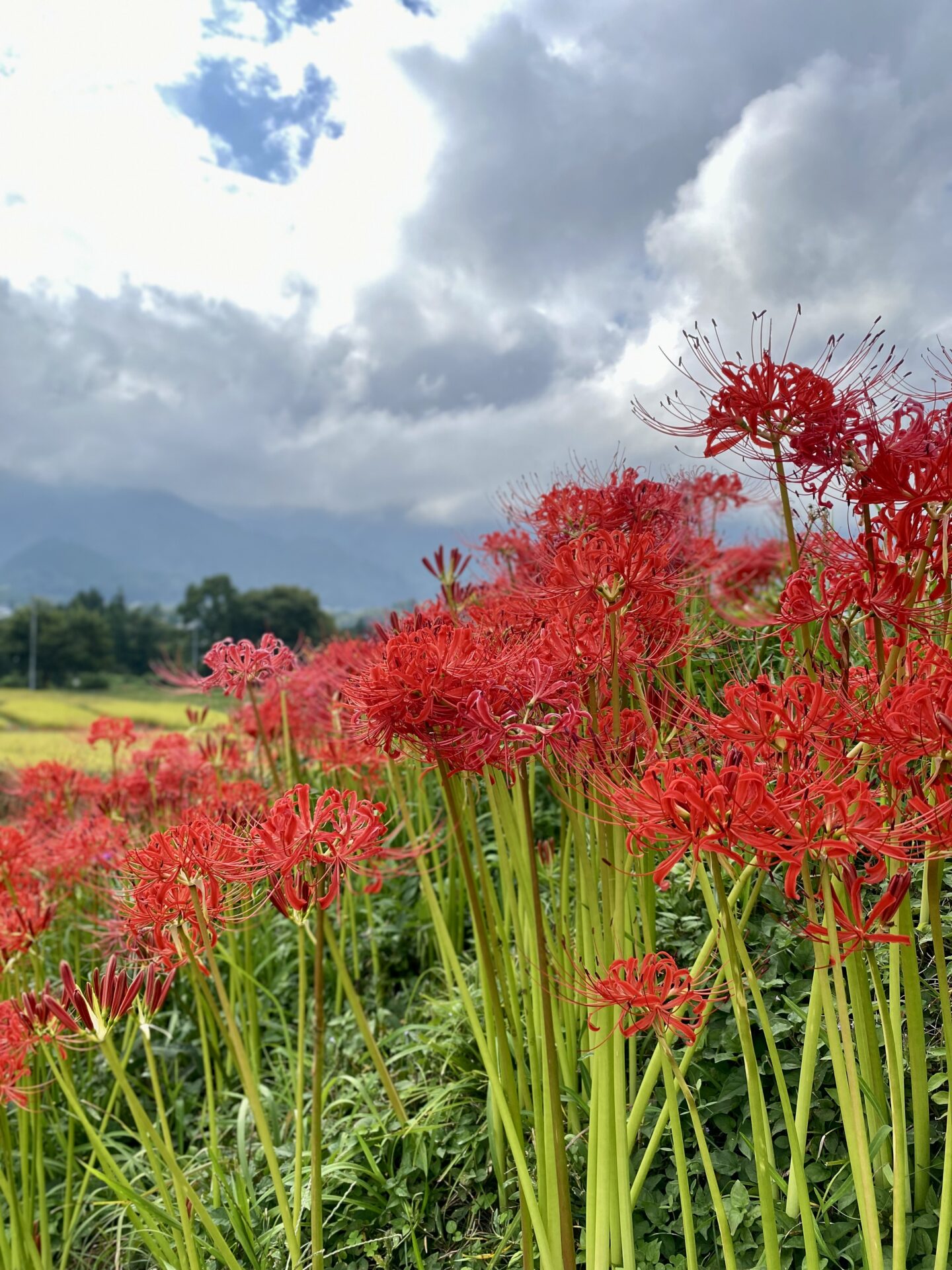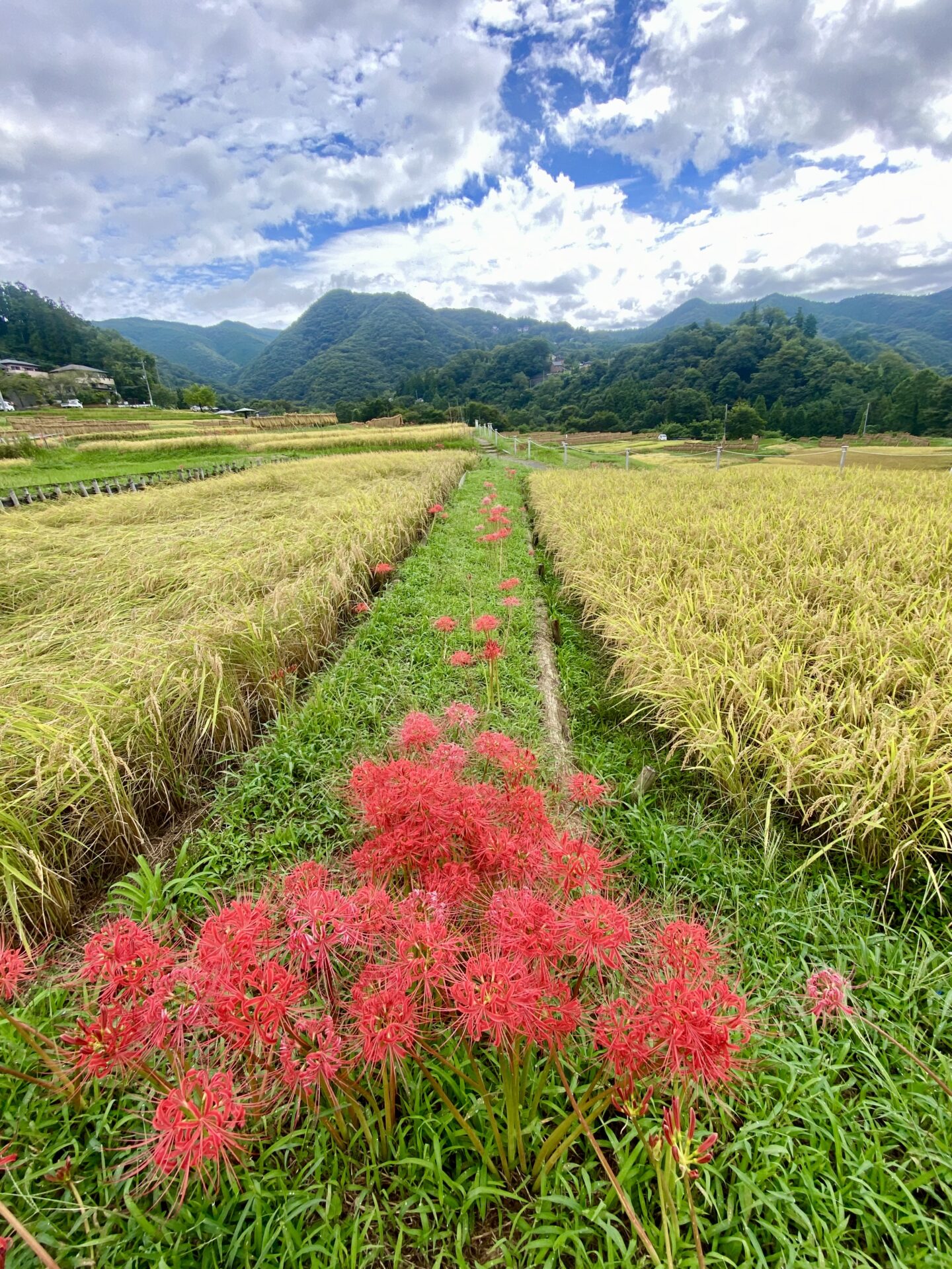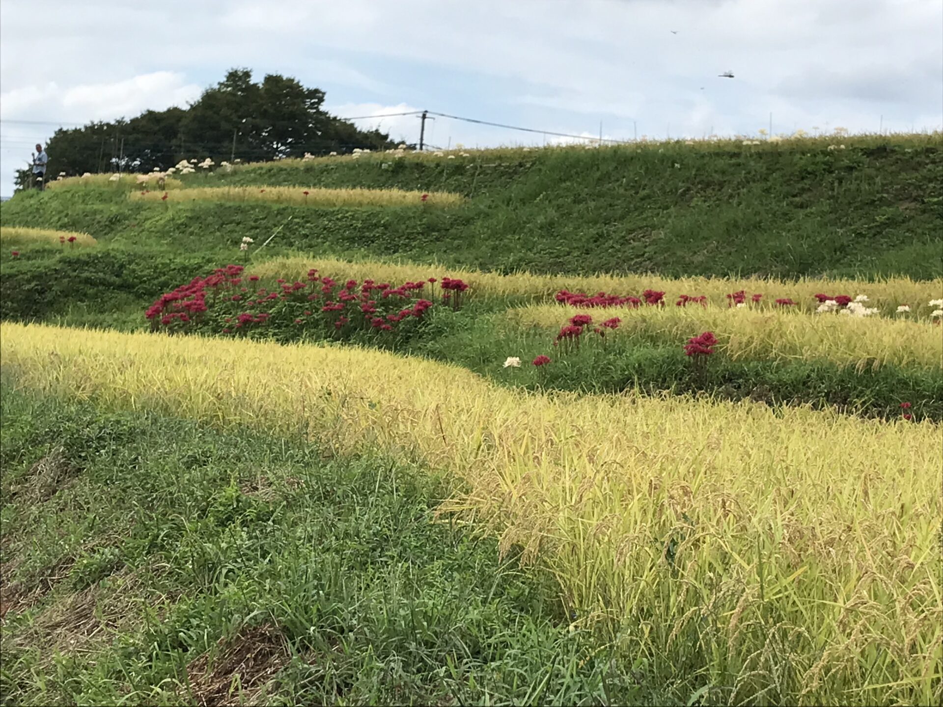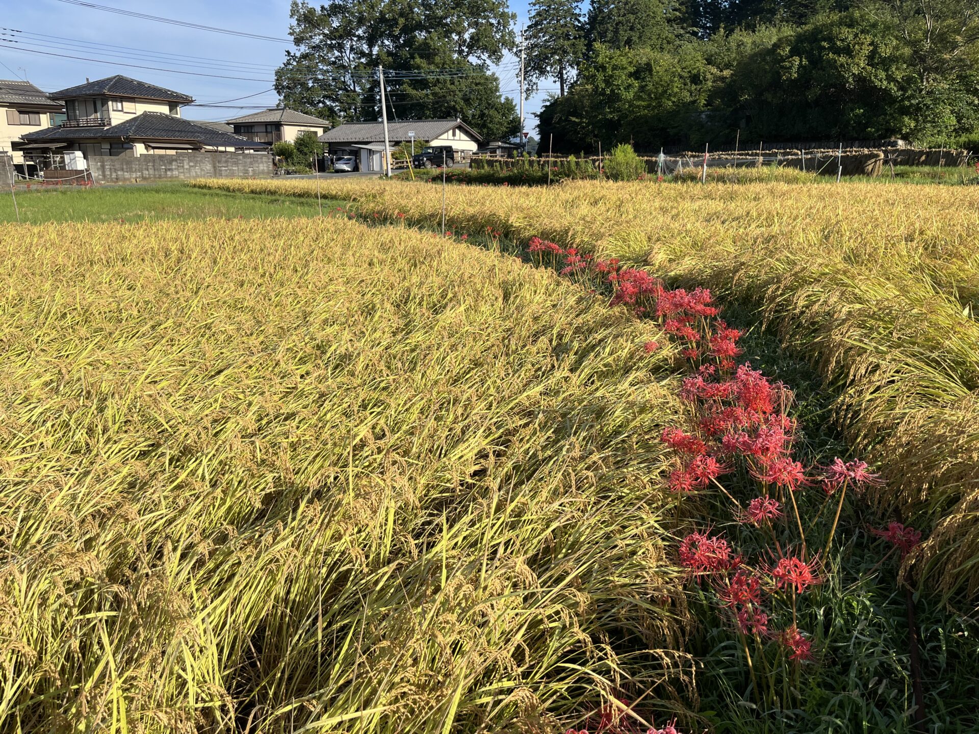 まさに今見ごろを迎えていて、青空と朱色の彼岸花、黄金色の稲穂のコントラストが見事!でした。