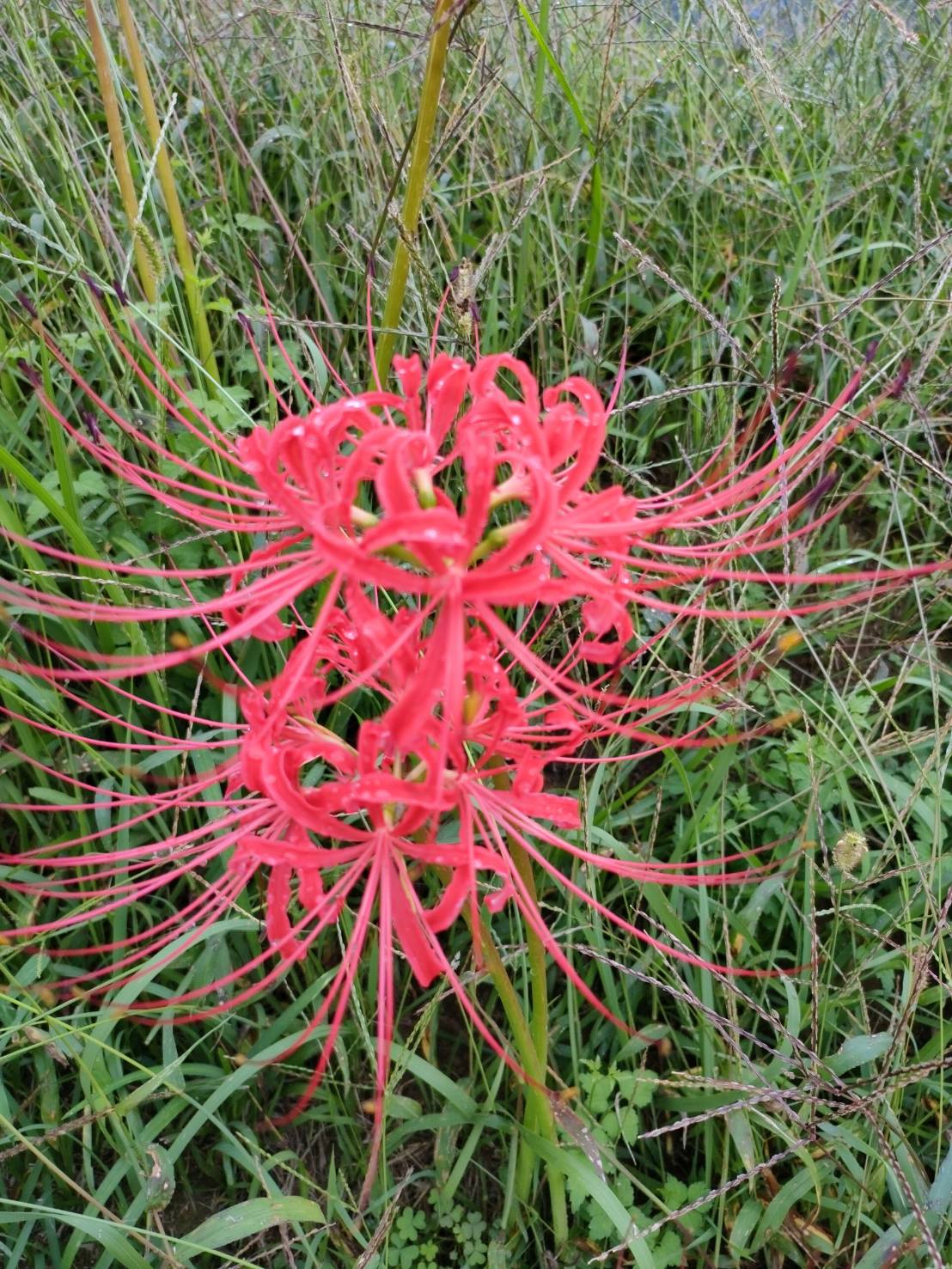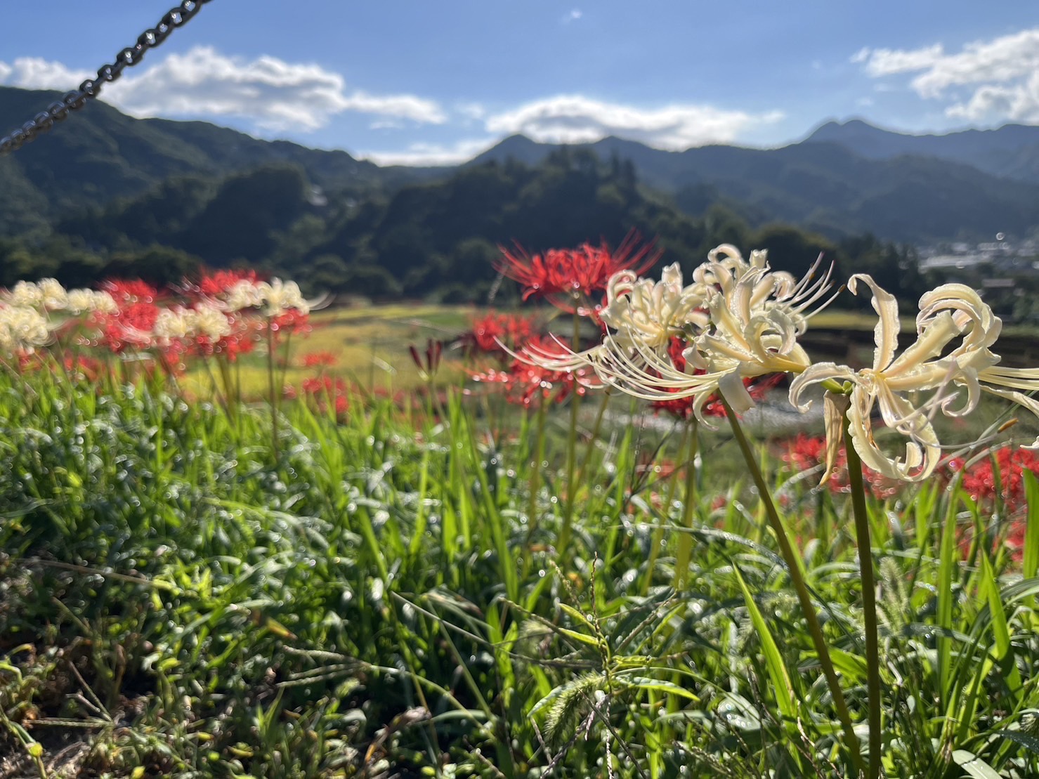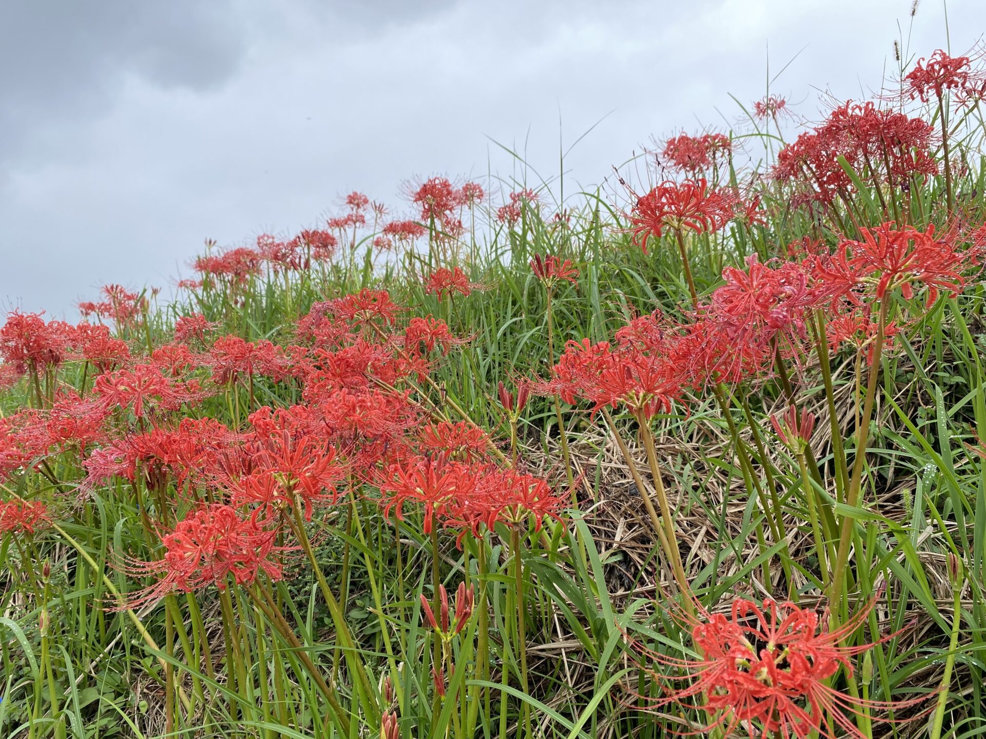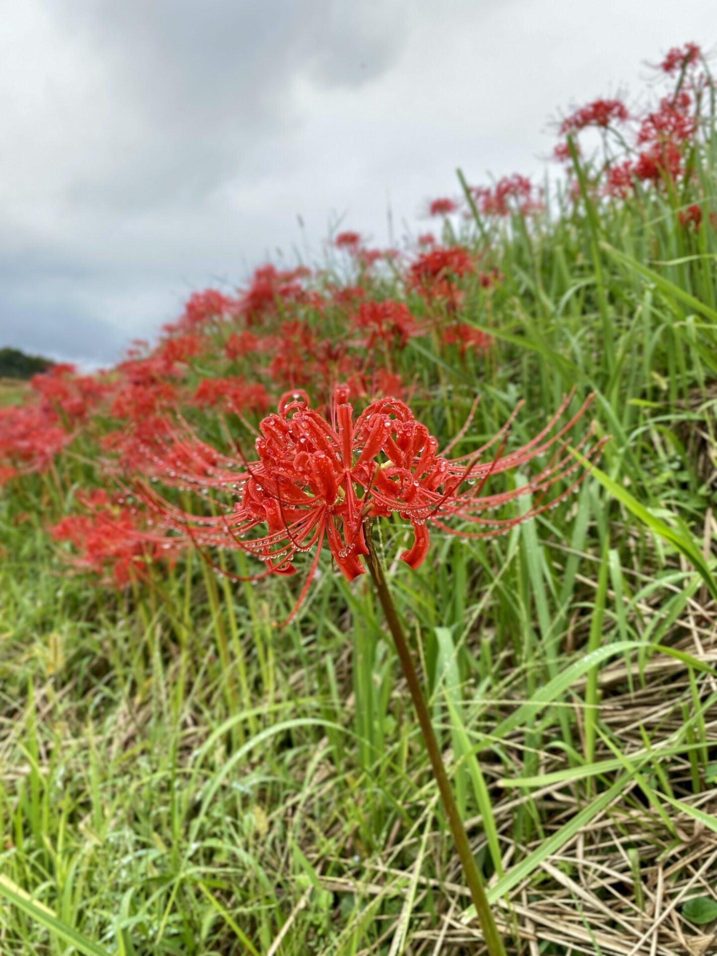 昨晩から降った雨露が彼岸花にかかり、とても綺麗でした。この頃の涼しい気温で、彼岸花も半数以上が咲き始めました。まだ蕾もちらほらと見受けられますが、朝から彼岸花を見に来た方々で賑わっていました。