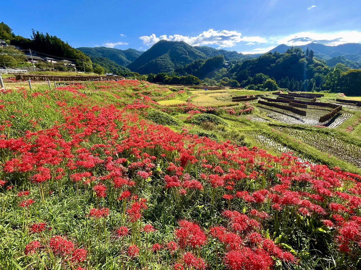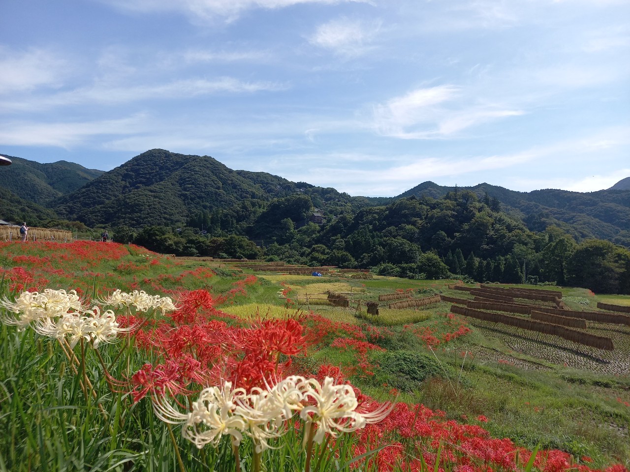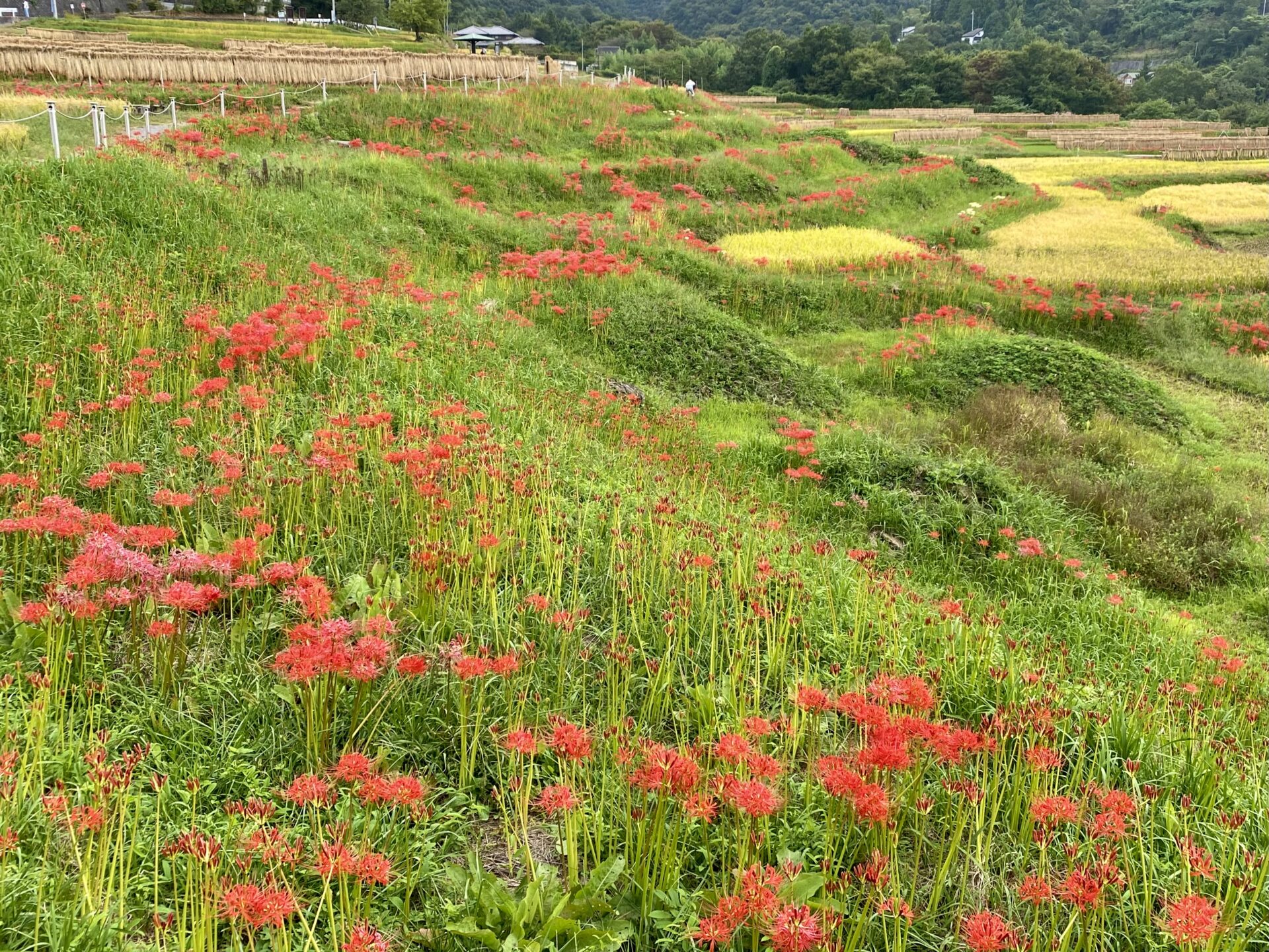 本日の棚田の様子です。彼岸花は見ごろを迎えています。今日は朝から大勢の方が観光にいらしております。