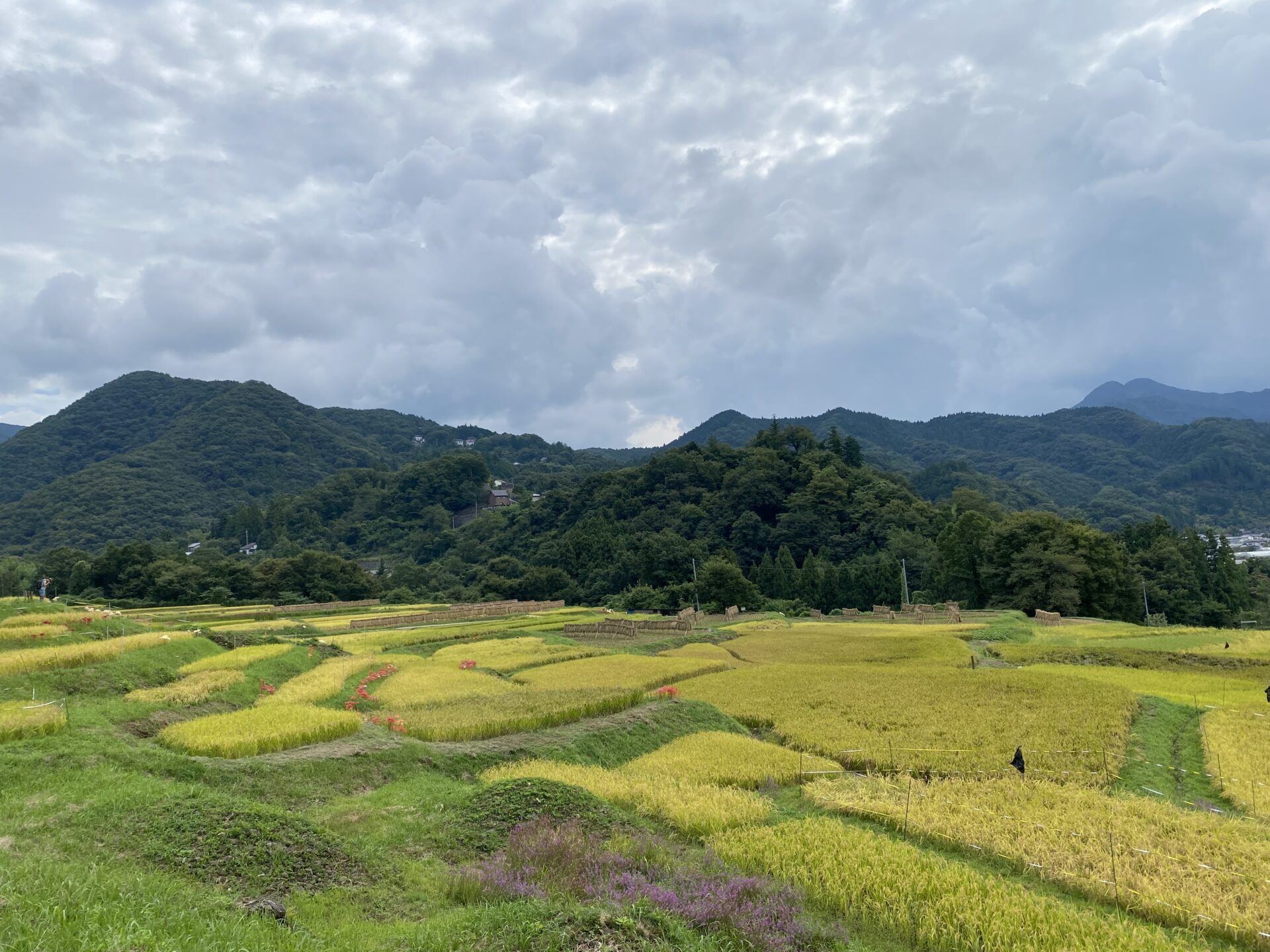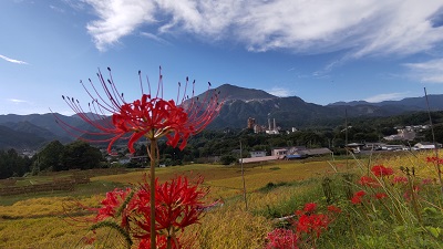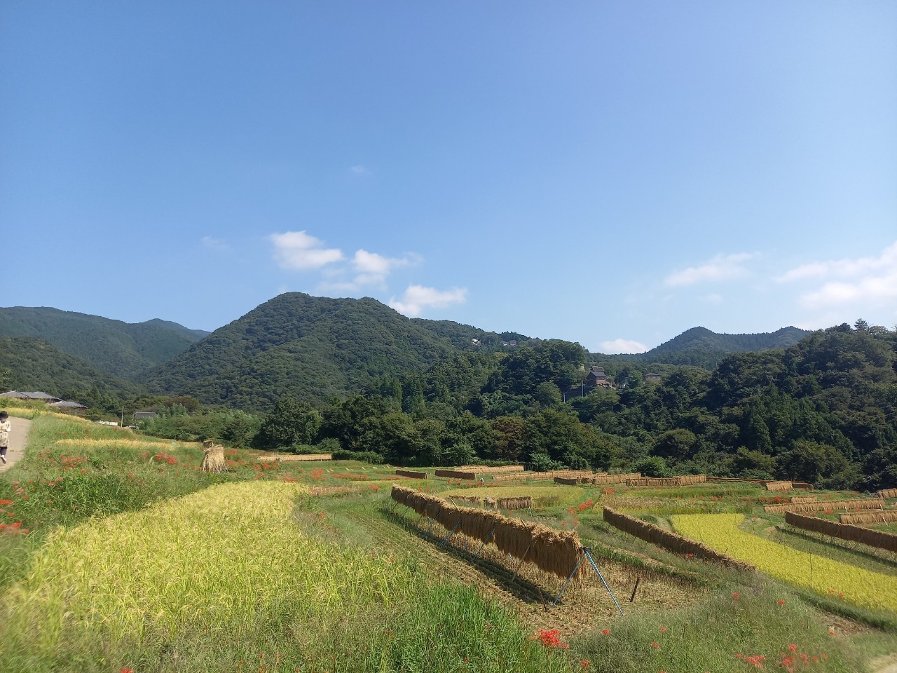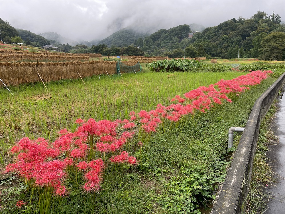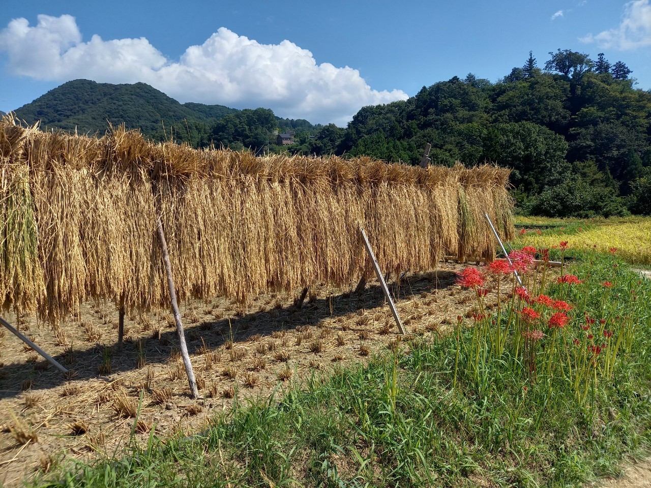 稲刈りが始まりました。はぜかけをしているのも、いくつか見られます。棚田ではリコリス(園芸品種の彼岸花)が咲いています。蝉の声、風に揺れる稲穂の音を聞いていると心身ともに癒されて、心地よい時間を過ごせます。