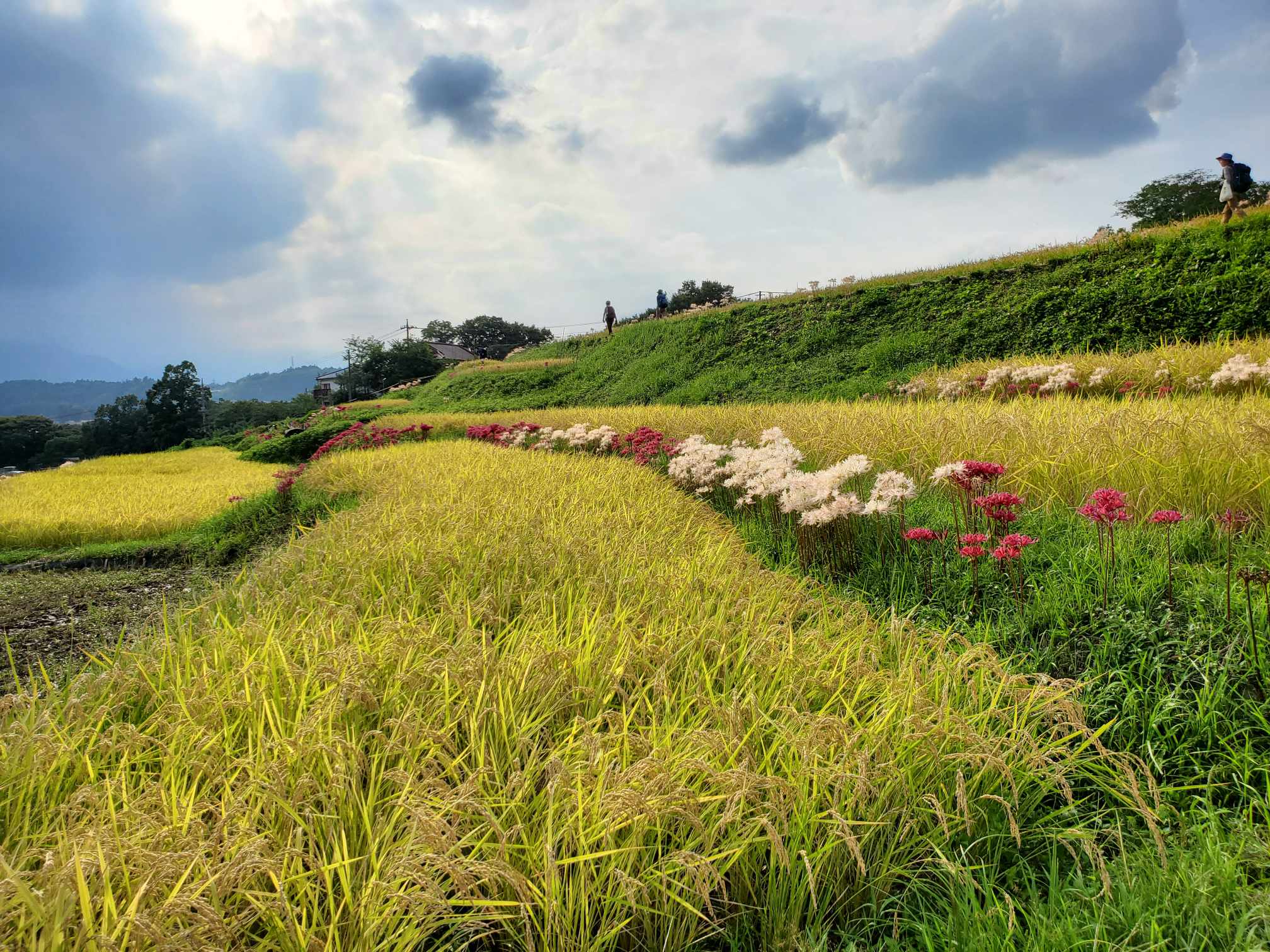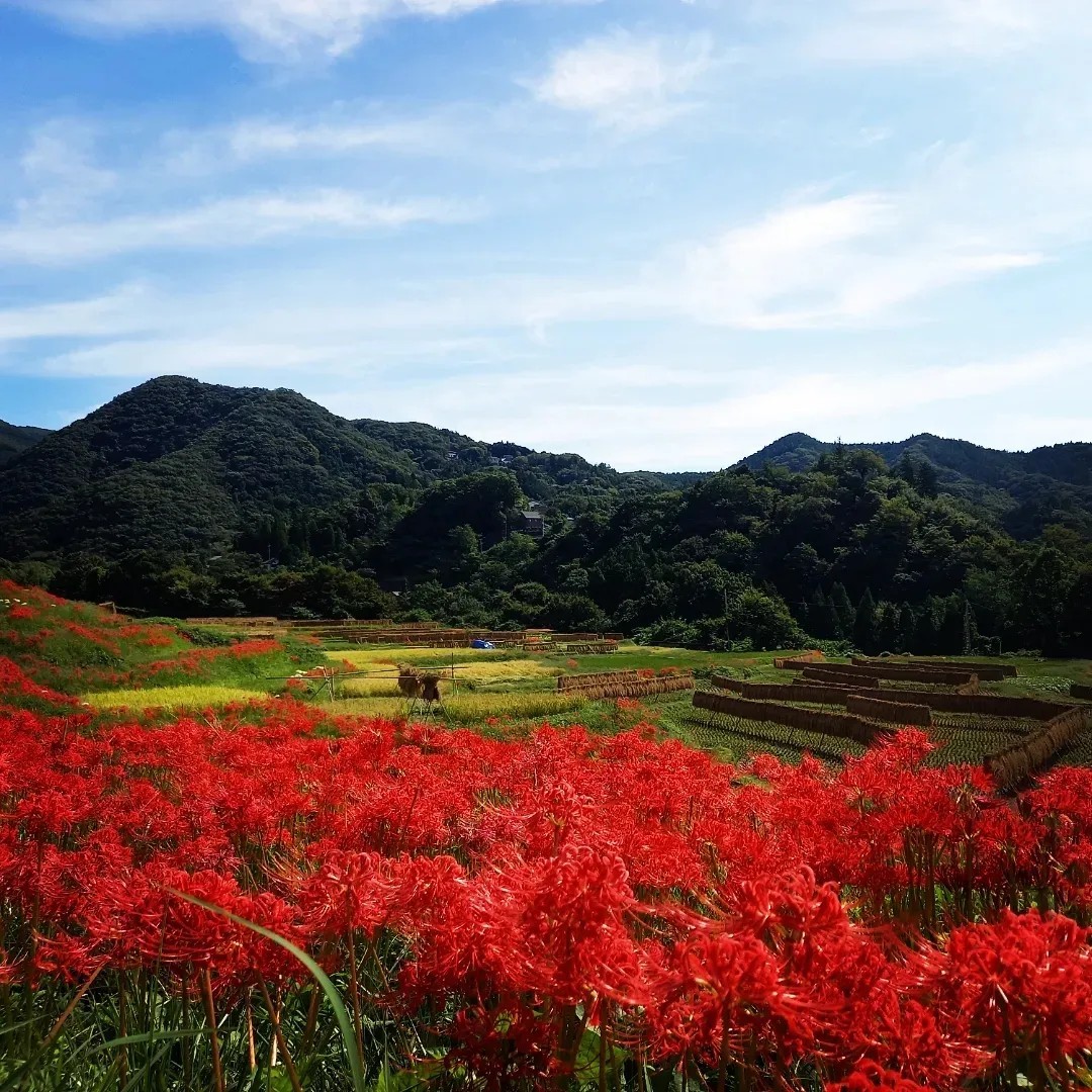 彼岸花と棚田の様変わりする風景をお楽しみください。