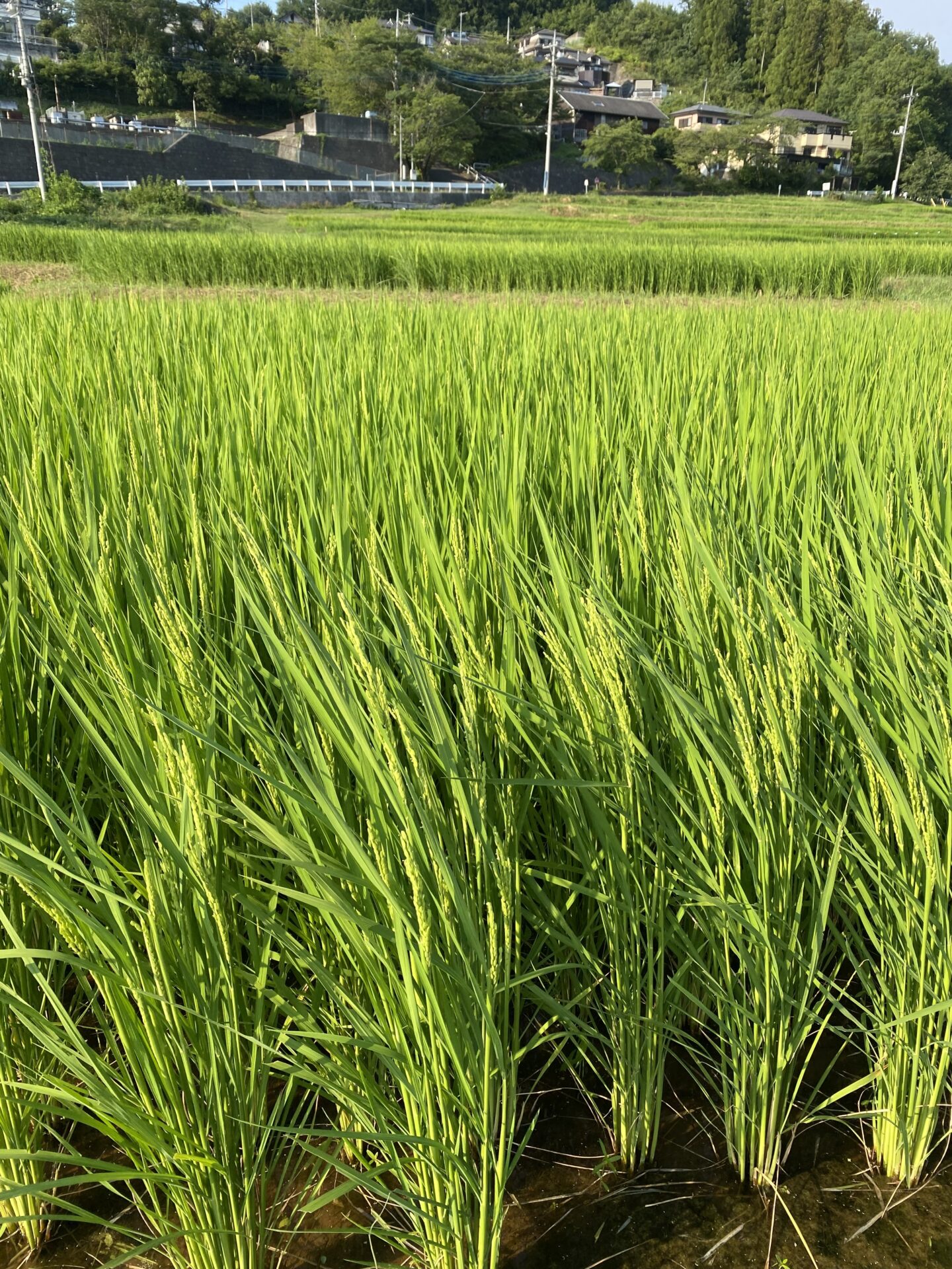 青々とした稲たちが風でなびき、夏の光に稲穂が照らされていました。