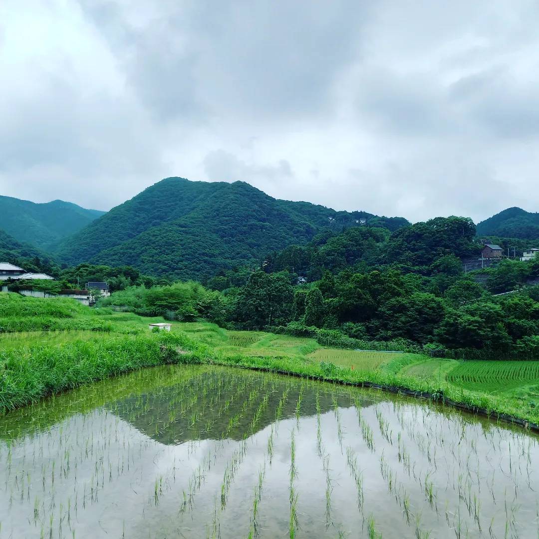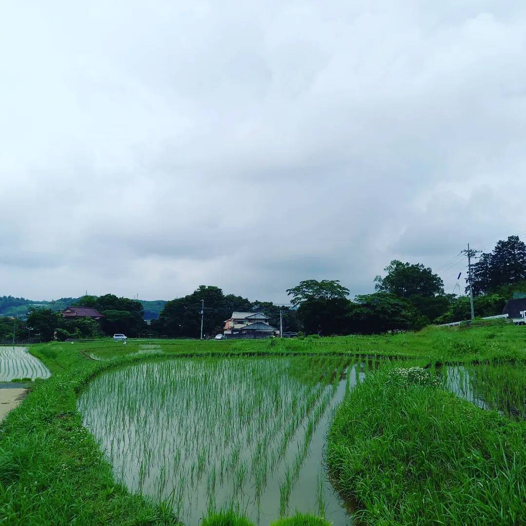 梅雨に入りました。水が入り、稲が植えられた写真のような風景。