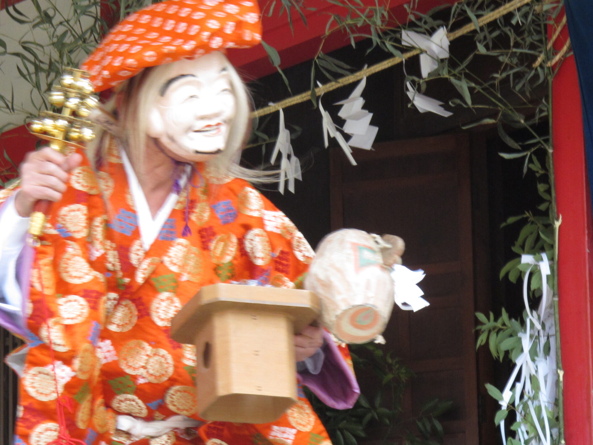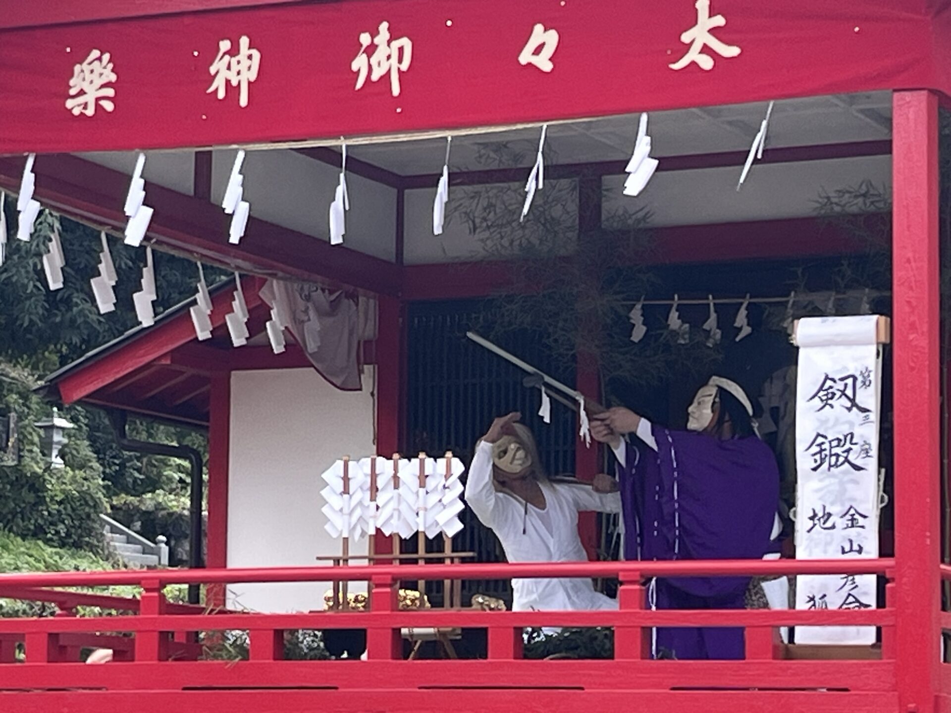 曲目は17座を数えましたが、現在、舞われている座名は、「翁渡し」、「御姫舞」、「剱鍛」、「天狗舞」、「神招き」、「大多福」、「岩戸開き」、「稲作り」、「大黒舞」、「魚漁り」、「隠箕隠笠」、「変面想」、「大蛇退治」、「終修祓」の14座となります。