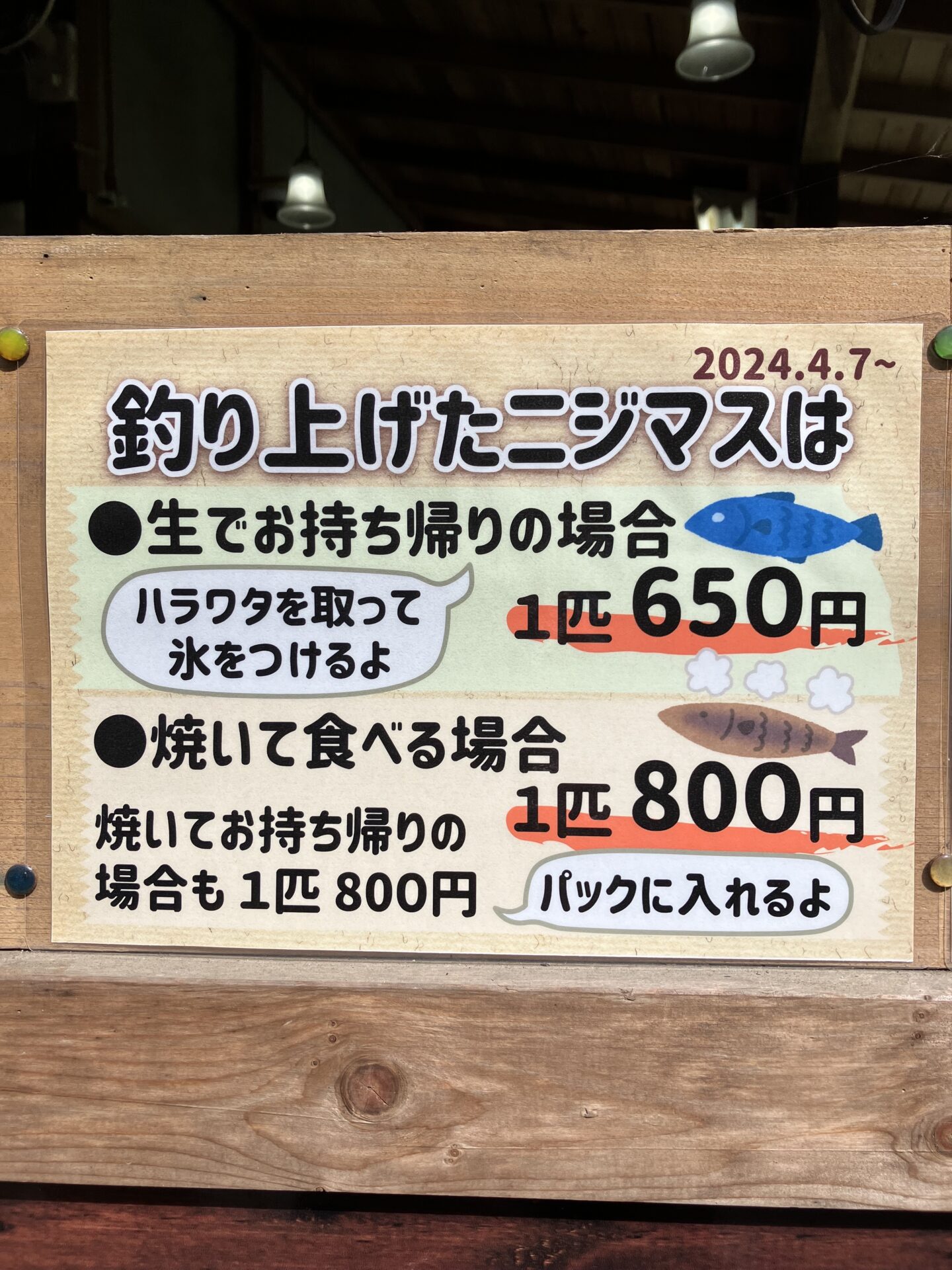 釣り上げたニジマスを焼いて食べる場合(パックに入れます)の代金が1匹800円です。