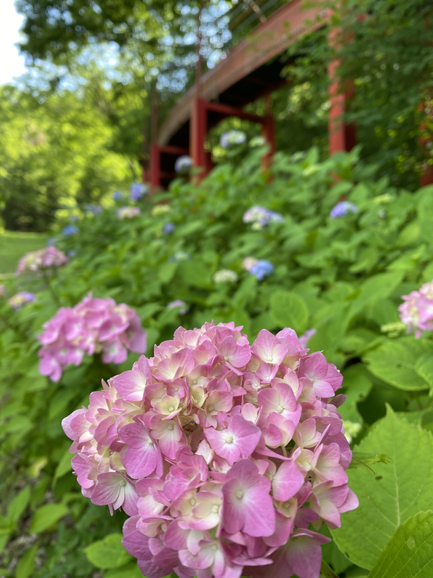 色とりどり、いろいろな種類のアジサイがあり、心地よい風とともに癒しの時間が過ごせます。