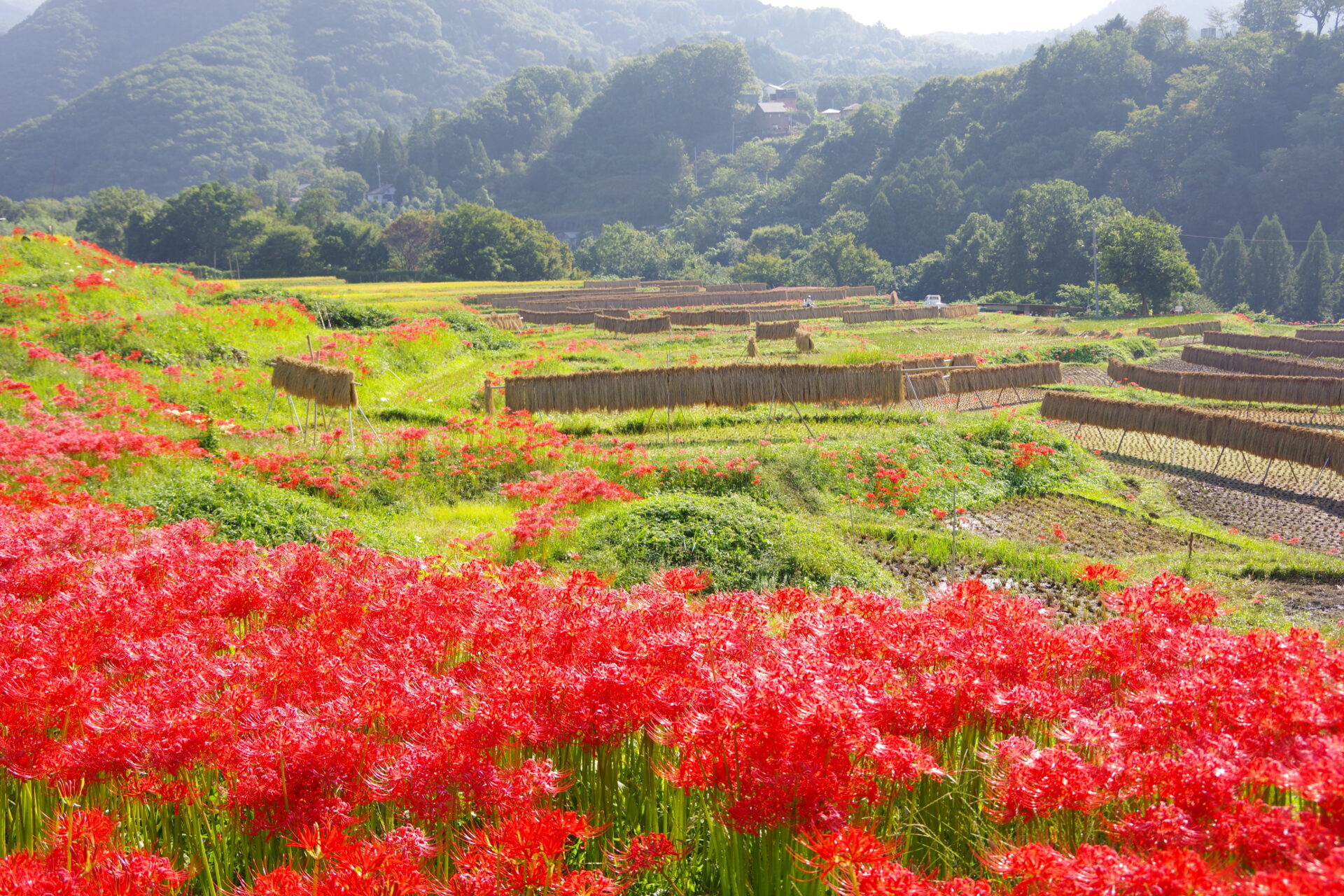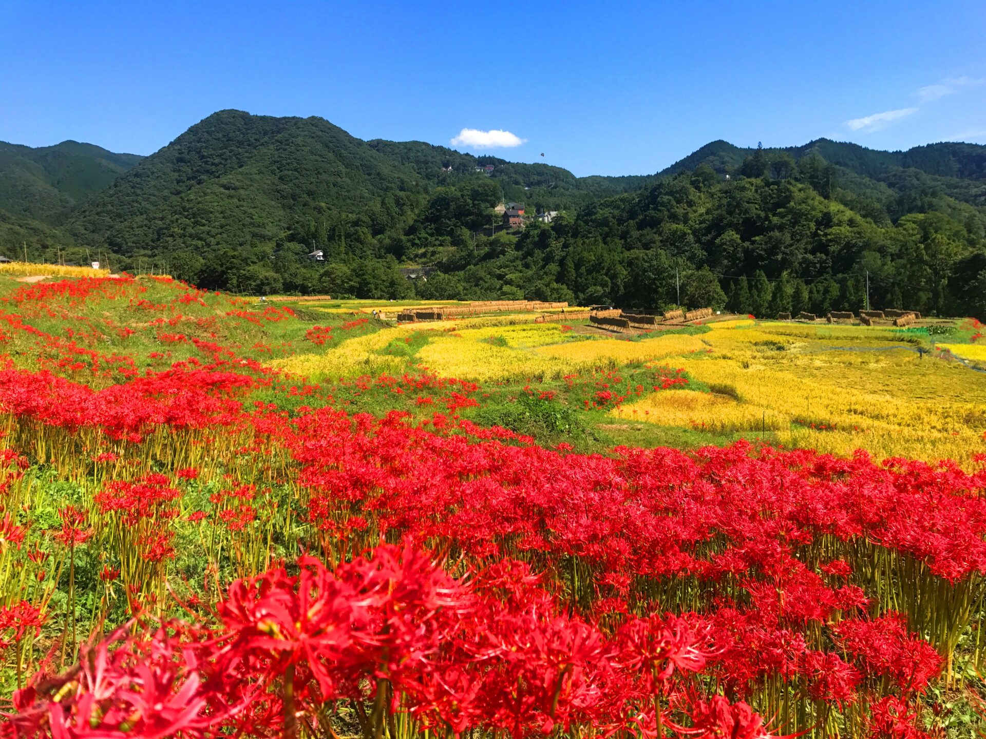 広大な棚田に広がる緋色の彼岸花と黄金色の稲穂がおりなす田園の郷愁。