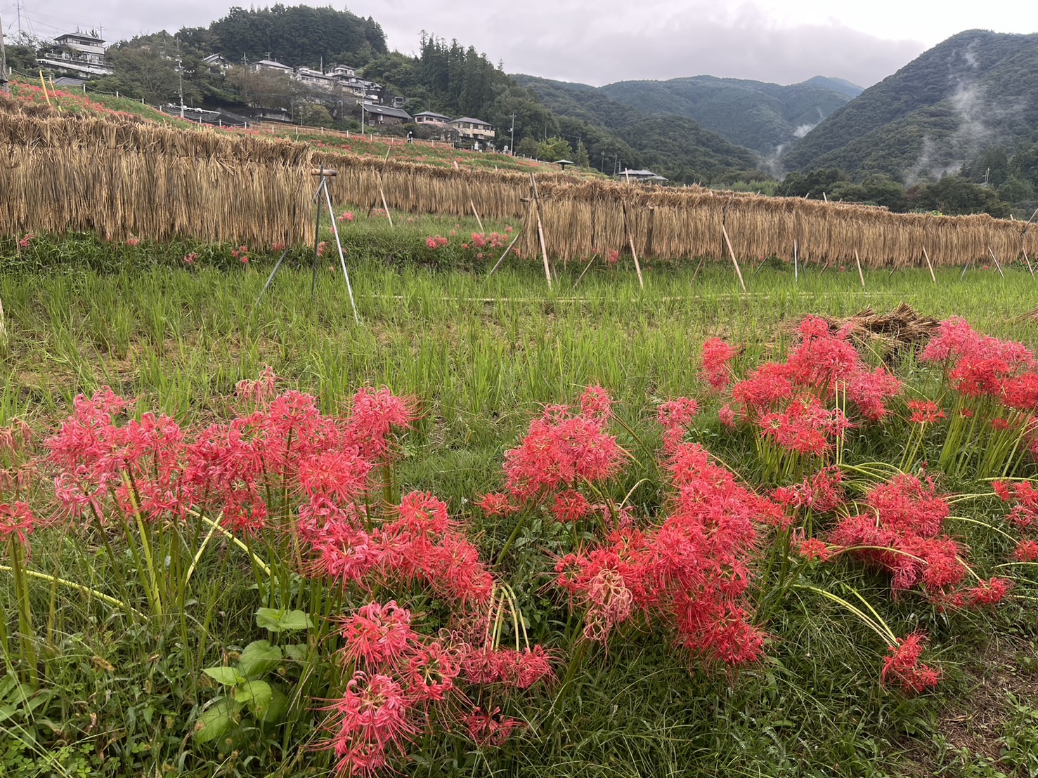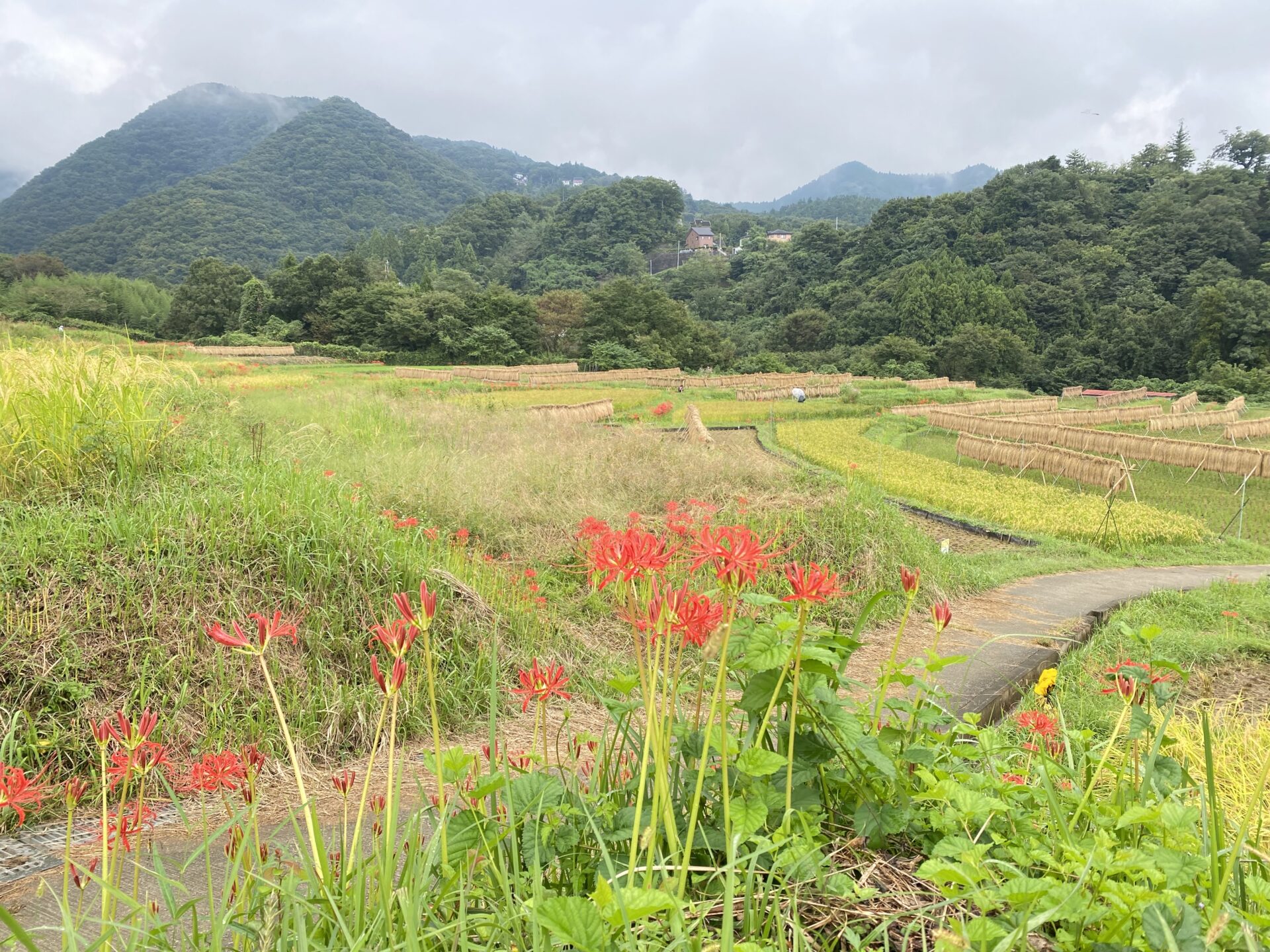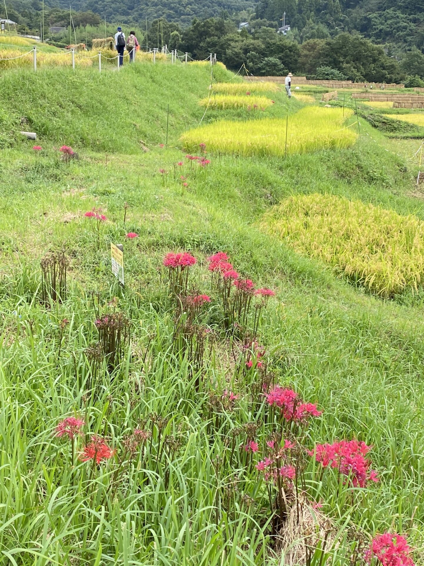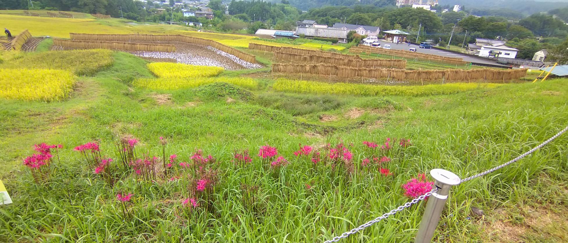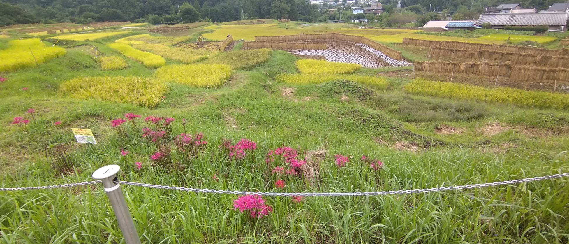 色褪せた花も目立ち始めましたが、写真のように色鮮やかな彼岸花と棚田のコラボも、まだ楽しめます。