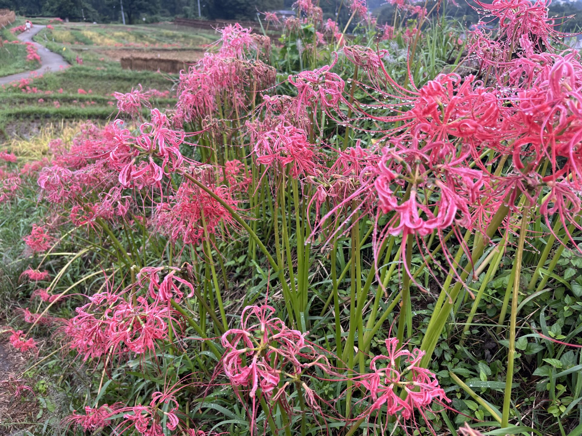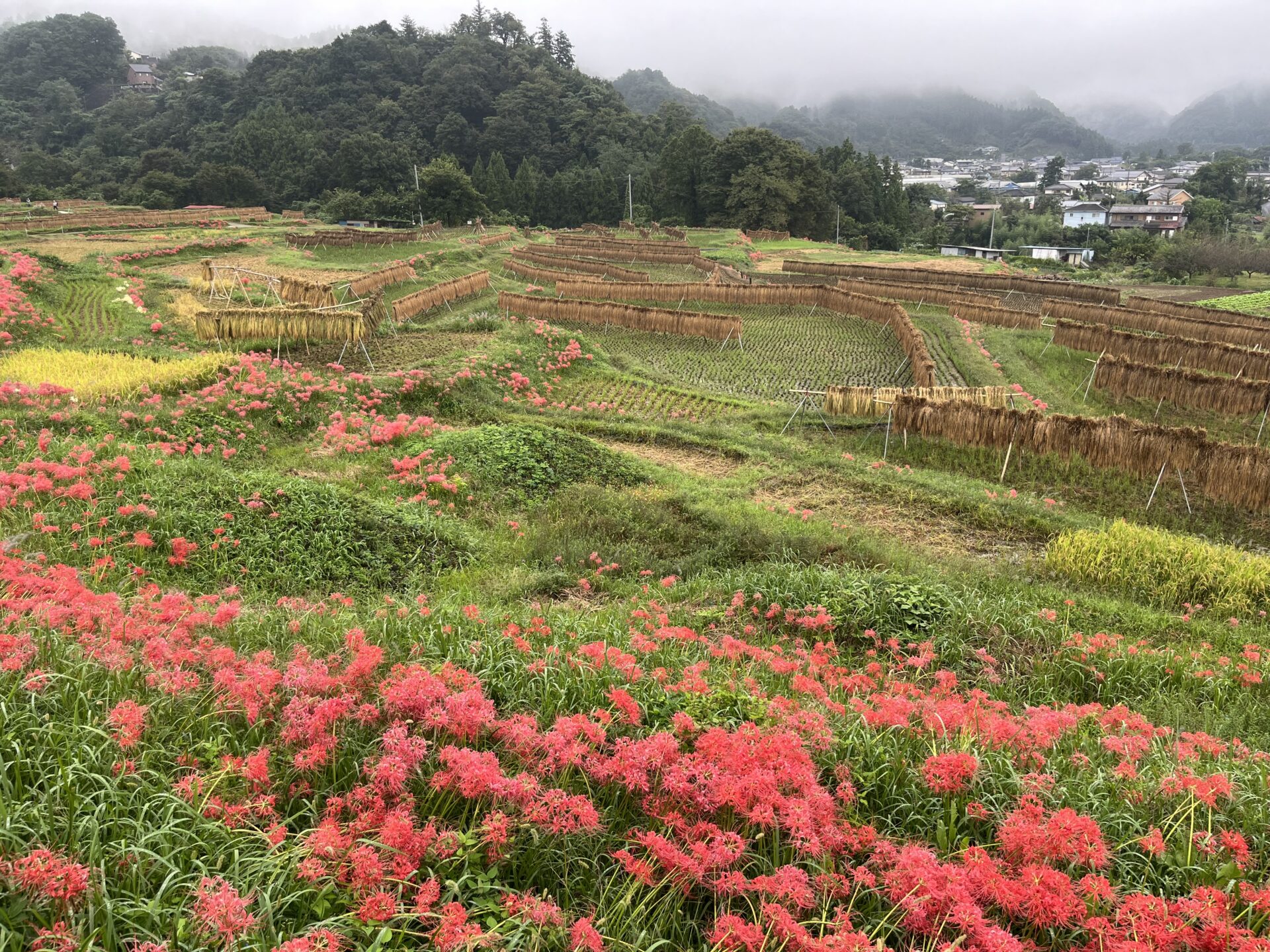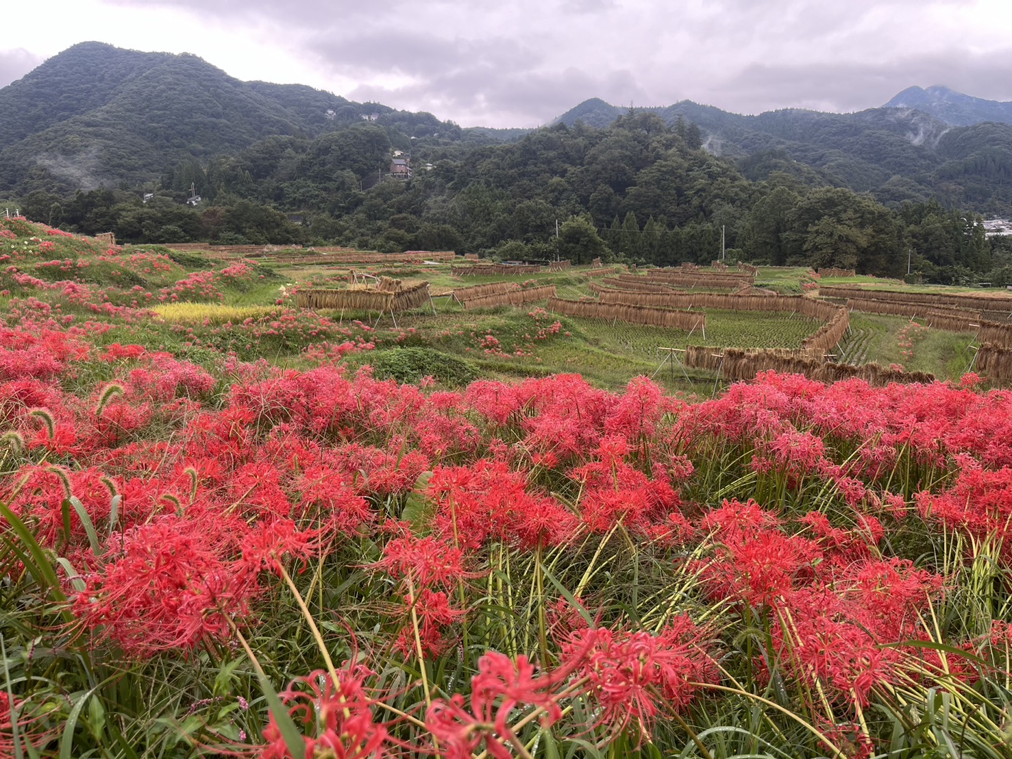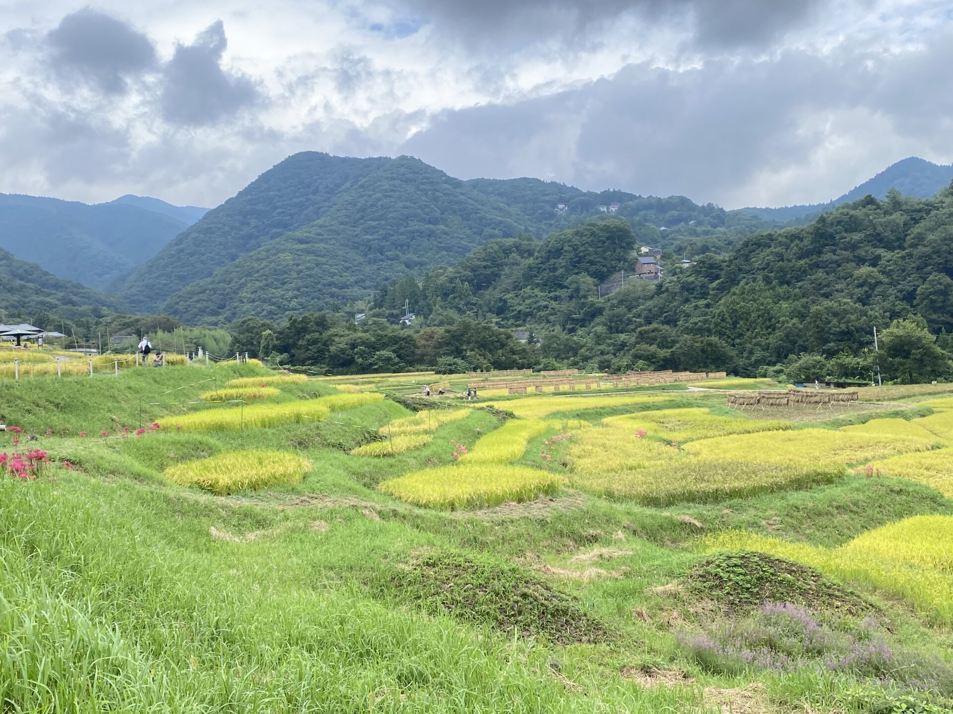 色褪せた花も目立ち始めましたが、写真のように色鮮やかな彼岸花と棚田のコラボも、まだ楽しめます。
