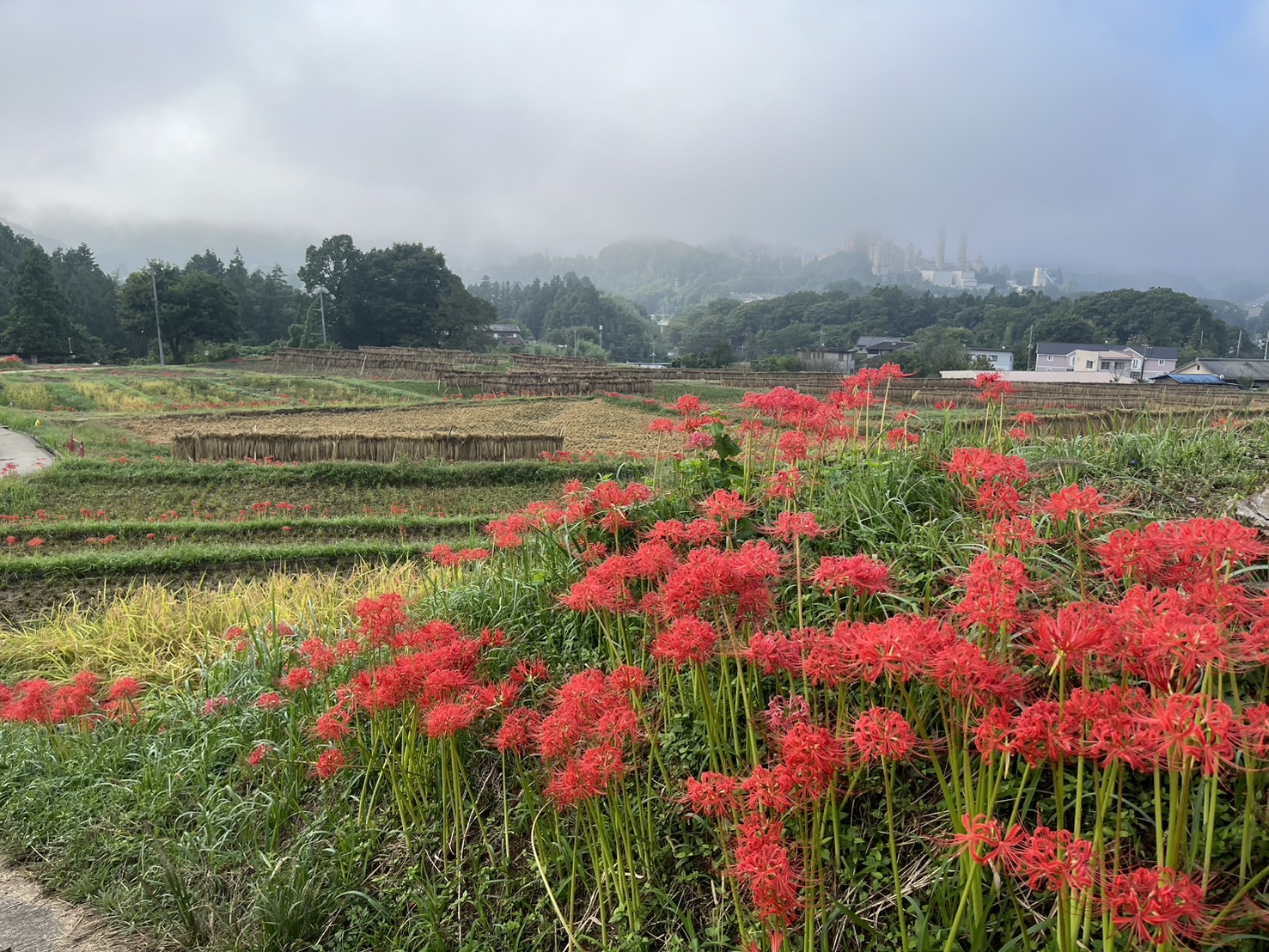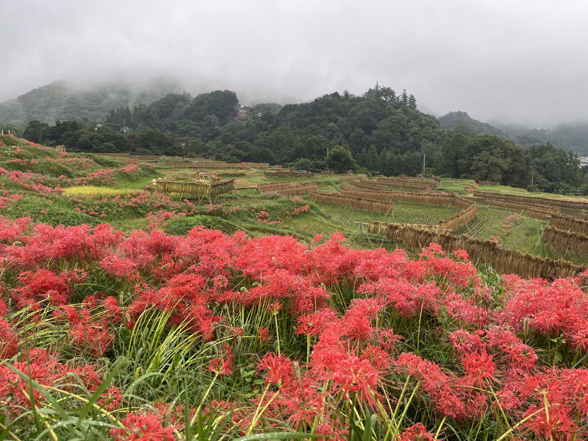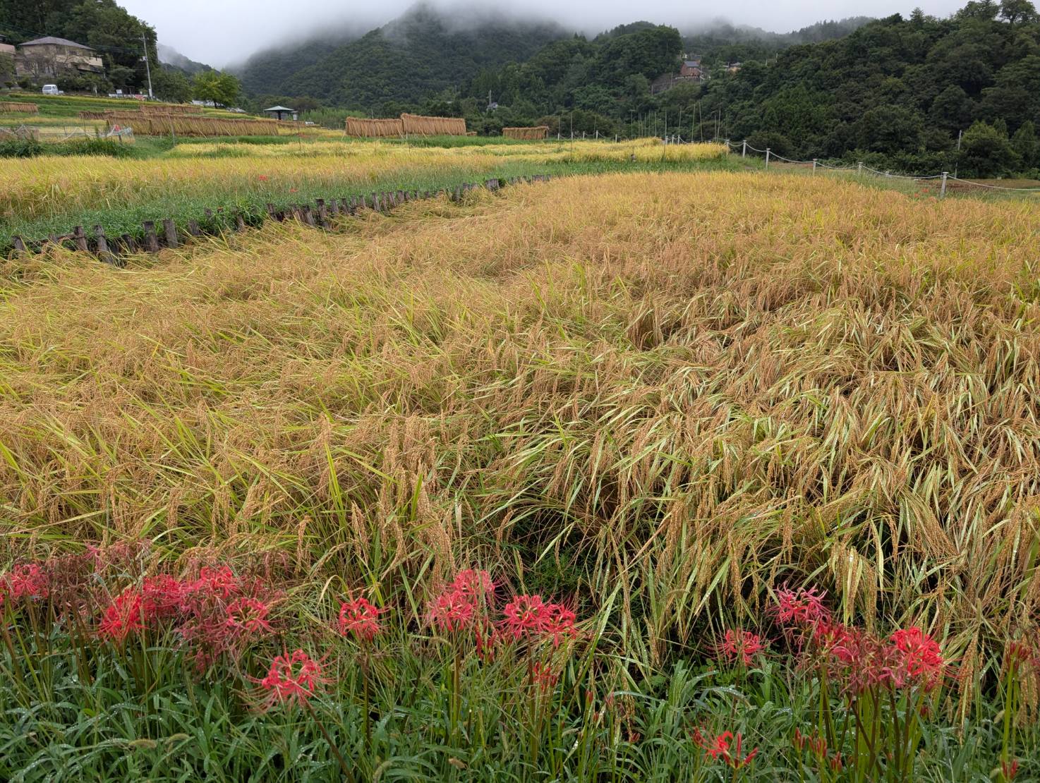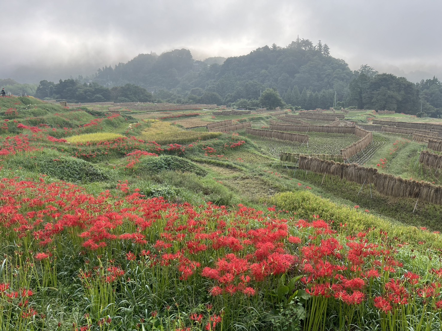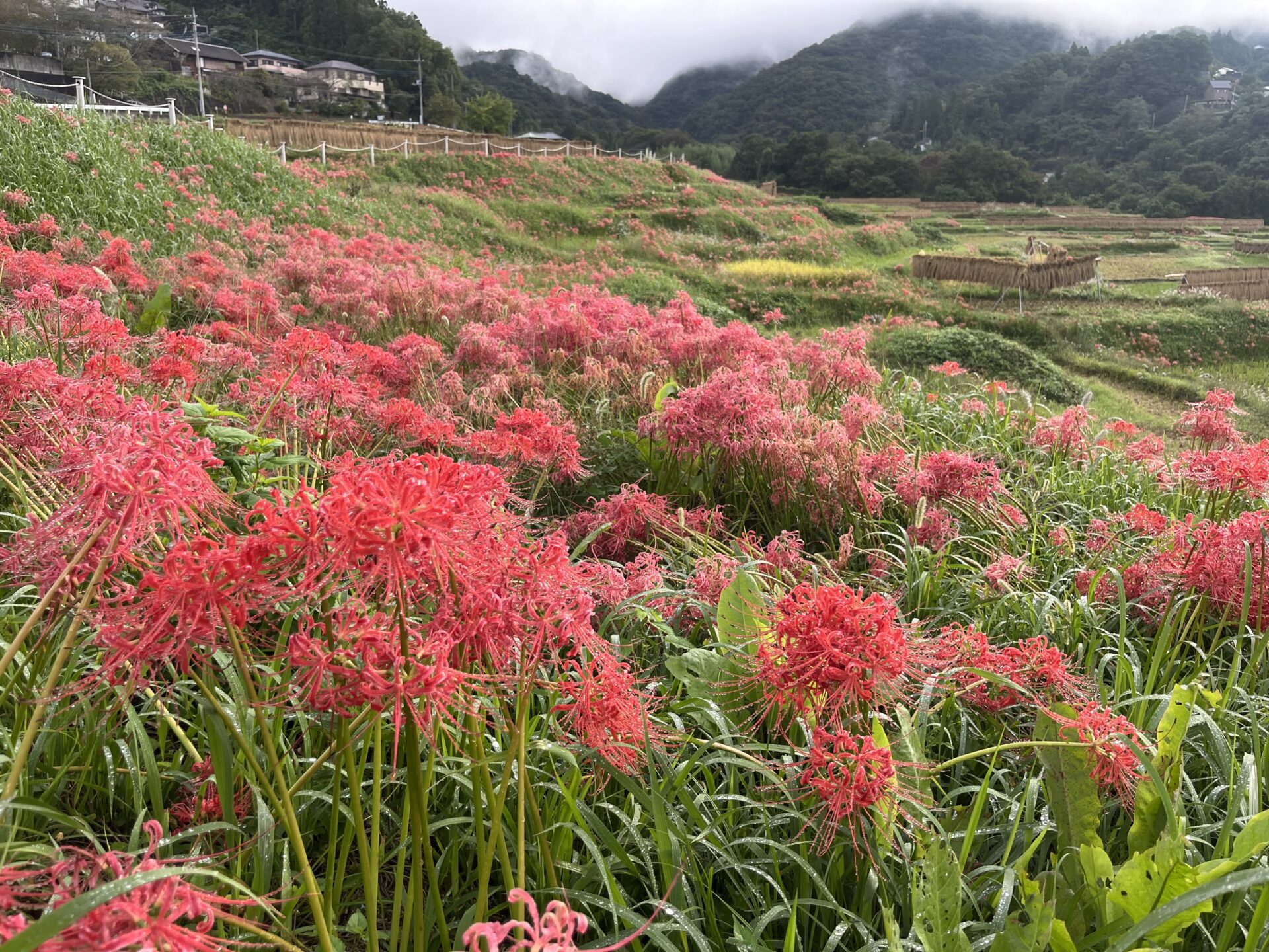 色褪せた花も目立ち始めましたが、写真のように色鮮やかな彼岸花と棚田のコラボも、まだ楽しめます。