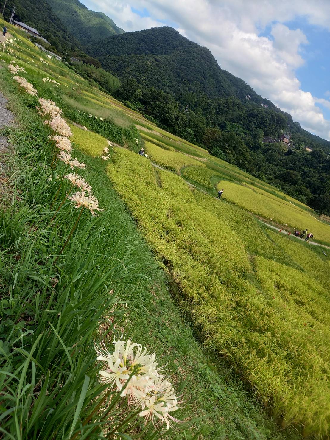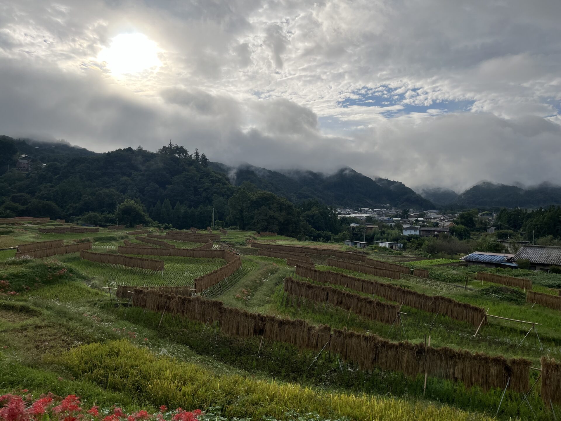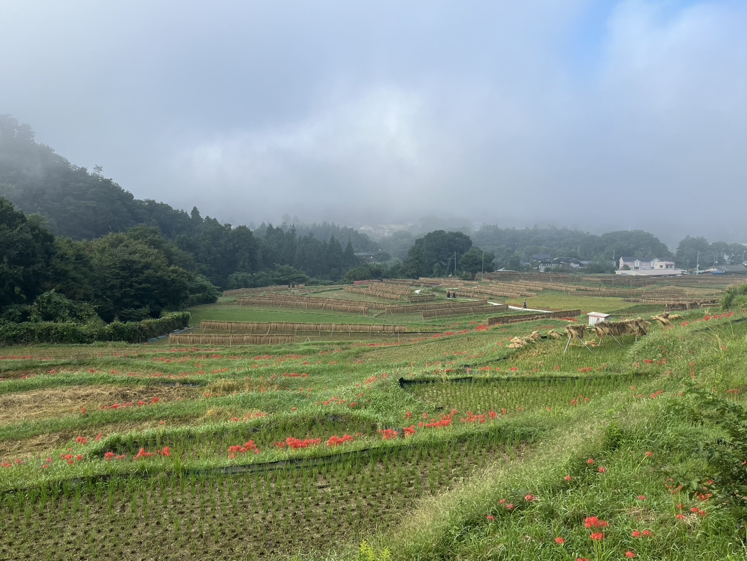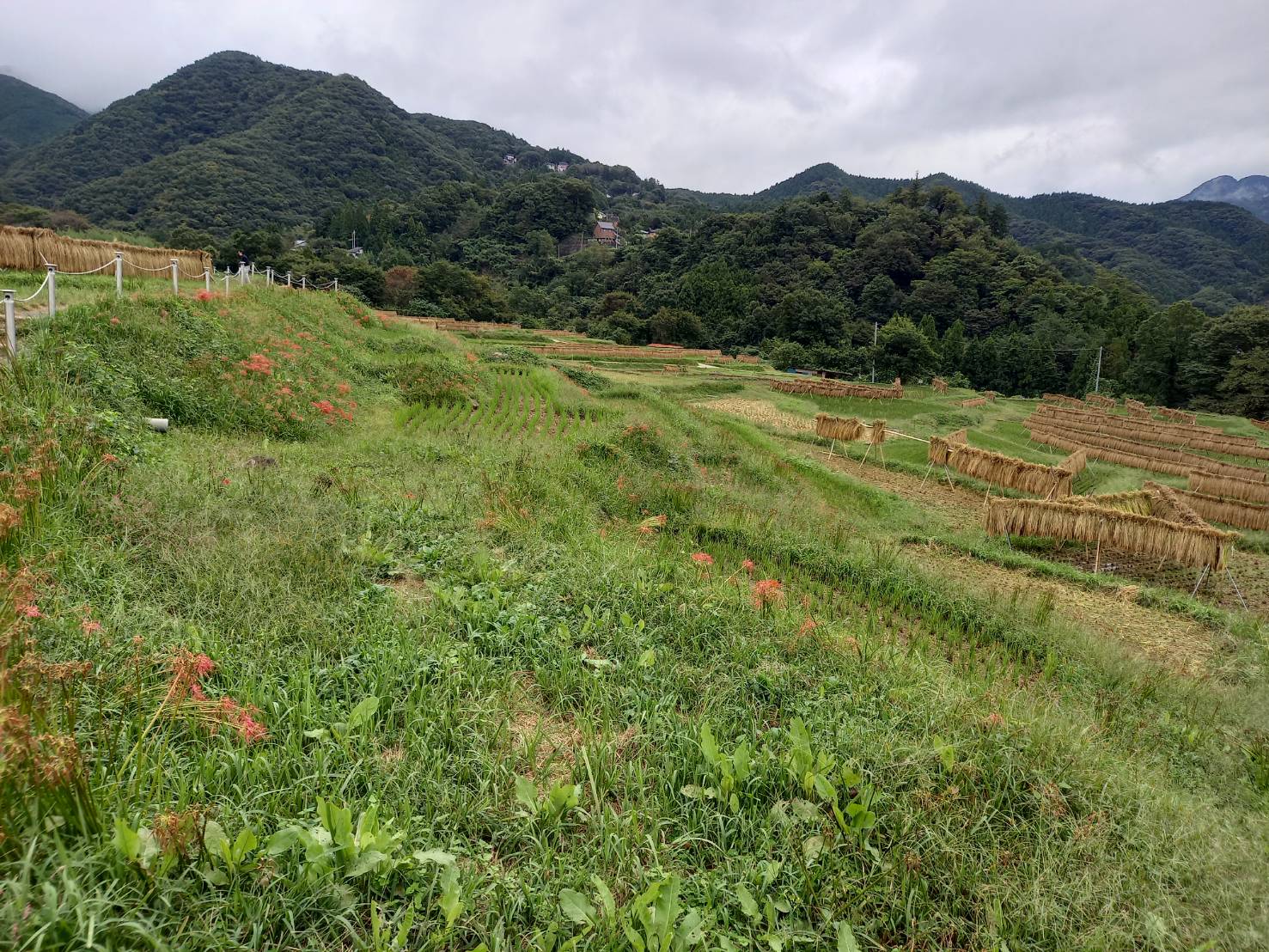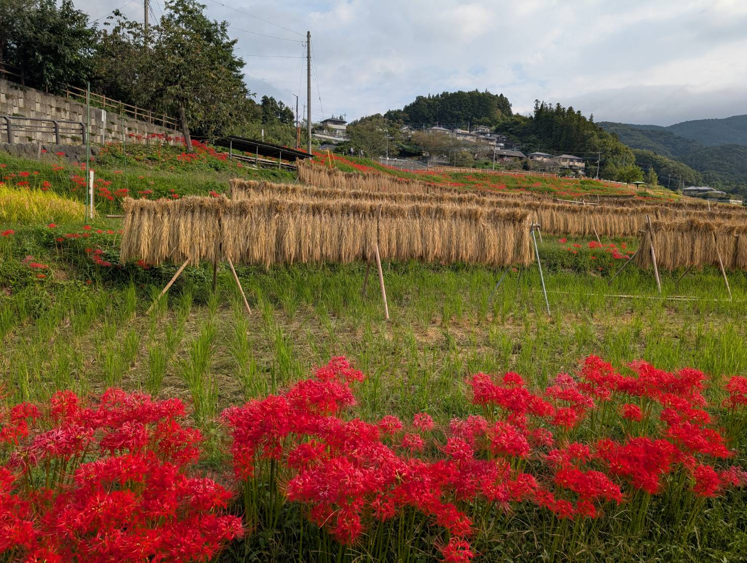 色褪せた花も目立ち始めましたが、写真のように色鮮やかな彼岸花と棚田のコラボも、まだ楽しめます。