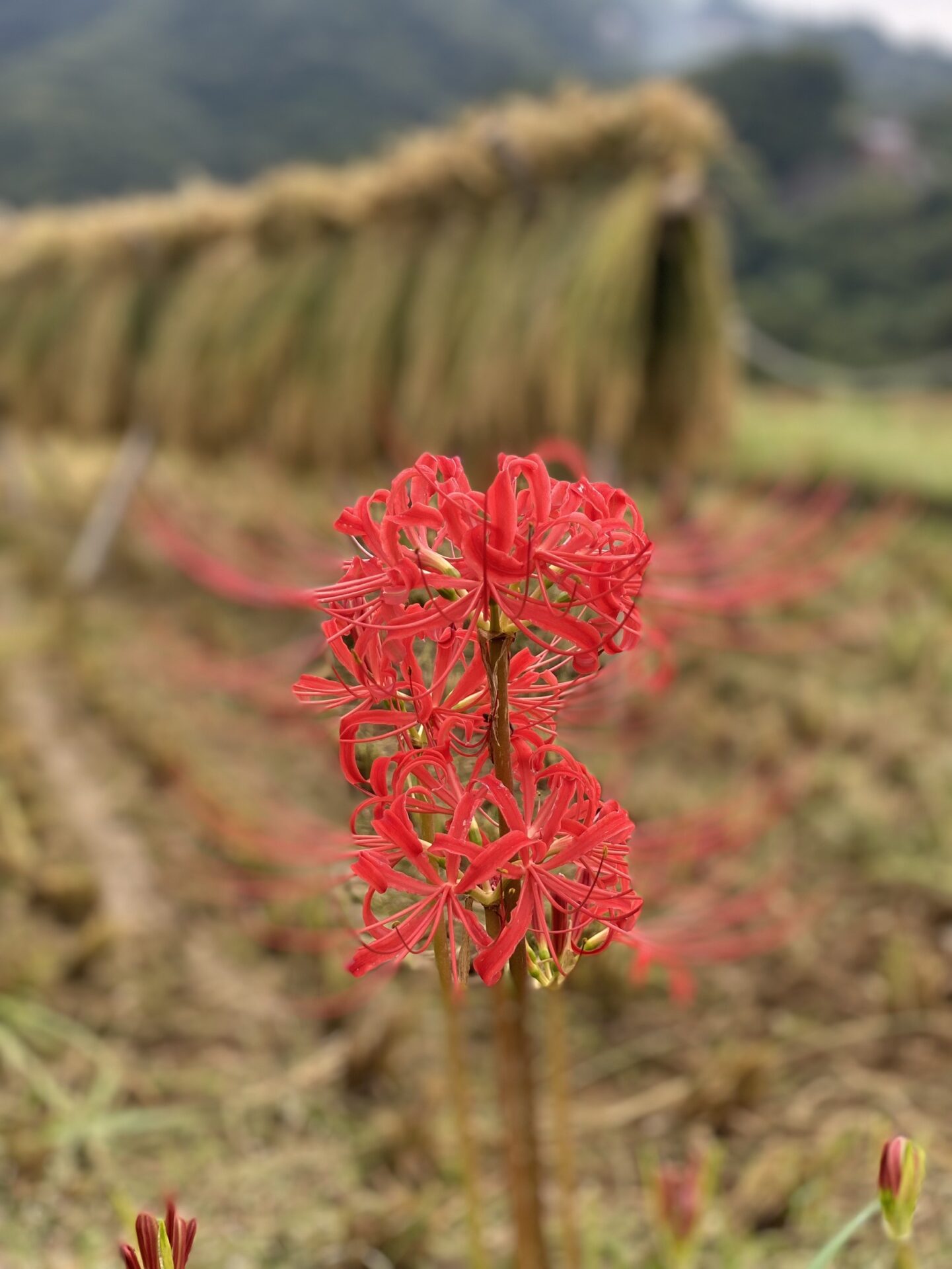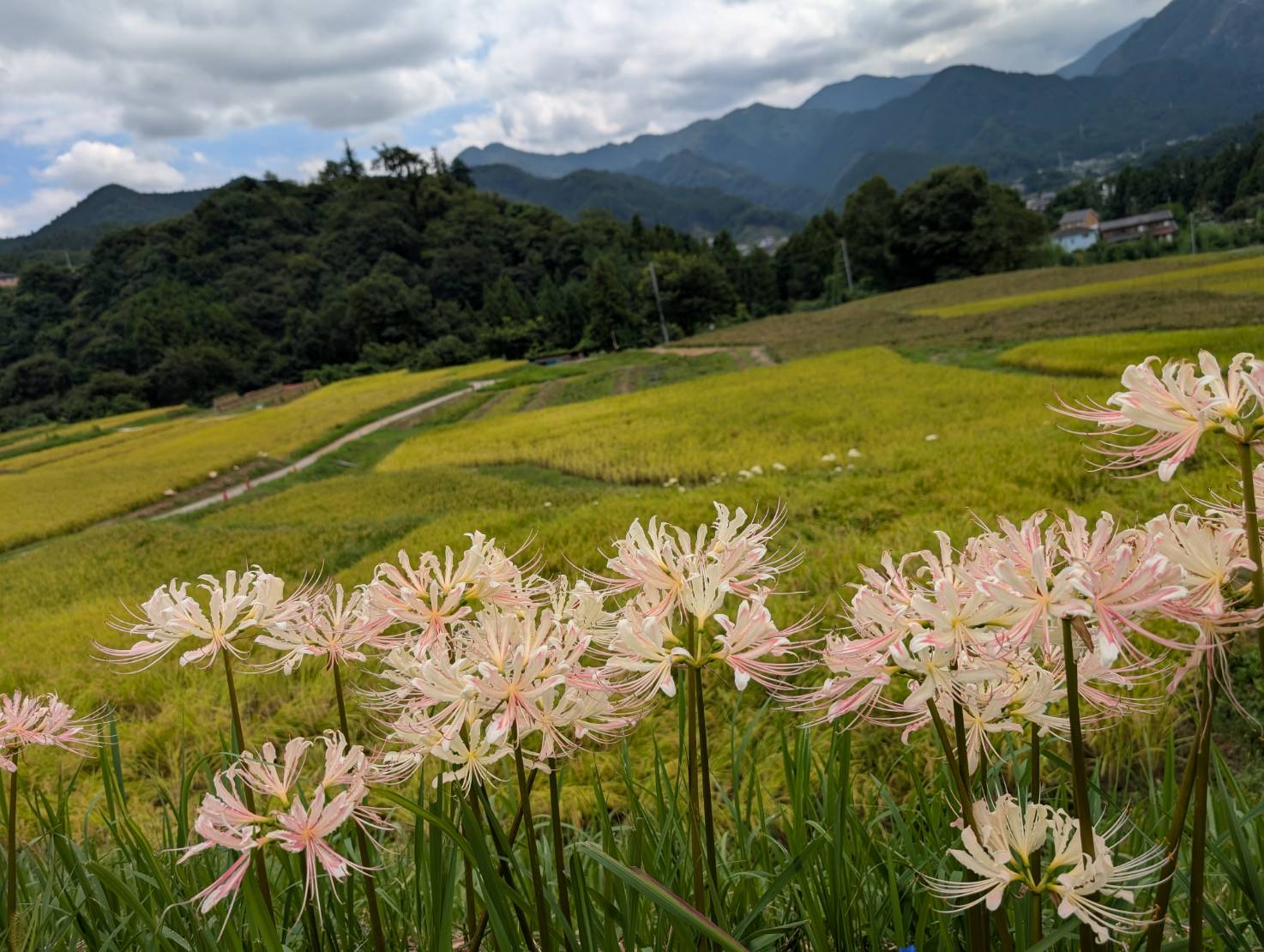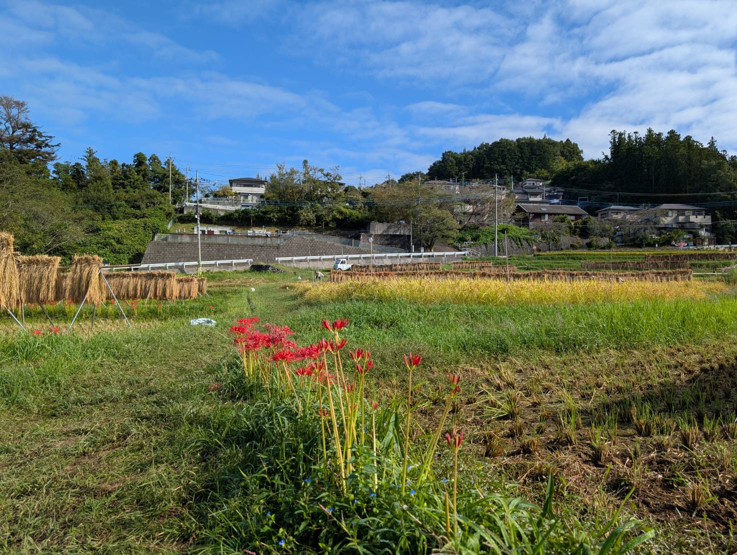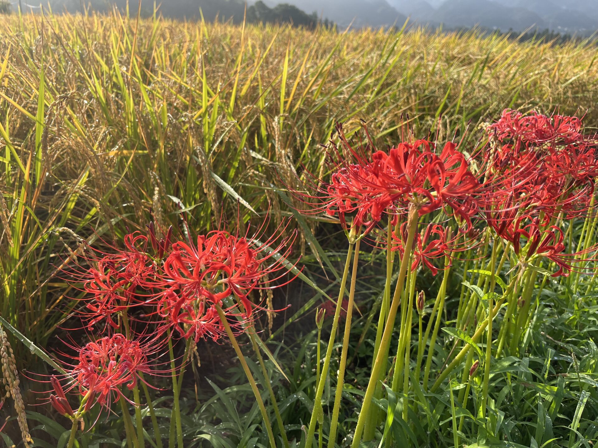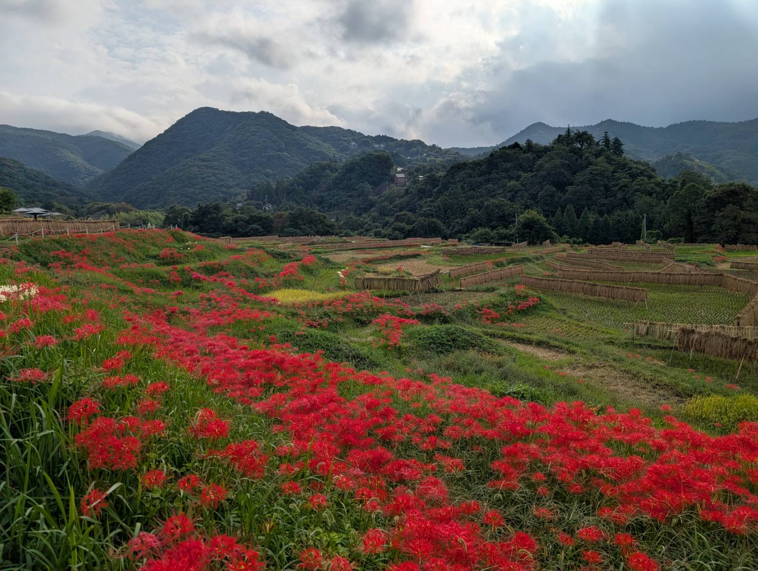 色褪せた花も目立ち始めましたが、写真のように色鮮やかな彼岸花と棚田のコラボも、まだ楽しめます。
