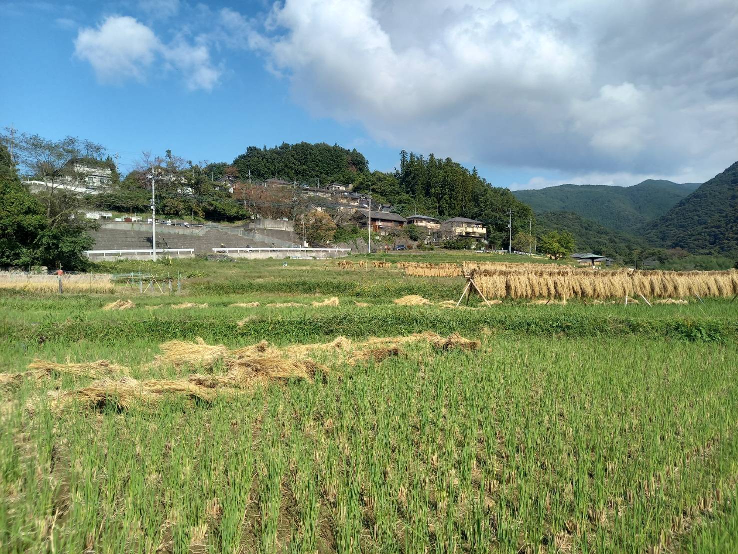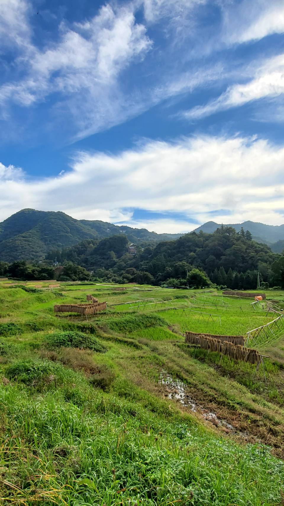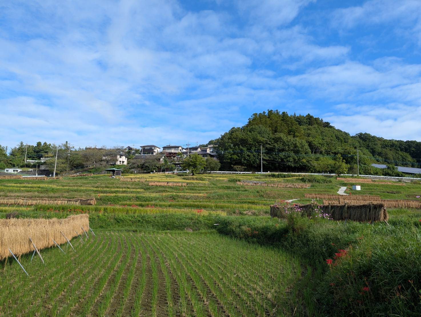 晴れていたので、稲刈り後のはぜかけから外したのを見かけました。四季折々の景色を楽しめる棚田の風景です。