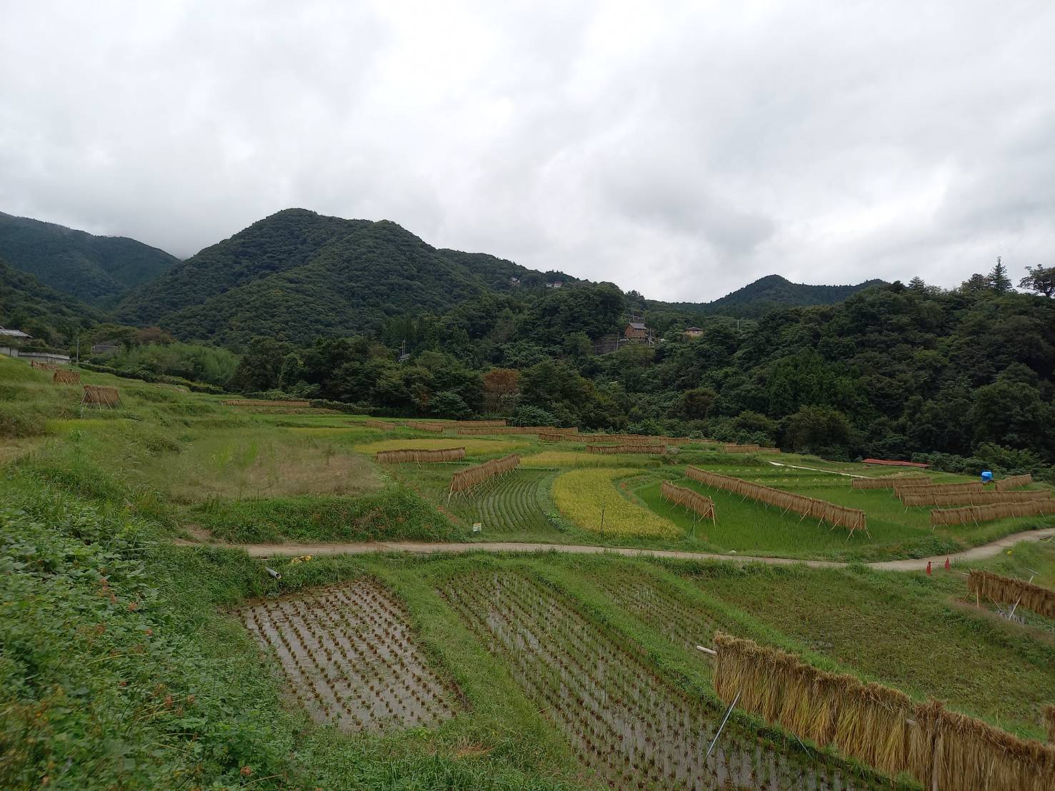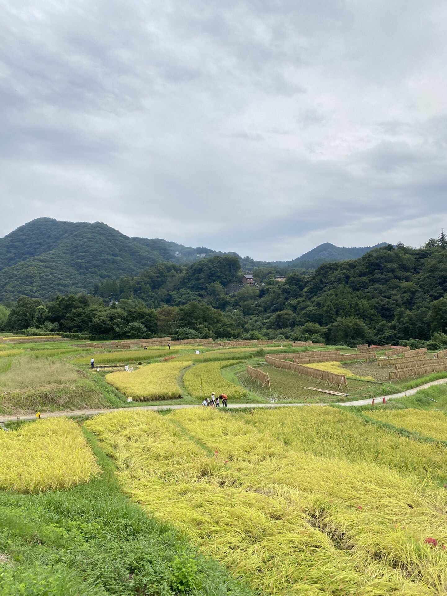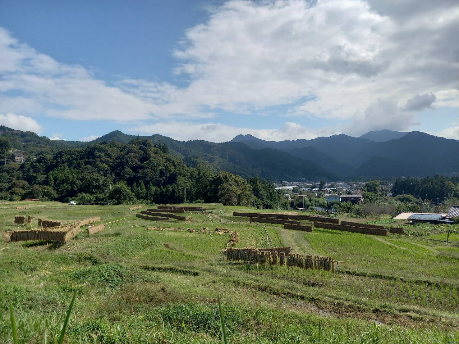 晴れていたので、稲刈り後のはぜかけから外したのを見かけました。四季折々の景色を楽しめる棚田の風景です。