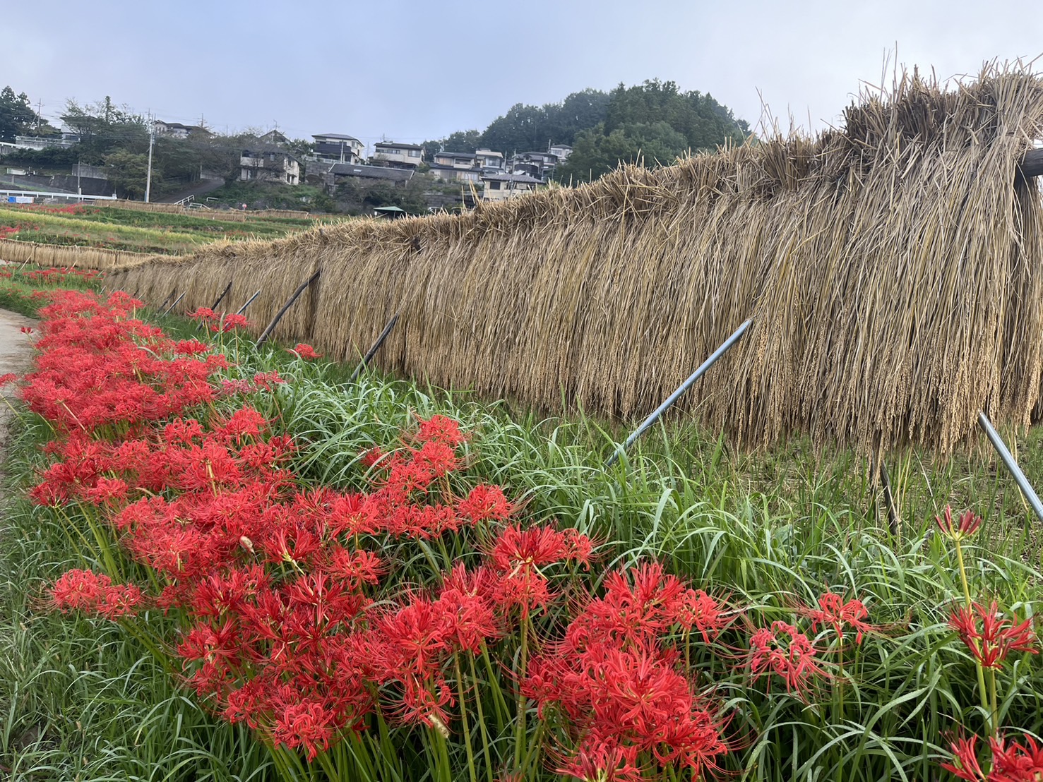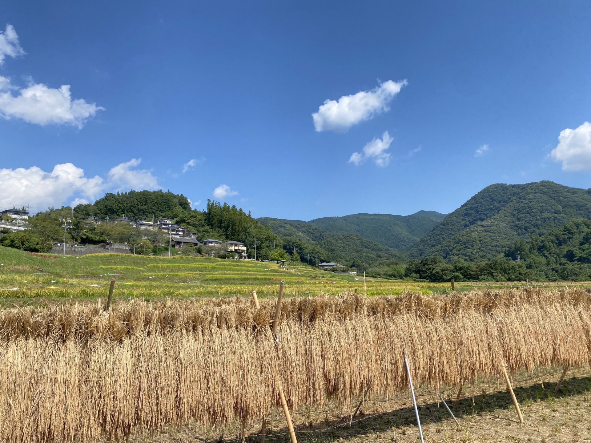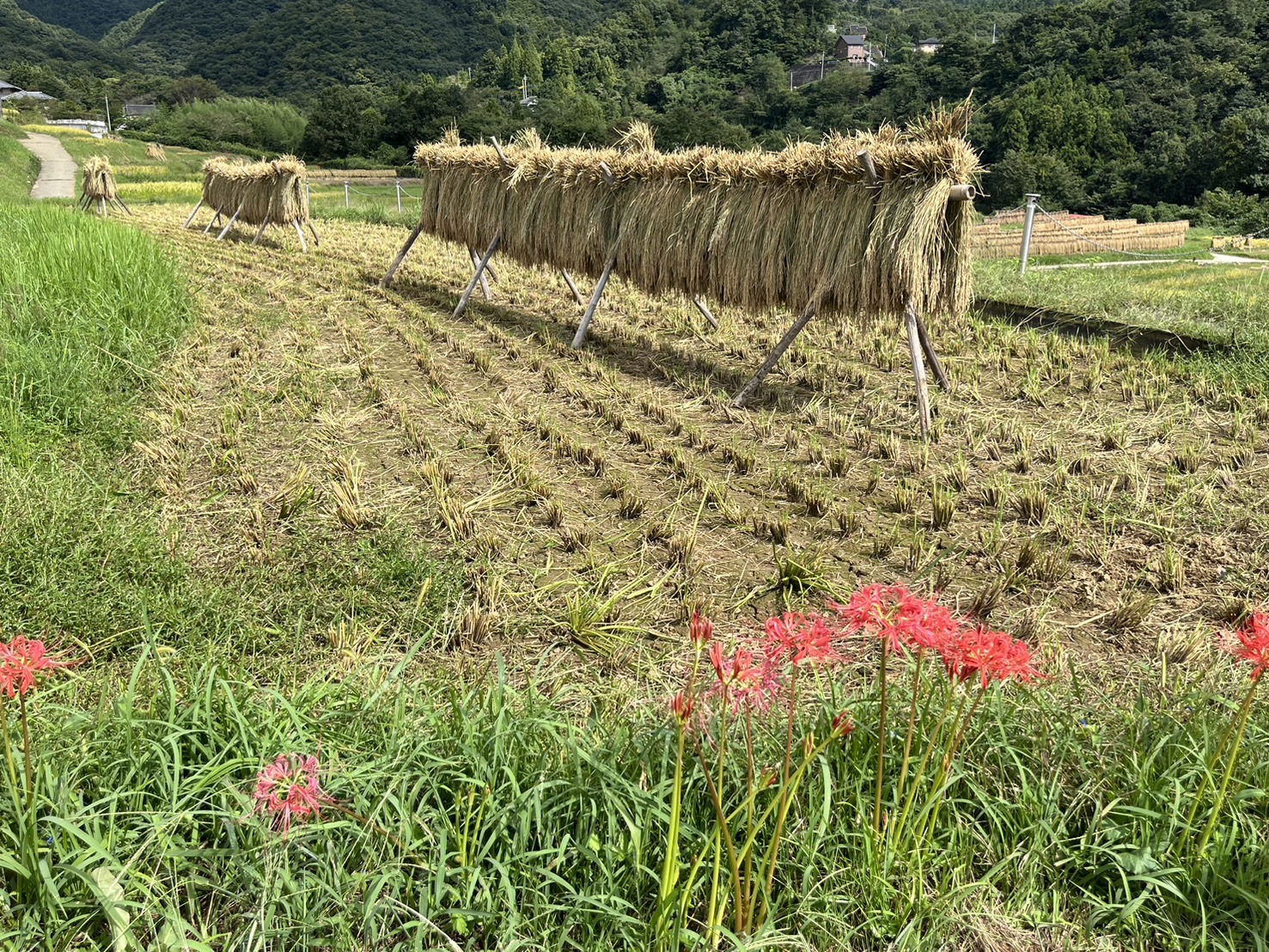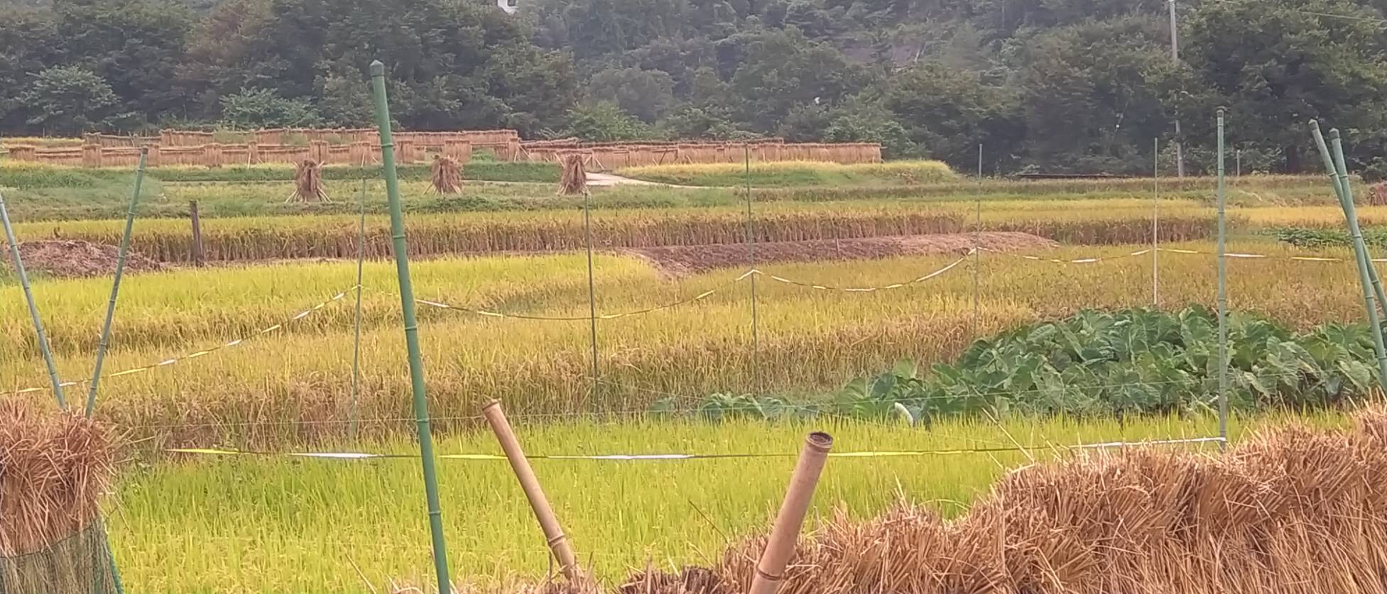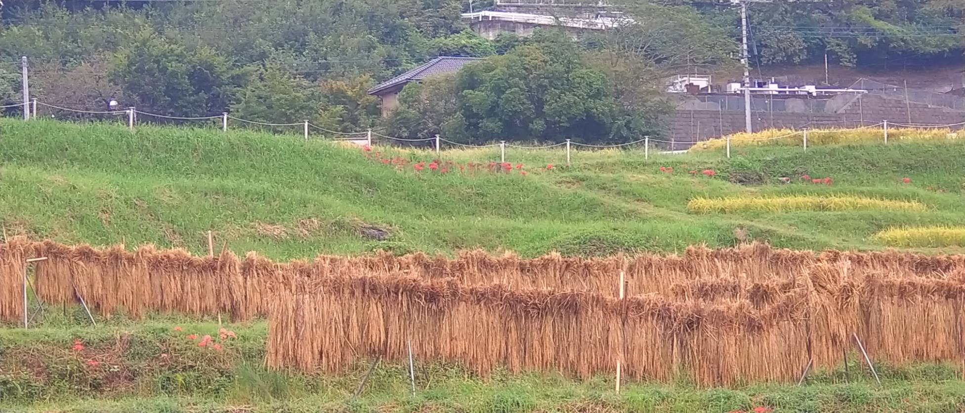 ハゼかけ(束ねた稲を棒などに架けて天日(太陽光線)と自然風によって乾燥させること)が情緒を感じさせます。
