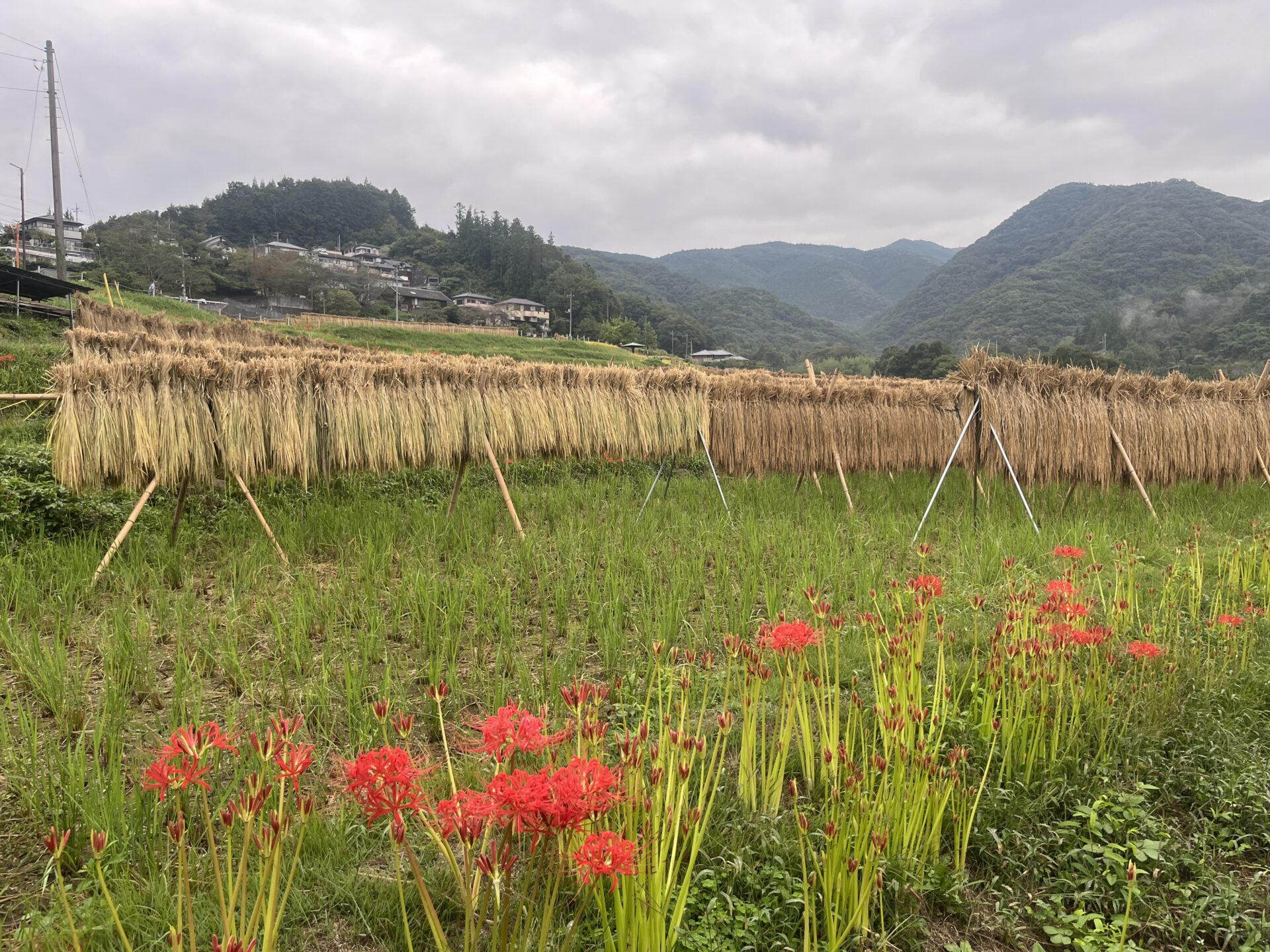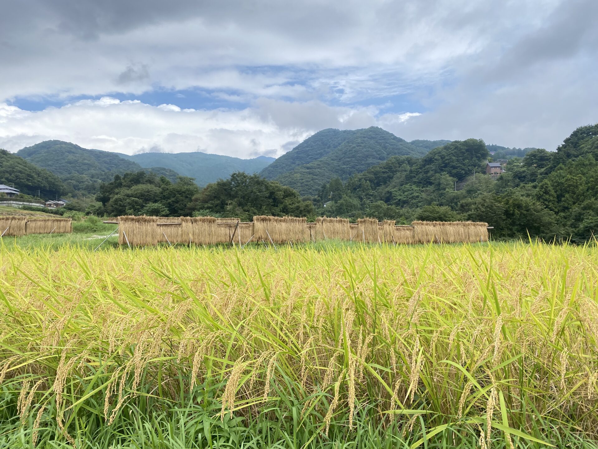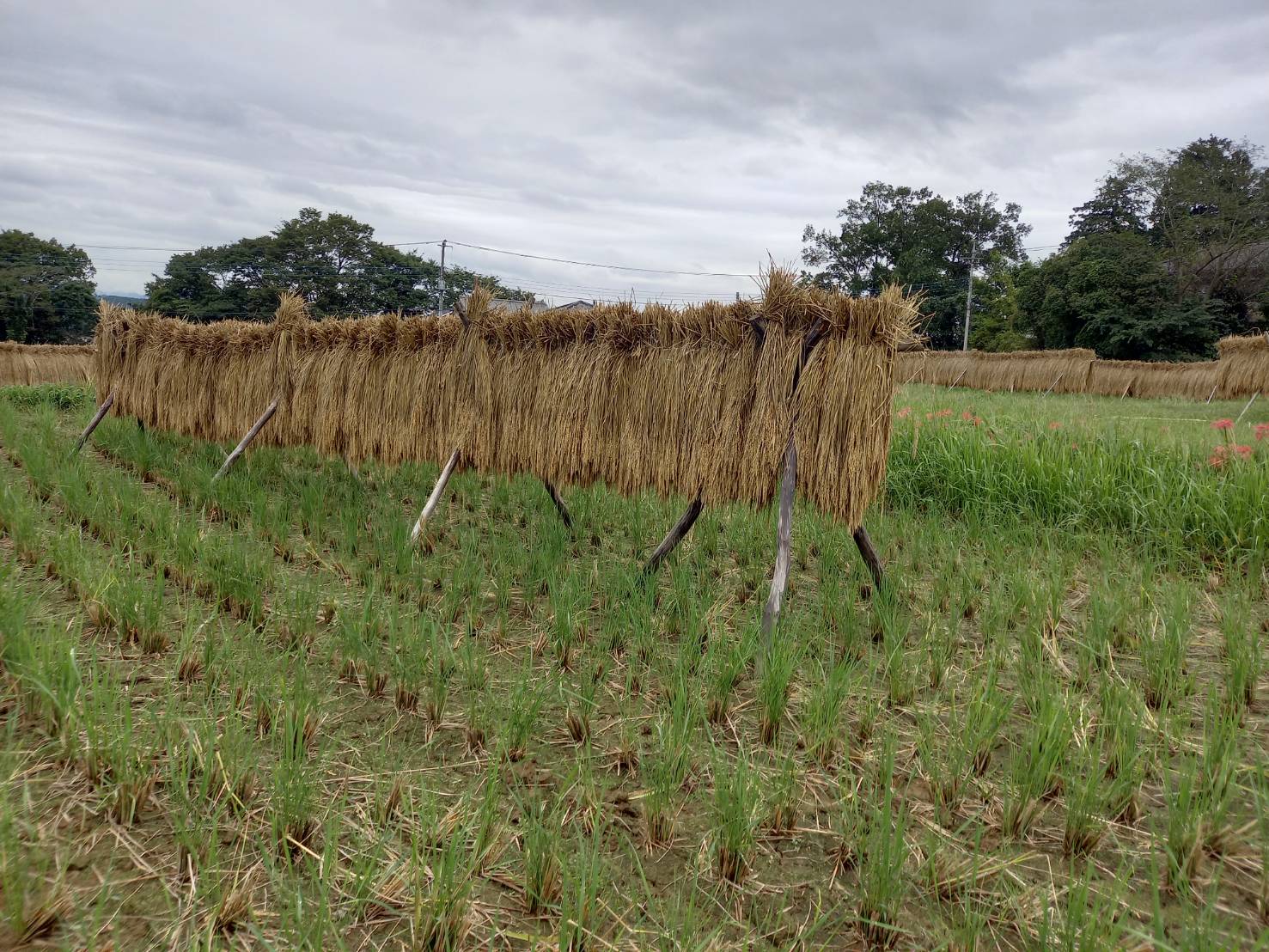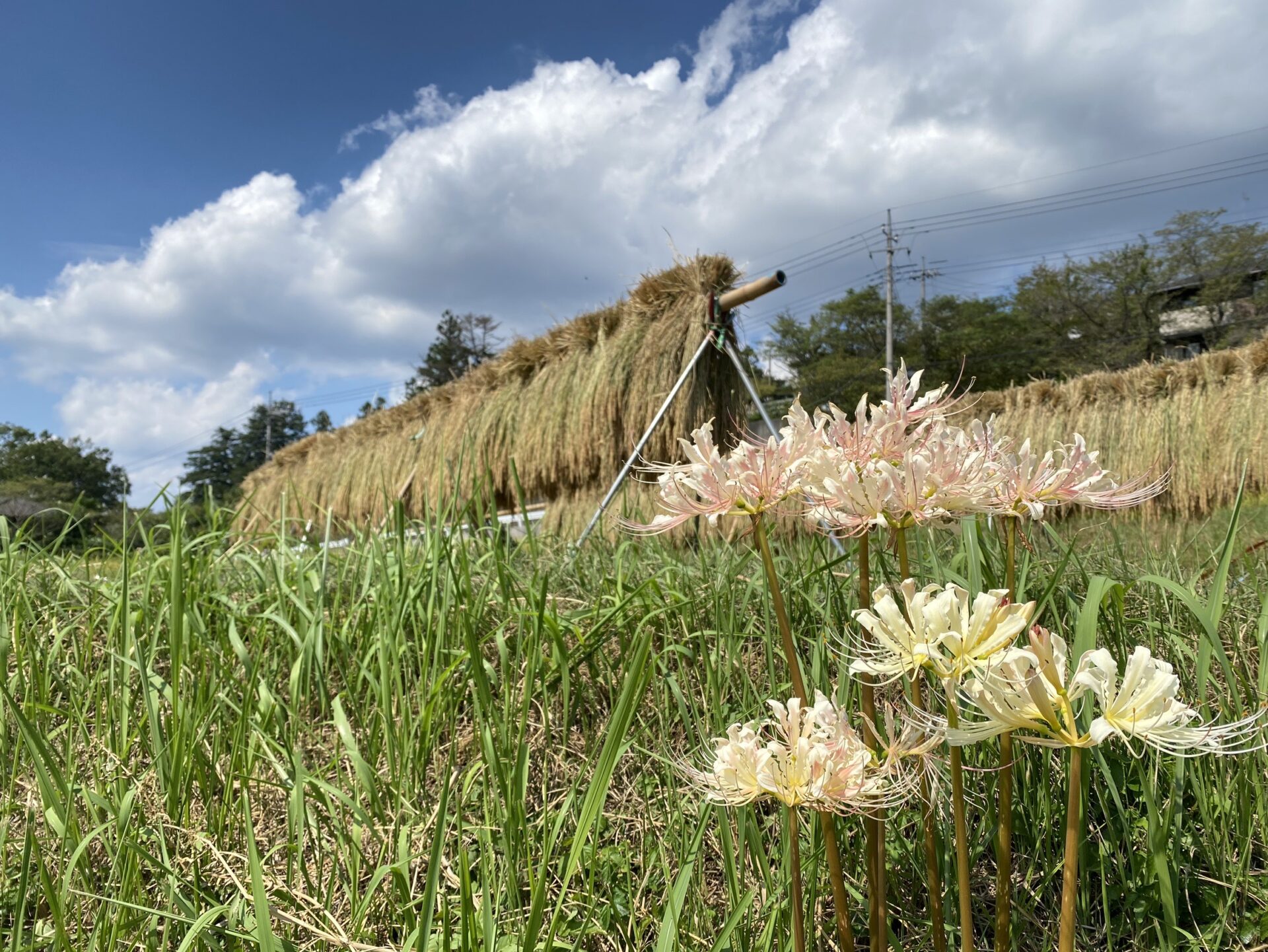 ハゼかけ(束ねた稲を棒などに架けて天日(太陽光線)と自然風によって乾燥させること)が情緒を感じさせます。