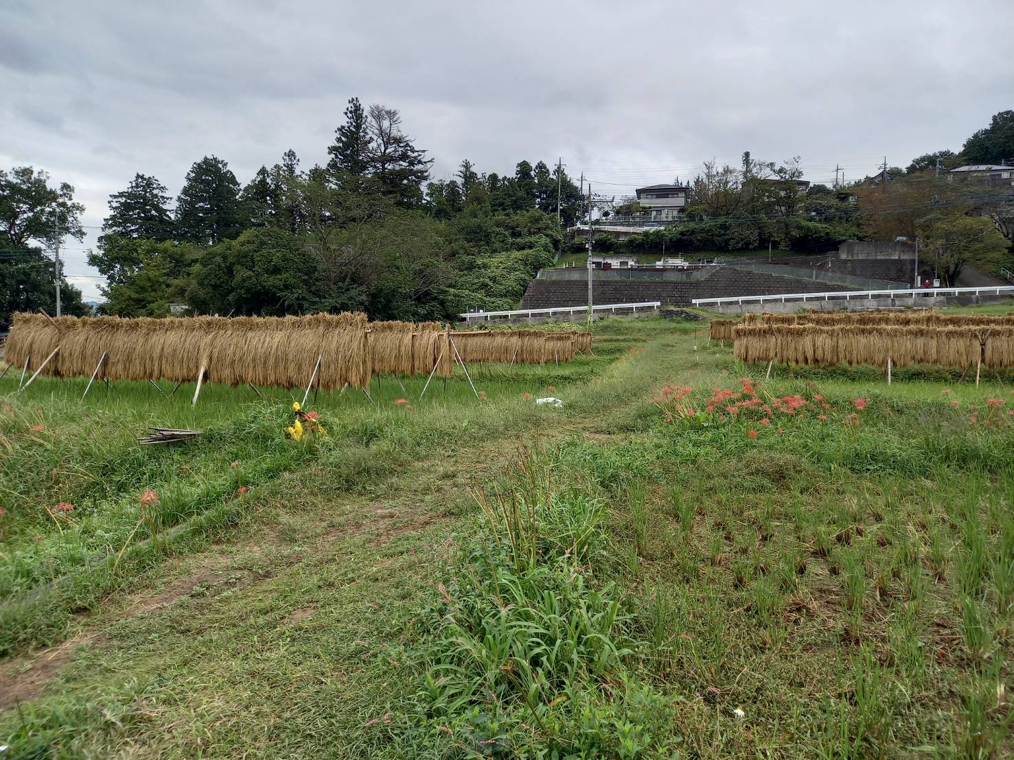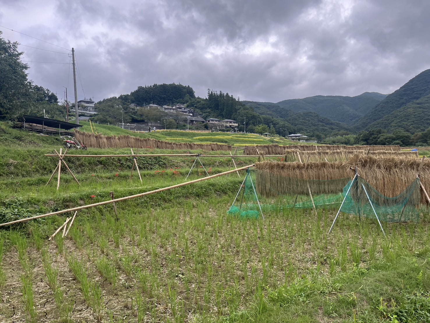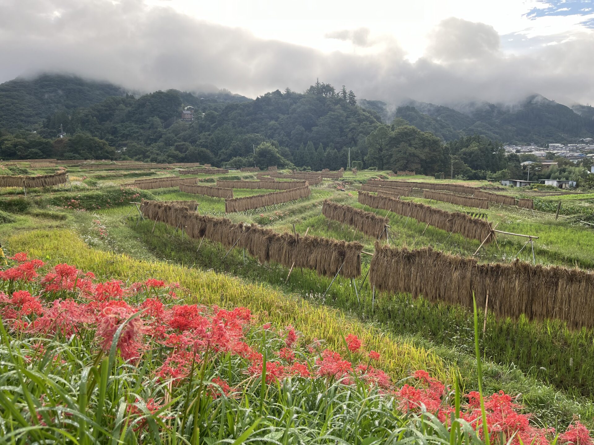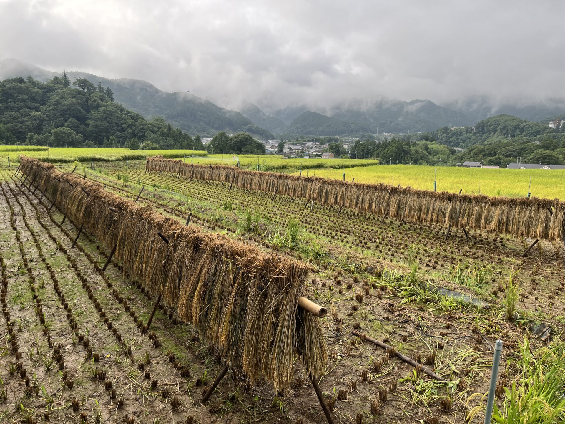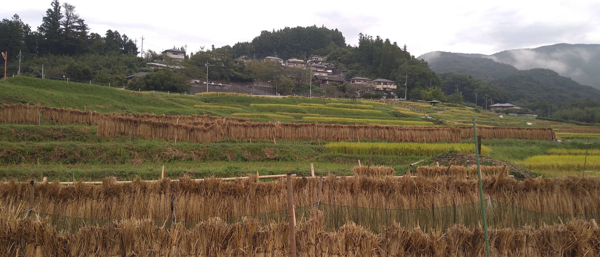 ハゼかけ(束ねた稲を棒などに架けて天日(太陽光線)と自然風によって乾燥させること)が情緒を感じさせます。