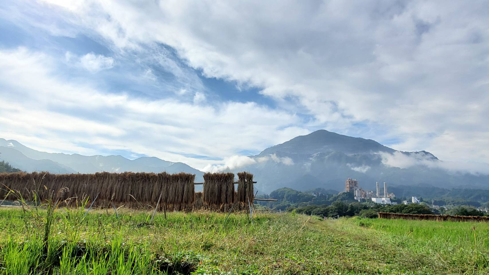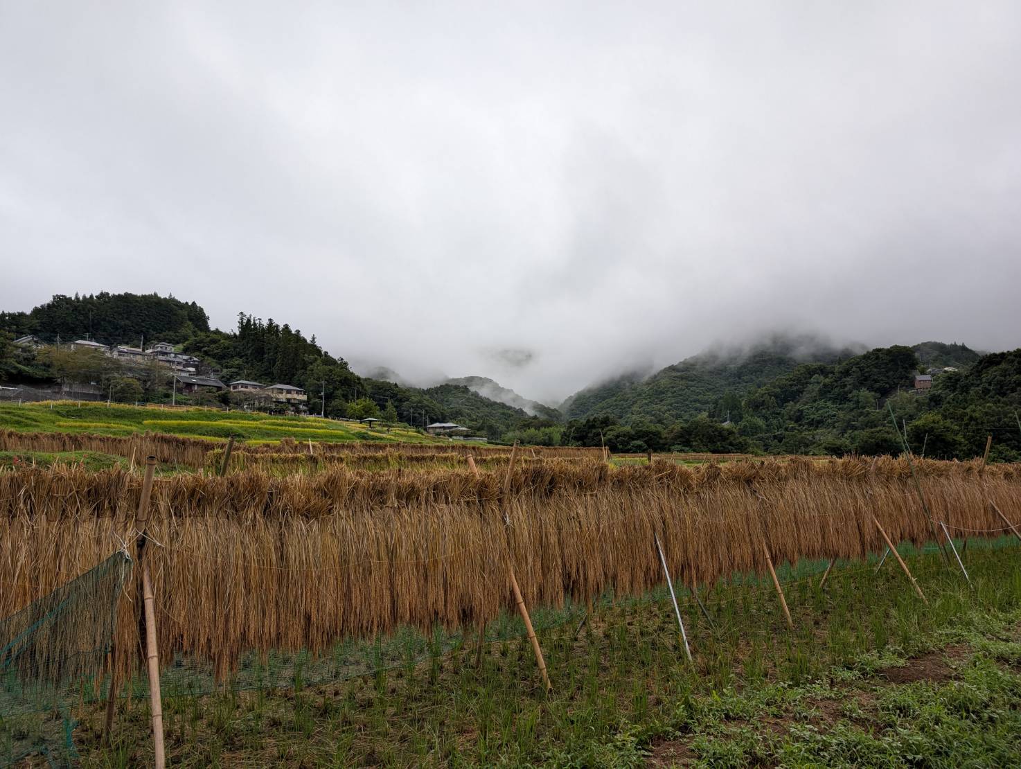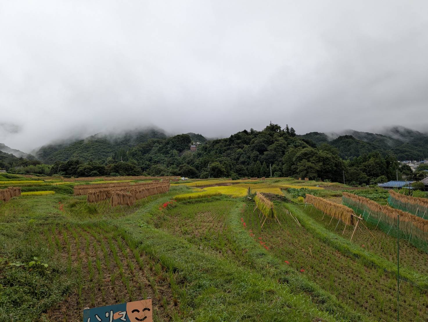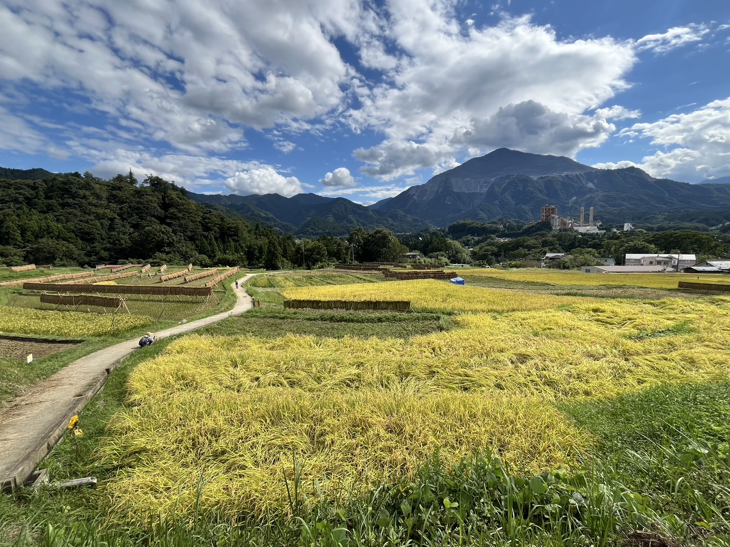 ハゼかけ(束ねた稲を棒などに架けて天日(太陽光線)と自然風によって乾燥させること)が情緒を感じさせます。