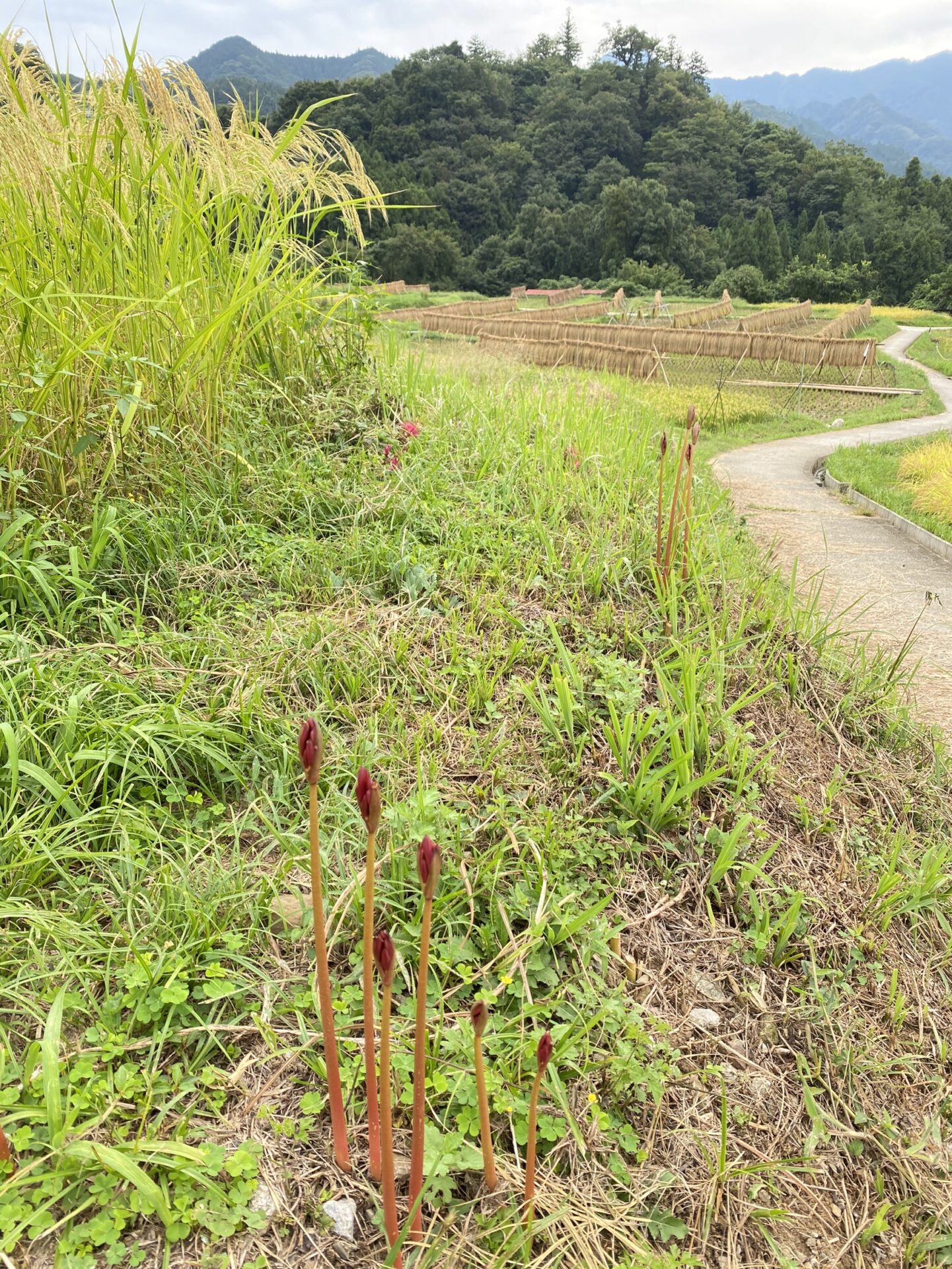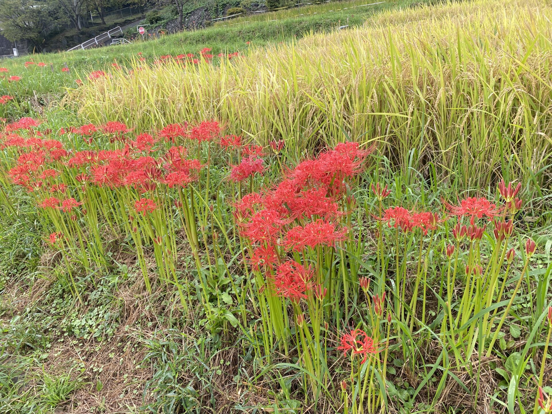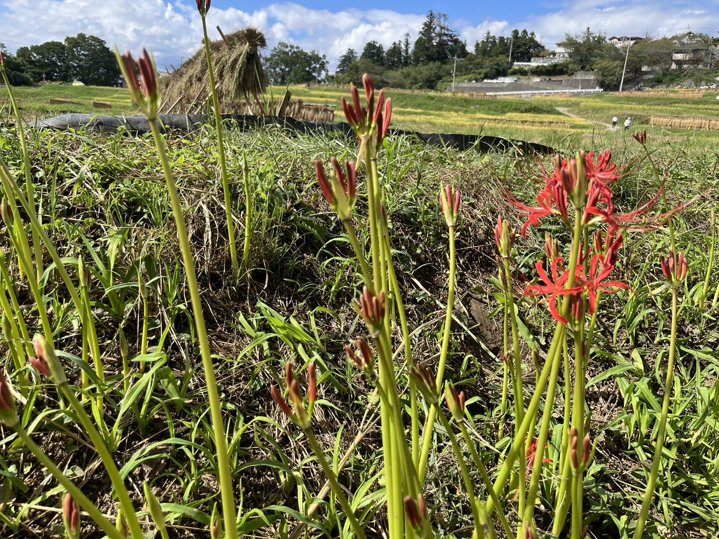 現在は一部の箇所に赤紫色の彼岸花が咲いているだけです。畦に咲く彼岸花の開花(見ごろ)はもう少し先になりそうです。
