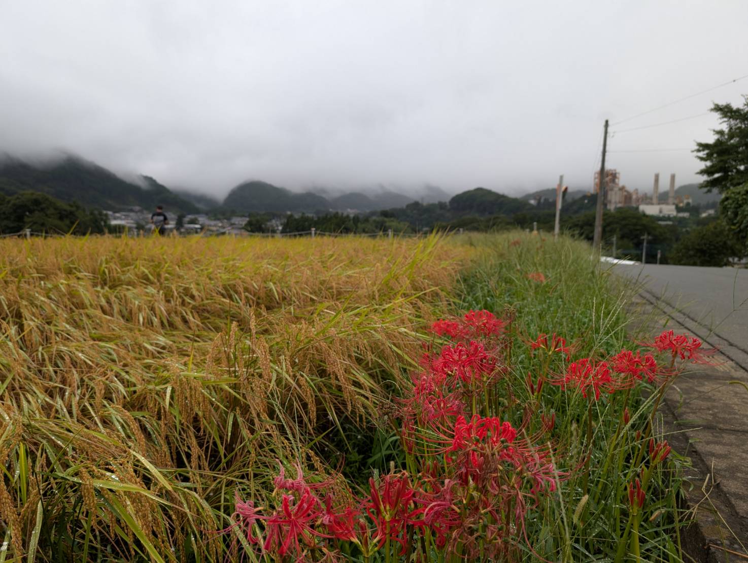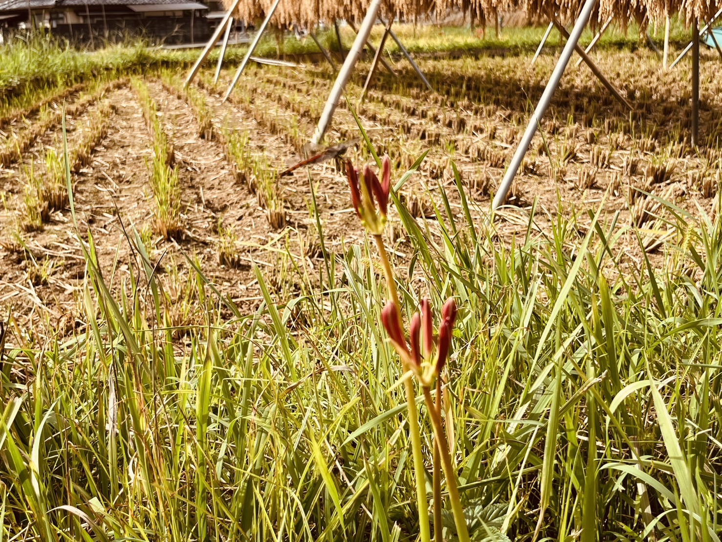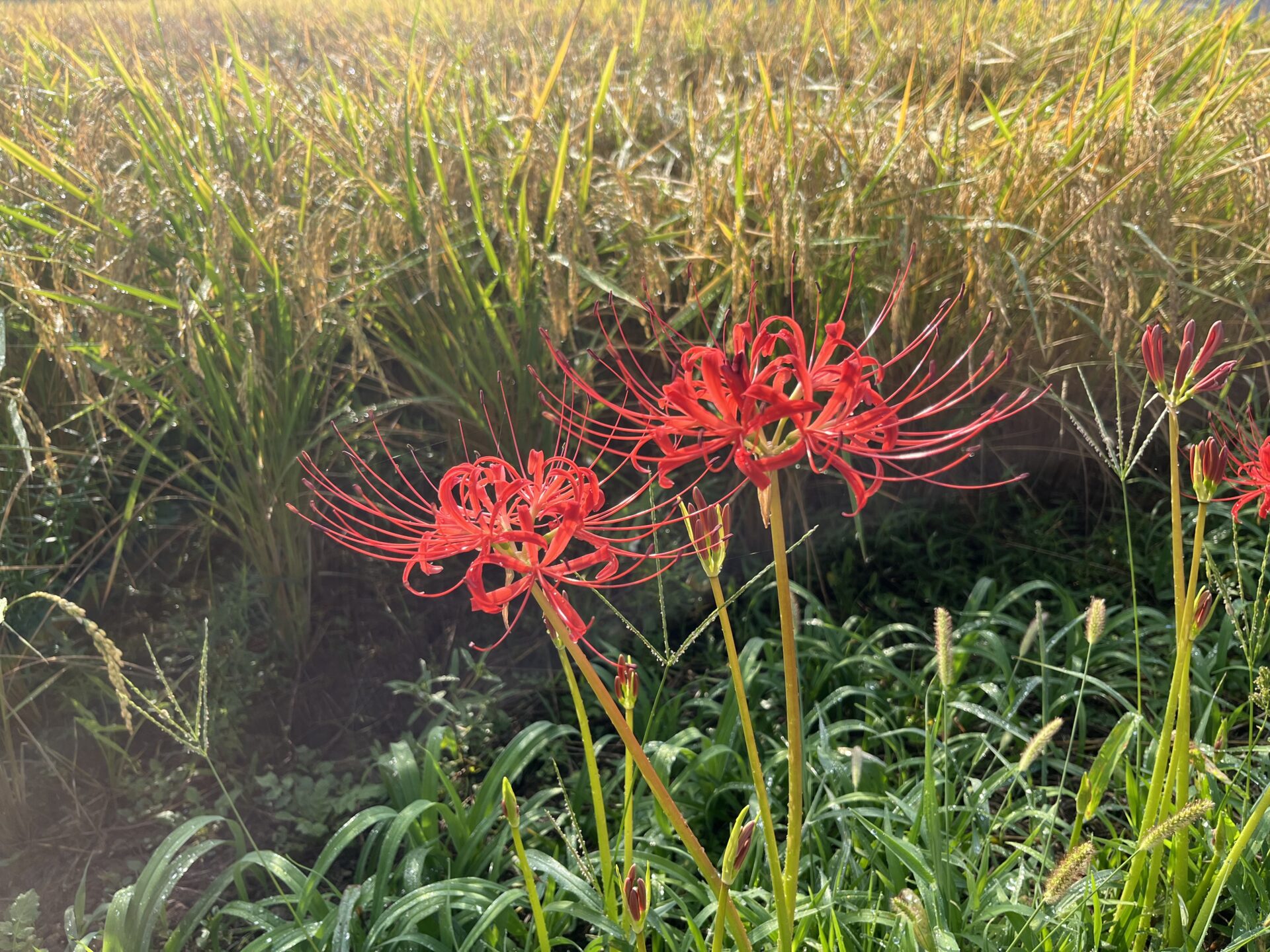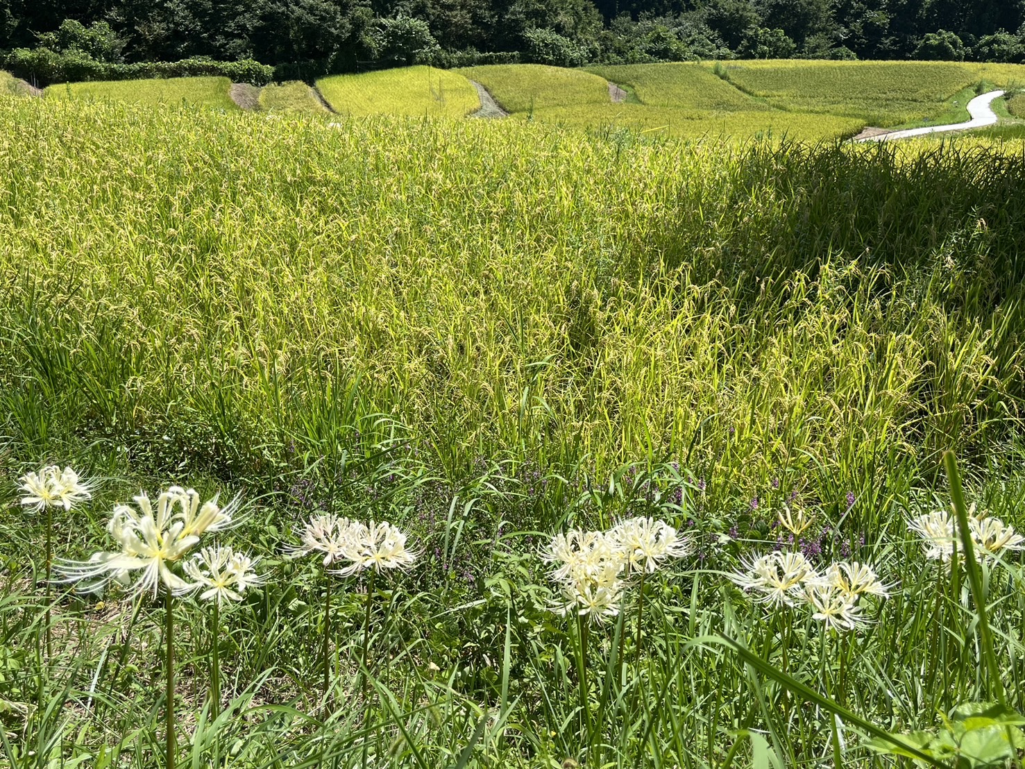 現在は一部の箇所に赤紫色の彼岸花が咲いているだけです。畦に咲く彼岸花の開花(見ごろ)はもう少し先になりそうです。