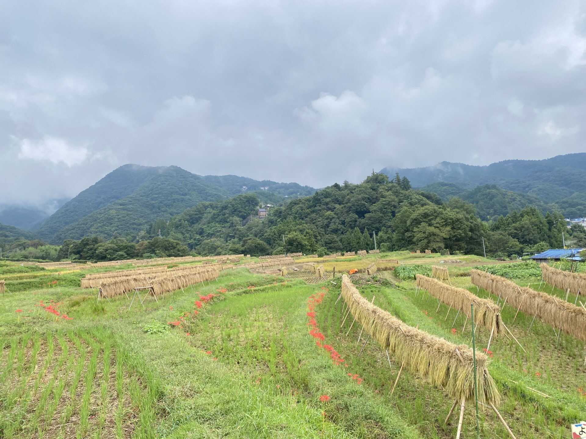 彼岸花の見ごろは過ぎておりますが、稲刈り後のはぜかけの風景が楽しめます。立ち位置によっては360度はぜかけの風景を楽しめ、この季節ならではの壮観な風景。秋の寺坂棚田の風景をお楽しみください。