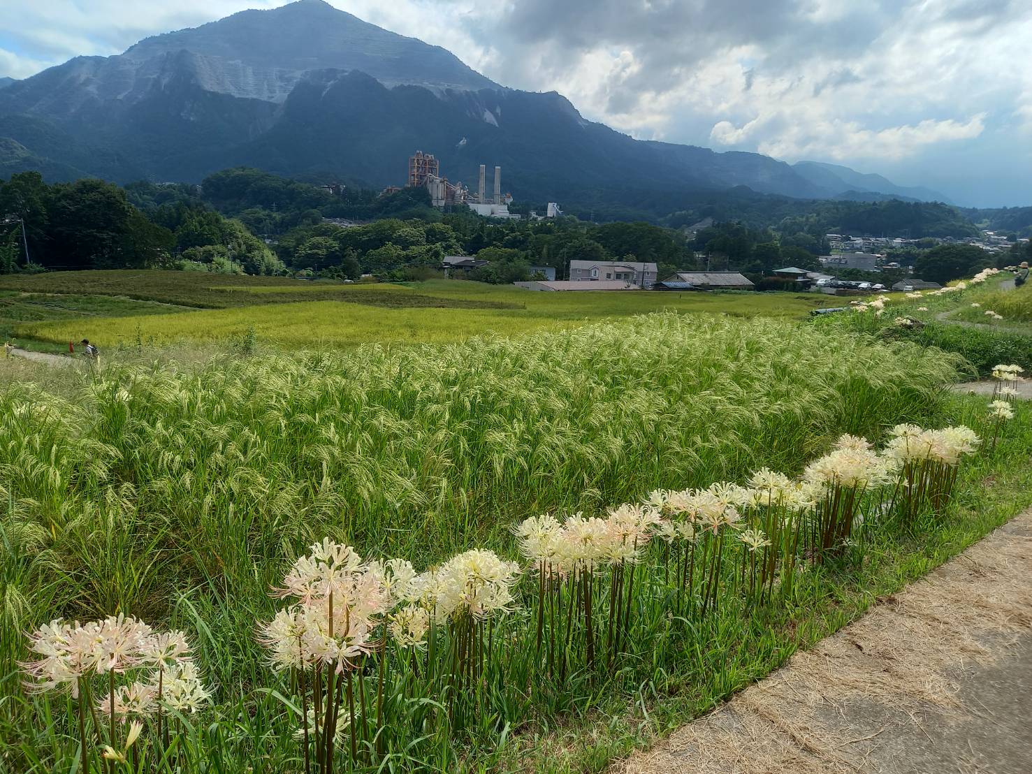本日の様子です。朱色の彼岸花の開花に備え、見ごろが過ぎた白い彼岸花は刈り取られております。