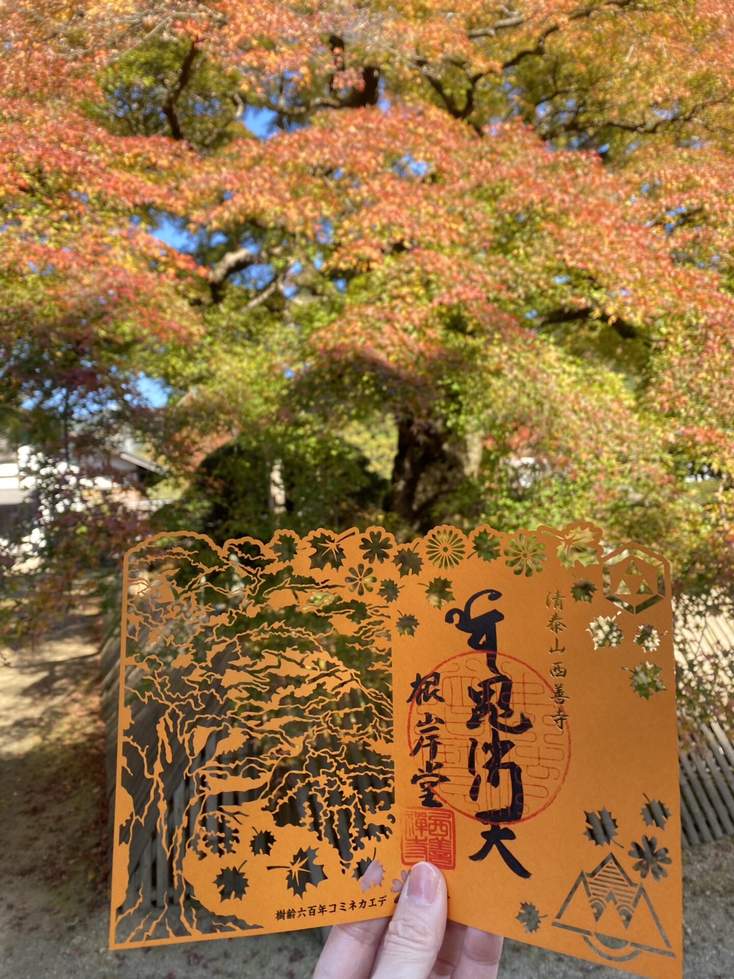 県指定天然記念物コミネカエデ(樹齢約600年)の巨樹の荘厳な風情や、恋愛成就のご利益のある夫婦龍、世界平和と万民救済の願いが込められた秩父大仏等、各寺らしさを繊細な切り絵で表現しております。