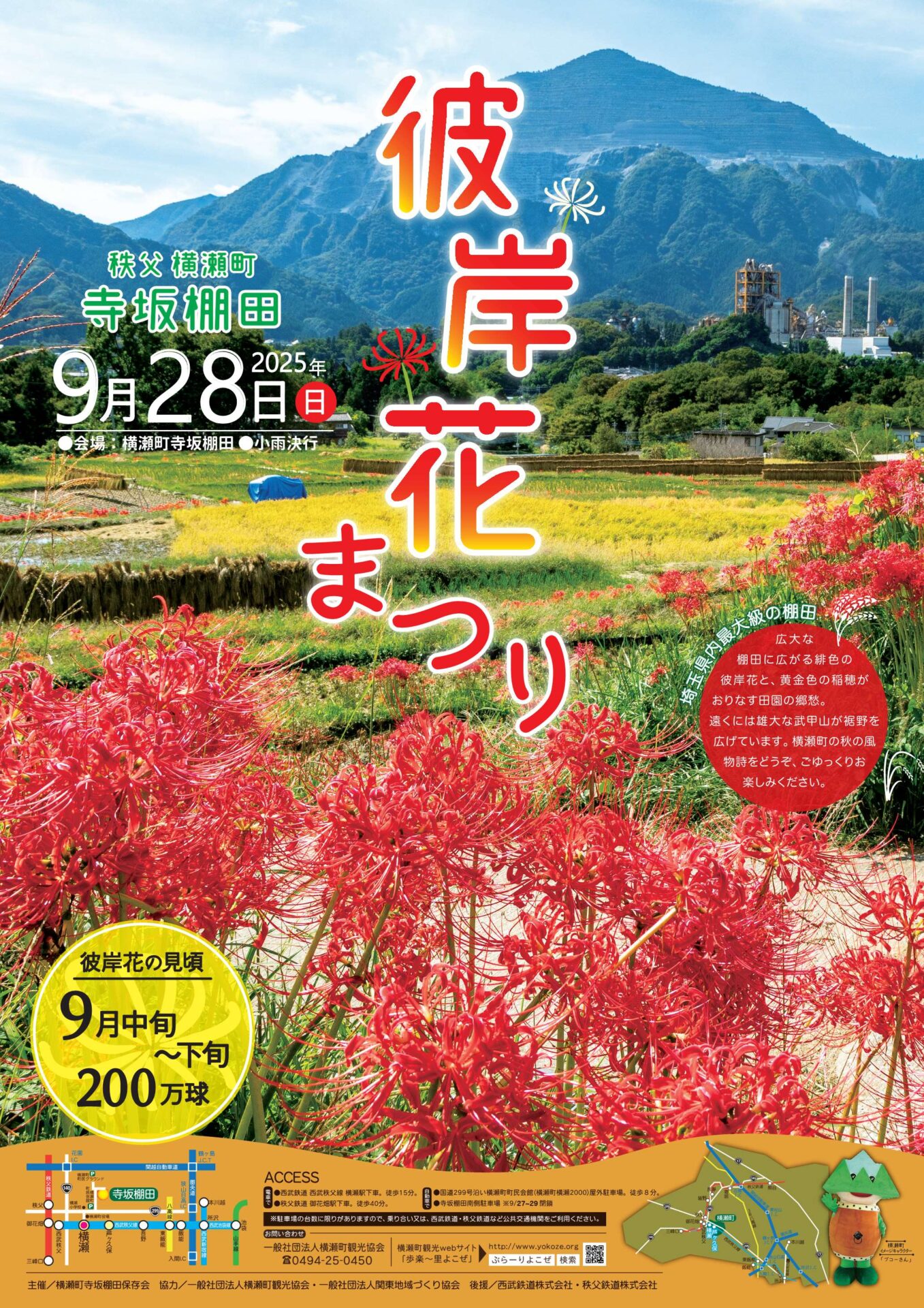 遠くには雄大な武甲山が裾野を広げています。横瀬町の秋の風物詩を、どうぞ、ごゆっくりお楽しみください。