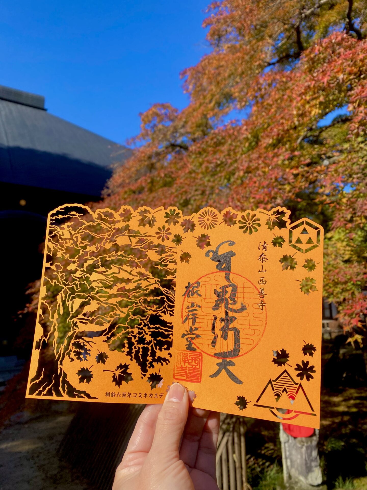 県指定天然記念物コミネカエデ(樹齢約600年)の巨樹の荘厳な風情や、恋愛成就のご利益のある夫婦龍、世界平和と万民救済の願いが込められた秩父大仏等、各寺らしさを繊細な切り絵で表現しております。