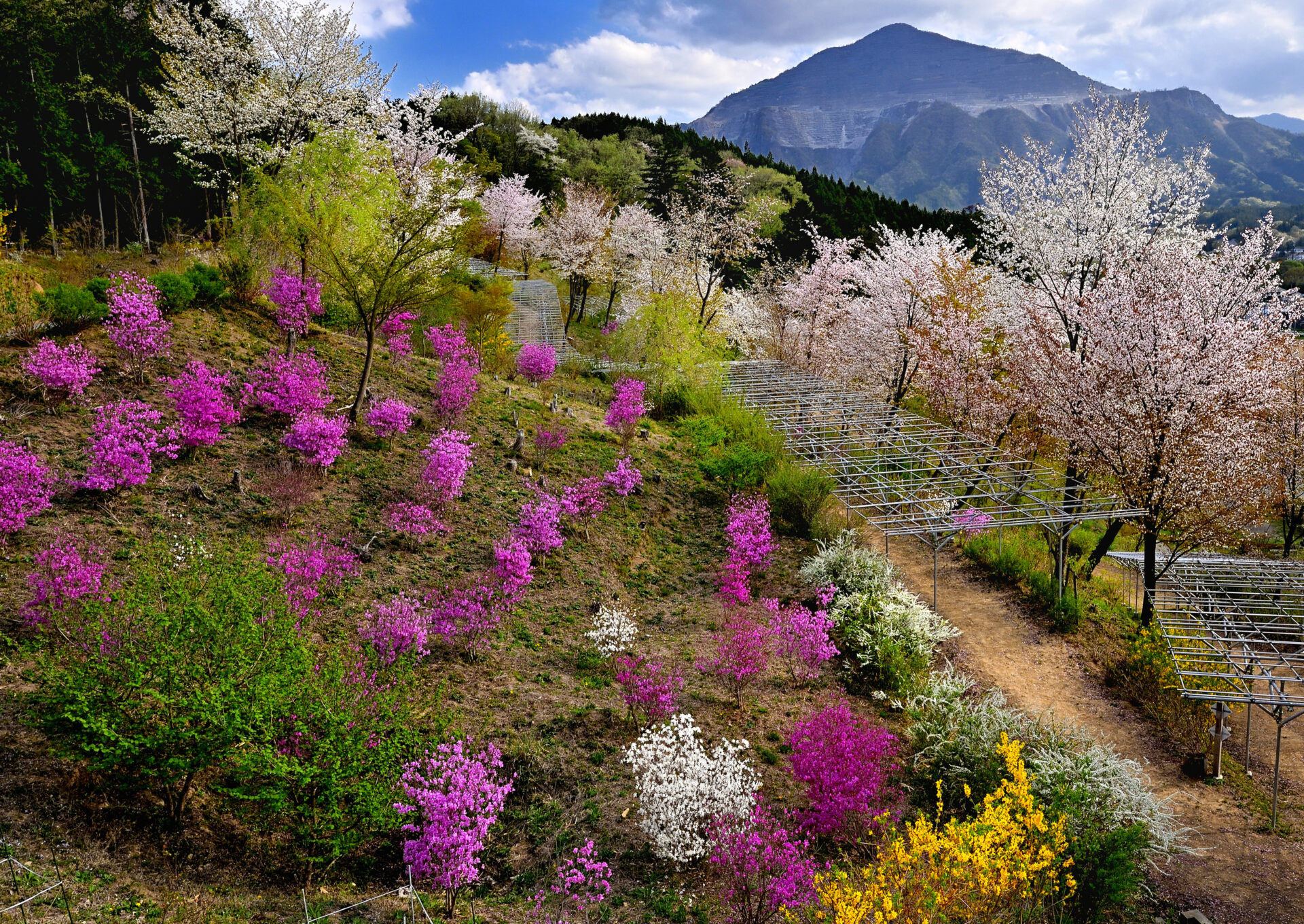 もみじ、ツツジ、藤、ヤマザクラ、アジサイ、ウツギ、オオデマリ、コデマリ、ユキヤナギ、レンギョウなどをこれまでに延べ7,000本以上植えています