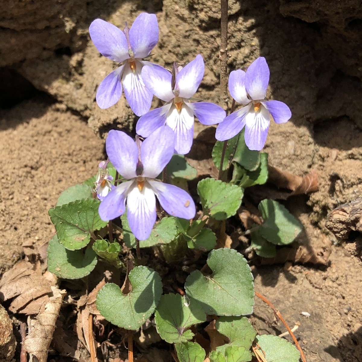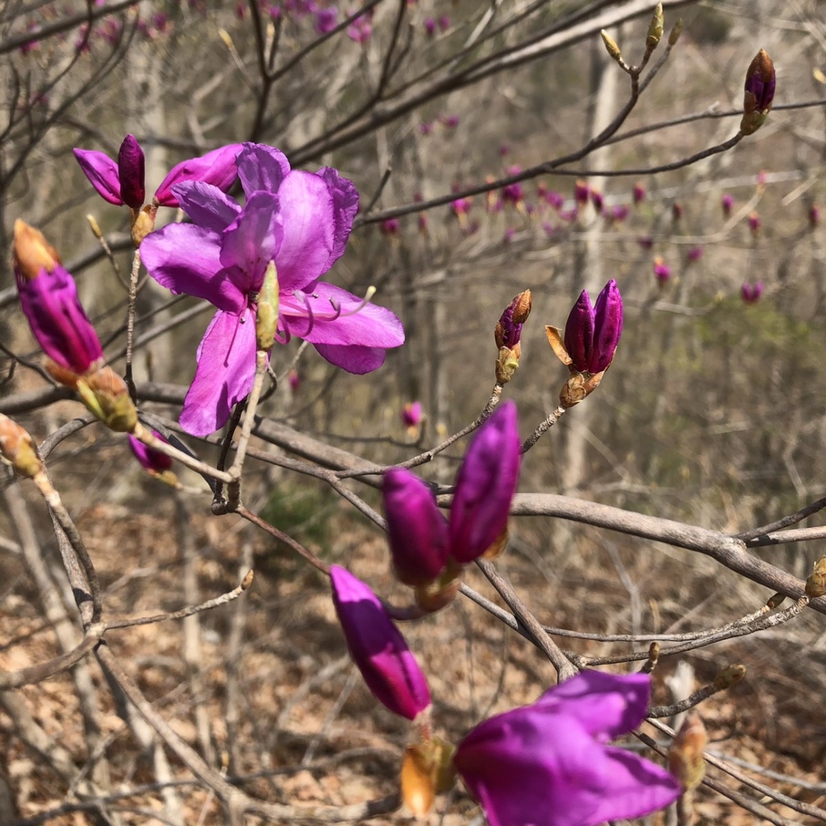 山の花道から日向山へ登る途中にも、すみれや桜が咲いており、新芽が芽吹く木々もありました。