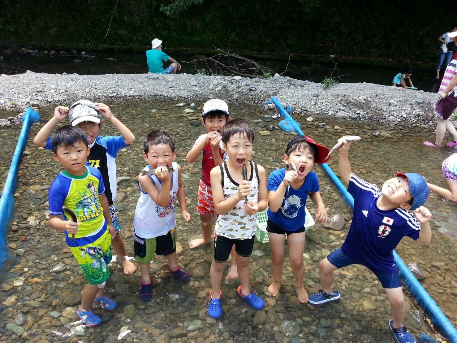 自然の川でニジマスをつかまえて、その後炭火で焼いてお召しあがりいただけます。富士山溶岩バーベキューでお腹いっぱいになった後は、昆虫採取に竹とんぼ作りを体験します。
