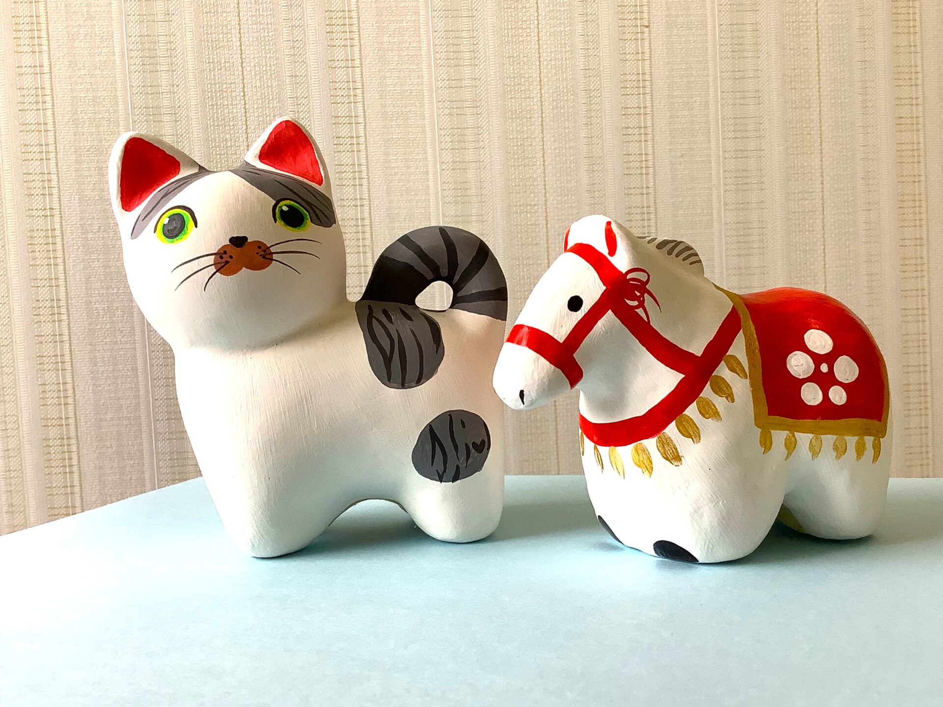 猫の張子、来年度の干支張子(馬)のどちらかお好きな張子を選んでもらい、自由な発想で絵付けを体験ができます。